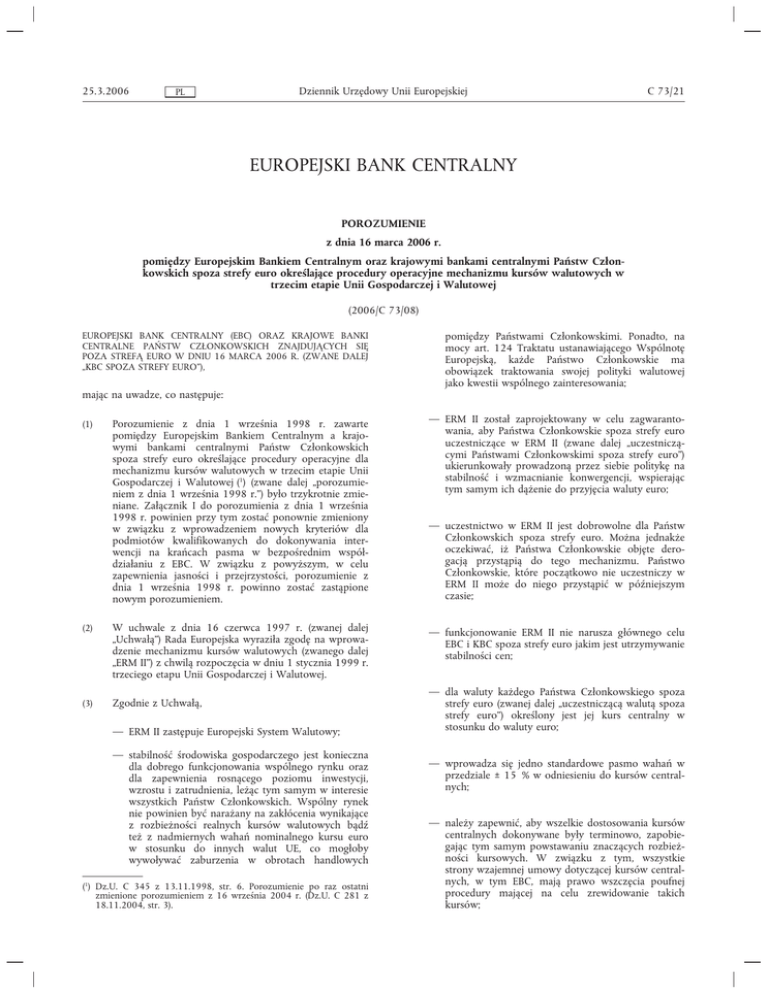 25.3.2006 PL Dziennik Urzędowy Unii Europejskiej C 73/21 EUROPEJSKI BANK CENTRALNY POROZUMIENIE z dnia 16 marca 2006 r. pomiędzy Europejskim Bankiem Centralnym oraz krajowymi bankami centralnymi Państw Członkowskich spoza strefy euro określające procedury operacyjne mechanizmu kursów walutowych w trzecim etapie Unii Gospodarczej i Walutowej (2006/C 73/08) EUROPEJSKI BANK CENTRALNY (EBC) ORAZ KRAJOWE BANKI CENTRALNE PAŃSTW CZŁONKOWSKICH ZNAJDUJĄCYCH SIĘ POZA STREFĄ EURO W DNIU 16 MARCA 2006 R. (ZWANE DALEJ „KBC SPOZA STREFY EURO”), pomiędzy Państwami Członkowskimi. Ponadto, na mocy art. 124 Traktatu ustanawiającego Wspólnotę Europejską, każde Państwo Członkowskie ma obowiązek traktowania swojej polityki walutowej jako kwestii wspólnego zainteresowania; mając na uwadze, co następuje: (1) Porozumienie z dnia 1 września 1998 r. zawarte pomiędzy Europejskim Bankiem Centralnym a krajowymi bankami centralnymi Państw Członkowskich spoza strefy euro określające procedury operacyjne dla mechanizmu kursów walutowych w trzecim etapie Unii Gospodarczej i Walutowej (1) (zwane dalej „porozumieniem z dnia 1 września 1998 r.”) było trzykrotnie zmieniane. Załącznik I do porozumienia z dnia 1 września 1998 r. powinien przy tym zostać ponownie zmieniony w związku z wprowadzeniem nowych kryteriów dla podmiotów kwalifikowanych do dokonywania interwencji na krańcach pasma w bezpośrednim współdziałaniu z EBC. W związku z powyższym, w celu zapewnienia jasności i przejrzystości, porozumienie z dnia 1 września 1998 r. powinno zostać zastąpione nowym porozumieniem. (2) W uchwale z dnia 16 czerwca 1997 r. (zwanej dalej „Uchwałą”) Rada Europejska wyraziła zgodę na wprowadzenie mechanizmu kursów walutowych (zwanego dalej „ERM II”) z chwilą rozpoczęcia w dniu 1 stycznia 1999 r. trzeciego etapu Unii Gospodarczej i Walutowej. (3) Zgodnie z Uchwałą, — ERM II zastępuje Europejski System Walutowy; — stabilność środowiska gospodarczego jest konieczna dla dobrego funkcjonowania wspólnego rynku oraz dla zapewnienia rosnącego poziomu inwestycji, wzrostu i zatrudnienia, leżąc tym samym w interesie wszystkich Państw Członkowskich. Wspólny rynek nie powinien być narażany na zakłócenia wynikające z rozbieżności realnych kursów walutowych bądź też z nadmiernych wahań nominalnego kursu euro w stosunku do innych walut UE, co mogłoby wywoływać zaburzenia w obrotach handlowych (1) Dz.U. C 345 z 13.11.1998, str. 6. Porozumienie po raz ostatni zmienione porozumieniem z 16 września 2004 r. (Dz.U. C 281 z 18.11.2004, str. 3). — ERM II został zaprojektowany w celu zagwarantowania, aby Państwa Członkowskie spoza strefy euro uczestniczące w ERM II (zwane dalej „uczestniczącymi Państwami Członkowskimi spoza strefy euro”) ukierunkowały prowadzoną przez siebie politykę na stabilność i wzmacnianie konwergencji, wspierając tym samym ich dążenie do przyjęcia waluty euro; — uczestnictwo w ERM II jest dobrowolne dla Państw Członkowskich spoza strefy euro. Można jednakże oczekiwać, iż Państwa Członkowskie objęte derogacją przystąpią do tego mechanizmu. Państwo Członkowskie, które początkowo nie uczestniczy w ERM II może do niego przystąpić w późniejszym czasie; — funkcjonowanie ERM II nie narusza głównego celu EBC i KBC spoza strefy euro jakim jest utrzymywanie stabilności cen; — dla waluty każdego Państwa Członkowskiego spoza strefy euro (zwanej dalej „uczestniczącą walutą spoza strefy euro”) określony jest jej kurs centralny w stosunku do waluty euro; — wprowadza się jedno standardowe pasmo wahań w przedziale ± 15 % w odniesieniu do kursów centralnych; — należy zapewnić, aby wszelkie dostosowania kursów centralnych dokonywane były terminowo, zapobiegając tym samym powstawaniu znaczących rozbieżności kursowych. W związku z tym, wszystkie strony wzajemnej umowy dotyczącej kursów centralnych, w tym EBC, mają prawo wszczęcia poufnej procedury mającej na celu zrewidowanie takich kursów; C 73/22 Dziennik Urzędowy Unii Europejskiej PL — interwencja na krańcach pasma powinna, co do zasady, być automatyczna i nieograniczona, przy jednoczesnej możliwości skorzystania z bardzo krótkookresowego finansowania. Jednakże EBC i KBC spoza strefy euro uczestniczące w ERM II (zwane dalej „uczestniczącymi KBC spoza strefy euro”) mogą wstrzymać interwencję, jeżeli jej przeprowadzenie pozostawałoby w konflikcie z ich podstawowym celem utrzymywania stabilności cen. Podejmując taką decyzję należycie uwzględnią one wszelkie istotne czynniki, a w szczególności potrzebę utrzymania stabilnego i wiarygodnego funkcjonowania ERM II; — współpraca w zakresie polityki kursowej może być dalej wzmacniana, na przykład poprzez dopuszczenie bliższych powiązań kursowych pomiędzy walutą euro a uczestniczącymi walutami spoza strefy euro, o ile — i w zakresie w jakim — byłoby to pożądane ze względu na zapewnienie postępów konwergencji. (4) Interwencje powinny być używane jako instrument wspierający, w połączeniu z innymi środkami polityki finansowej, takimi jak odpowiednie środki polityki pieniężnej i fiskalnej, przyczyniające się do konwergencji gospodarczej oraz stabilności kursów walutowych. Istnieje przy tym możliwość skoordynowanej interwencji wewnątrz pasma, przeprowadzanej na podstawie wzajemnego porozumienia pomiędzy EBC a odpowiednim uczestniczącym KBC spoza strefy euro, równolegle do innych odpowiednich środków zaradczych stosowanych przez taki KBC, w tym elastycznego wykorzystania stóp procentowych. 1.2. 25.3.2006 Zgodnie z pasmami wahań ustalonymi na podstawie ustępów 2.1, 2.3 oraz 2.4 Uchwały, EBC oraz każdy uczestniczący KBC spoza strefy euro ustanowi, za wspólną zgodą, dwustronne górne oraz dolne kursy wymiany pomiędzy walutą euro oraz uczestniczącymi walutami spoza strefy euro, mające zastosowanie