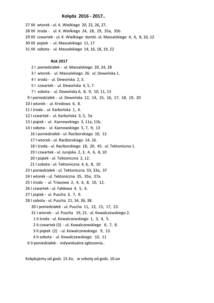 Kolęda 2016 - 2017.. 27 XII 28 XII 29 XII 30 XII 31 XII wtorek - ul. K. Wielkiego 20, 22, 26, 27, środa - ul. K. Wielkiego 24, 28, 29, 35a, 35b czwartek - ul. K. Wielkiego domki. ul. Massalskiego 4, 6, 8, 10, 12 piątek - ul. Massalskiego 11, 17 sobota - ul. Massalskiego 14, 16, 18, 19, 22 Rok 2017 2 I poniedziałek - ul. Massalskiego 20, 24, 28 3 I wtorek - ul. Massalskiego 26. ul. Dewońska 1. 4 I środa - ul. Dewońska 2, 3. 5 I czwartek - ul. Dewońska 4, 5, 7. 7 I sobota - ul. Dewońska 6, 8, 9, 10, 11, 13 9 I poniedziałek - ul. Dewońska 12, 14, 15, 16, 17, 18, 19, 20 10 I wtorek - ul. Kredowa 6, 8. 11 I środa - ul. Karbońska 1, 4. 12 I czwartek - ul. Karbońska 3, 5, 5a 13 I piątek - ul. Kaznowskiego 3, 11a, 11b. 14 I sobota - ul. Kaznowskiego 5, 7, 9, 13 16 I poniedziałek - ul. Raciborskiego 10, 12. 17 I wtorek - ul. Raciborskiego 14, 16. 18 I środa - ul. Raciborskiego 18, 20, 45. ul. Tektoniczna 1. 19 I czwartek - ul. Jurajska 2, 3, 4, 6, 8, 10 20 I piątek - ul. Tektoniczna 2, 12. 21 I sobota - ul. Tektoniczna 4, 6, 8, 10 23 I poniedziałek - ul. Tektoniczna 33, 33a, 37 24 I wtorek - ul. Tektoniczna 35, 35a, 37a. 25 I środa - ul. Triasowa 2, 4, 6, 8, 10, 12. 26 I czwartek - ul. Fałdowa 4, 5, 6. 27 I piątek - ul. Puscha 3, 7, 9. 28 I sobota - ul. Puscha 21, 34, 36, 38. 30 I poniedziałek - ul. Puscha 11, 13, 15, 17, 23. 31 I wtorek - ul. Puscha 19, 21. ul. Kowalczewskiego 2. 1 II środa - ul. Kowalczewskiego 1, 3, 4, 5. 2 II czwartek (3) - ul. Kowalczewskiego 6, 7, 8. 3 II piątek (2) - ul. Kowalczewskiego 9, 13. 4 II sobota - ul. Kowalczewskiego 10, 11 6 II poniedziałek - indywidualne zgłoszenia.. Kolędujemy od godz. 15.3o, w sobotę od godz. 10.oo