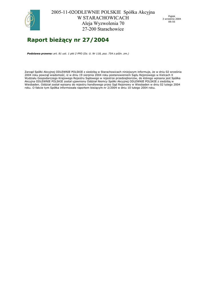 2005-11-02ODLEWNIE POLSKIE Spółka Akcyjna W STARACHOWICACH Aleja Wyzwolenia 70 27-200 Starachowice Piątek 3 września 2004 09:55 Raport bieŜący nr 27/2004 Podstawa prawna: art. 81 ust. 1 pkt 2 PPO (Dz. U. Nr 118, poz. 754 z późn. zm.) Zarząd Spółki Akcyjnej ODLEWNIE POLSKIE z siedzibą w Starachowicach niniejszym informuje, Ŝe w dniu 02 września 2004 roku powziął wiadomość, iŜ w dniu 19 sierpnia 2004 roku postanowieniem Sądu Rejonowego w Kielcach X Wydziału Gospodarczego Krajowego Rejestru Sądowego w rejestrze przedsiębiorców, do którego wpisana jest Spółka Akcyjna ODLEWNIE POLSKIE został ujawniony Oddział Niemcy Spółki Akcyjnej ODLEWNIE POLSKIE z siedzibą w Wiesbaden. Oddział został wpisany do rejestru handlowego przez Sąd Rejonowy w Wiesbaden w dniu 02 lutego 2004 roku. O fakcie tym Spółka informowała raportem bieŜącym nr 2/2004 w dniu 10 lutego 2004 roku.