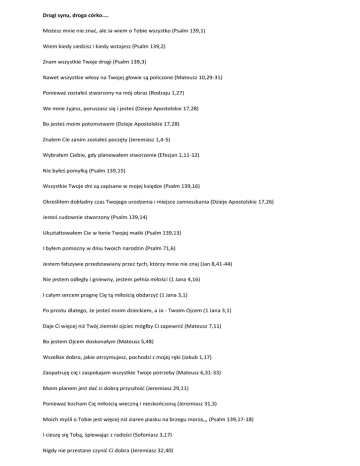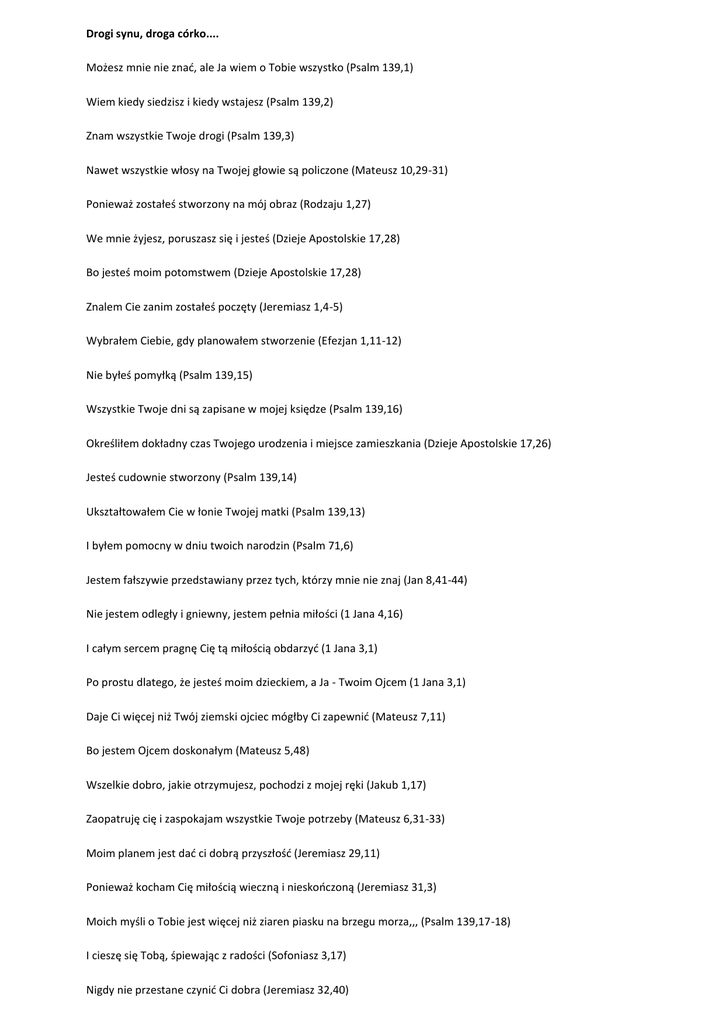 Drogi synu, droga córko.... Możesz mnie nie znać, ale Ja wiem o Tobie wszystko (Psalm 139,1) Wiem kiedy siedzisz i kiedy wstajesz (Psalm 139,2) Znam wszystkie Twoje drogi (Psalm 139,3) Nawet wszystkie włosy na Twojej głowie są policzone (Mateusz 10,29-31) Ponieważ zostałeś stworzony na mój obraz (Rodzaju 1,27) We mnie żyjesz, poruszasz się i jesteś (Dzieje Apostolskie 17,28) Bo jesteś moim potomstwem (Dzieje Apostolskie 17,28) Znalem Cie zanim zostałeś poczęty (Jeremiasz 1,4-5) Wybrałem Ciebie, gdy planowałem stworzenie (Efezjan 1,11-12) Nie byłeś pomyłką (Psalm 139,15) Wszystkie Twoje dni są zapisane w mojej księdze (Psalm 139,16) Określiłem dokładny czas Twojego urodzenia i miejsce zamieszkania (Dzieje Apostolskie 17,26) Jesteś cudownie stworzony (Psalm 139,14) Ukształtowałem Cie w łonie Twojej matki (Psalm 139,13) I byłem pomocny w dniu twoich narodzin (Psalm 71,6) Jestem fałszywie przedstawiany przez tych, którzy mnie nie znaj (Jan 8,41-44) Nie jestem odległy i gniewny, jestem pełnia miłości (1 Jana 4,16) I całym sercem pragnę Cię tą miłością obdarzyć (1 Jana 3,1) Po prostu dlatego, że jesteś moim dzieckiem, a Ja - Twoim Ojcem (1 Jana 3,1) Daje Ci więcej niż Twój ziemski ojciec mógłby Ci zapewnić (Mateusz 7,11) Bo jestem Ojcem doskonałym (Mateusz 5,48) Wszelkie dobro, jakie otrzymujesz, pochodzi z mojej ręki (Jakub 1,17) Zaopatruję cię i zaspokajam wszystkie Twoje potrzeby (Mateusz 6,31-33) Moim planem jest dać ci dobrą przyszłość (Jeremiasz 29,11) Ponieważ kocham Cię miłością wieczną i nieskończoną (Jeremiasz 31,3) Moich myśli o Tobie jest więcej niż ziaren piasku na brzegu morza,,, (Psalm 139,17-18) I cieszę się Tobą, śpiewając z radości (Sofoniasz 3,17) Nigdy nie przestane czynić Ci dobra (Jeremiasz 32,40) Gdyż jesteś moja drogocenną własnością (Wyjścia 19,5) Z całego serca i z całej duszy chcę, byś mieszkał bezpiecznie (Jeremiasz 32,41) I pokazać Ci rzeczy wielkie i wspaniale (Jeremiasz 33,3) Jeśli będziesz mnie szukał z całego serca, znajdziesz mnie (Powtórzonego Prawa 4,29) Rozkoszuj się mną, a dam Ci to, czego pragnie Twoje serce (Psalm 37,4) Bo to Ja daje Ci takie pragnienia (Filipian 2,13) Jestem w stanie dać ci o wiele więcej, niż możesz sobie wyobrazić (Efezjan 3,20) To we mnie znajdziesz największe wsparcie i zachętę (2 Tesaloniczan 2,16-17) Jestem tez Ojcem, który pociesza Cię we wszelkich twoich smutkach (2 Koryntian 1,3-4) Kiedy jesteś załamany, jestem blisko Ciebie (Psalm 34,18) Tak jak pasterz niosący owieczkę, trzymam Cie blisko mojego serca (Izajasz 40,11) Pewnego dnia otrę wszystkie łzy z Twoich oczu (Objawienie 21,3-4) I uwolnię od wszelkiego bólu, który znosiłeś na ziemi (Objawienie 21,3-4) Jestem Twoim Ojcem i kocham Cię dokładnie tak, jak kocham mojego syna, Jezusa (Jan 17,23) Bo w Jezusie objawiłem moją miłość do Ciebie (Jan 17,26) On jest wiernym odbiciem mnie samego (Hebrajczyków 1,3) Przyszedł by udowodnić, że jestem z Tobą, nie przeciwko Tobie (Rzymian 8,31) By powiedzieć Ci, że nie liczę Twoich grzechów (2 Koryntian 5;18-19) Jezus umarł żebyśmy - Ty i ja - mogli zostać pojednani (2 Koryntian 5,18-19) Jego śmierć była najwyższym wyrazem mojej miłości do Ciebie (1 Jana 4,10) Oddałem wszystko co kochałem, by zdobyć Twoją miłość (Rzymian 8,31-32) Jeśli przyjmiesz dar mojego syna Jezusa, przyjmiesz mnie samego (1 Jan 2,23) I nic już nigdy nie oddzieli Cie od mojej miłości (Rz 8,38-39) Przyjdź do mnie, a wyprawię największą ucztę, jaka niebo kiedykolwiek widziało (Łk 15,7) Zawsze byłem Ojcem i zawsze Nim będę (Ef 3,14-15) Ale czy Ty... "chcesz być moim dzieckiem?" (Jan 1,12-13) Czekam na Ciebie (Łk 15,11-32) Kocham Cie, Twój Tatuś, Bóg Wszechmogący