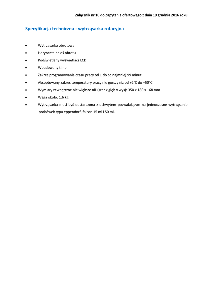 Załącznik nr 10 do Zapytania ofertowego z dnia 19 grudnia 2016 roku Specyfikacja techniczna - wytrząsarka rotacyjna Wytrząsarka obrotowa Horyzontalna oś obrotu Podświetlany wyświetlacz LCD Wbudowany timer Zakres programowania czasu pracy od 1 do co najmniej 99 minut Akceptowany zakres temperatury pracy nie gorszy niż od +2°C do +50°C Wymiary zewnętrzne nie większe niż (szer x głęb x wys): 350 x 180 x 168 mm Waga około: 1.6 kg Wytrząsarka musi być dostarczona z uchwytem pozwalającym na jednoczesne wytrząsanie probówek typu eppendorf, falcon 15 ml i 50 ml.