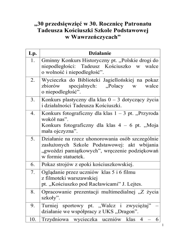 ,,30 przedsięwzięć w 30. Rocznicę Patronatu Tadeusza Kościuszki Szkole Podstawowej w Wawrzeńczycach” Lp. Działanie 1. Gminny Konkurs Historyczny pt. ,,Polskie drogi do niepodległości: Tadeusz Kościuszko w walce o wolność i niepodległość”. 2. Wycieczka do Biblioteki Jagiellońskiej na pokaz zbiorów specjalnych: „Polacy w walce o niepodległość”. 3. Konkurs plastyczny dla klas 0 – 3 dotyczący życia i działalności Tadeusza Kościuszki. 4. Konkurs fotograficzny dla klas 1 – 3 pt. ,,Przyroda wokół nas”. Konkurs fotograficzny dla klas 4 – 6 pt. ,,Moja mała ojczyzna”. 5. Działanie na rzecz uhonorowania osób szczególnie zasłużonych Szkole Podstawowej: akt wbijania „gwoździ pamiątkowych”, wręczenie podziękowań w formie statuetek. 6. Pokaz strojów z epoki kościuszkowskiej. 7. Oglądanie przez uczniów klas 5 i 6 filmu z filmoteki warszawskiej pt. ,,Kościuszko pod Racławicami” J. Lejtes. 8. Opracowanie prezentacji multimedialnej „Z życia szkoły”. 9. Turniej sportowy pt. ,,Walcz i zwyciężaj” – działanie we współpracy z UKS ,,Dragon”. 10. Trzydniowa wycieczka uczniów klas 4 – 6 1 i nauczycieli do Wrocławia w celu obejrzenia Panoramy Racławickiej. 11. Wycieczka uczniów klas 0 – 2 do Krakowa – Kopiec Kościuszki, Rynek, Muzeum w Sukiennicach. 12. Wycieczka uczniów klas 3 do Racławic. 13. Wydanie „Kalendarza szkolnego” pt. 30. lat patronatu Tadeusza Kościuszki Szkole Podstawowej w Wawrzeńczycach. 14. Wywiady z osobami zasłużonymi dla szkoły, byłymi dyrektorami i pracownikami. Opracowanie publikacji na podstawie zdobytych informacji. 15. Działanie plastyczne w klasach 4 – ceramika z uwzględnieniem postaci Kościuszki. 16. Gra terenowa z udziałem rodziców i uczniów pt. ,,Śladami historii w naszej gminie”. 17. Wydanie specjalne gazetki szkolnej „Szkolna dyskietka Tereski i Fredka” z okazji 30. rocznicy patronatu Tadeusza Kościuszki Szkole Podstawowej. 18. Gazetka okolicznościowa na korytarzu szkolnym. 19. Konkurs wiedzy na temat życia i działalności Tadeusza Kościuszki dla klas 1 – 3 zorganizowany przez bibliotekę szkolną i bibliotekę publiczną. 20. Wystawa pozycji książkowych i broszur dotyczących Tadeusza Kościuszki w bibliotece szkolnej. 21. Zasadzenie kwiatów - symbol rocznicy na terenie zielonym – działanie we współpracy z rodzicami. 2 22. Zasadzenie drzewa pamiątkowego w dniu rocznicy. 23. Zakup komiksu "Kościuszko w Krakowie – 1794". 24. Prace plastyczne poświęcone patronowi – wystawa na korytarzach szkolnych. 25. Prezentacje multimedialne przygotowane przez uczniów: ,,Miejsca na świecie związane z Tadeuszem Kościuszką”. 26. Lekcja historii w klasach 4: „Lekcja z muzyką – Krakowiak Kościuszki i inne utwory niepodległościowe tej epoki”. Lekcja historii w klasie 5 poświęcona Powstaniu Kościuszki. 27. Konkurs literacki dla klas 4 – 6 pt. ,,List do Tadeusza Kościuszki” – opracowanie publikacji. 28. ,,Tygodniowa lekcja patriotyzmu wokół Patrona szkoły Tadeusza Kościuszki” w dniach 25 – 29 maj 2015. 29. Nauka Krakowiaka - tańca regionalnego przez instruktora tańca. 30. Przygotowanie albumu dokumentującego działania związane z 30. rocznicą patronatu Tadeusza Kościuszki Szkole Podstawowej. Nagrody dla uczniów ufundowali: Wójt Gminy Igołomia – Wawrzeńczyce, Wydawnictwo Znak Kraków, Uczniowski Klub Sportowy, Firma fotograficzna FPS Kraków, Komitet Społeczny Pomocy Szkole. 3