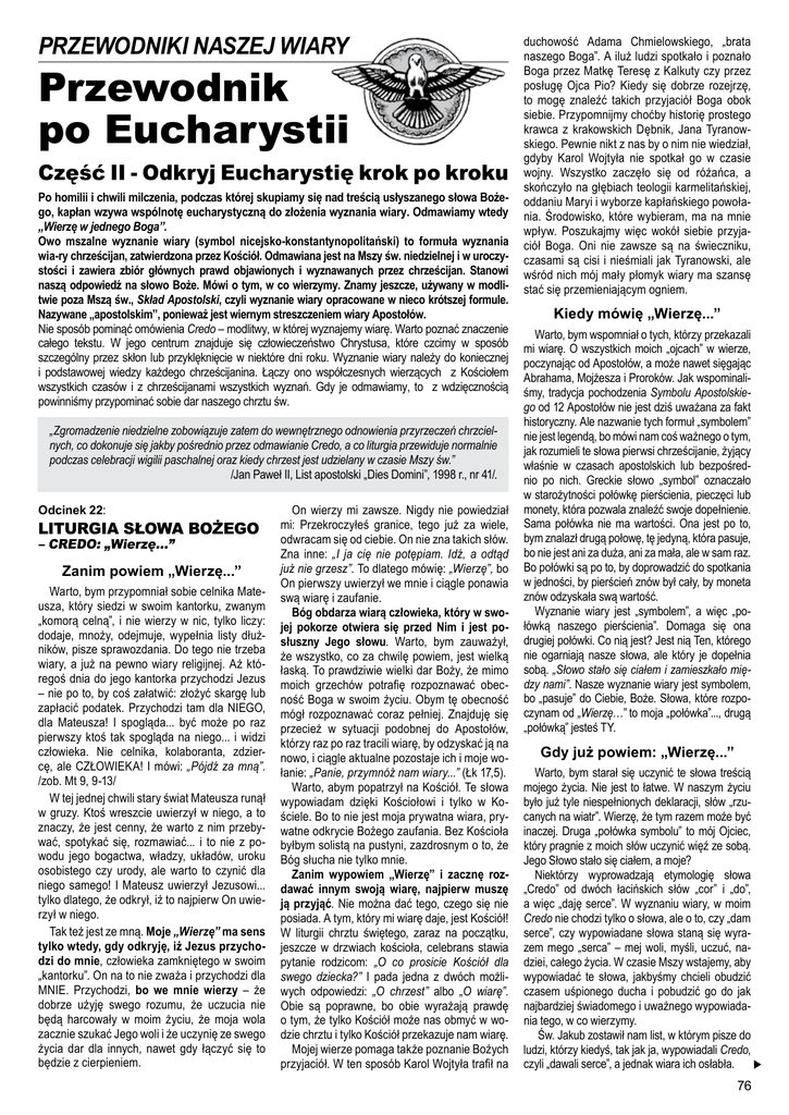 PRZEWODNIKI NASZEJ WIARY Przewodnik po Eucharystii Część II - Odkryj Eucharystię krok po kroku Po homilii i chwili milczenia, podczas której skupiamy się nad treścią usłyszanego słowa Bożego, kapłan wzywa wspólnotę eucharystyczną do złożenia wyznania wiary. Odmawiamy wtedy „Wierzę w jednego Boga”. Owo mszalne wyznanie wiary (symbol nicejsko-konstantynopolitański) to formuła wyznania wia-ry chrześcijan, zatwierdzona przez Kościół. Odmawiana jest na Mszy św. niedzielnej i w uroczystości i zawiera zbiór głównych prawd objawionych i wyznawanych przez chrześcijan. Stanowi naszą odpowiedź na słowo Boże. Mówi o tym, w co wierzymy. Znamy jeszcze, używany w modlitwie poza Mszą św., Skład Apostolski, czyli wyznanie wiary opracowane w nieco krótszej formule. Nazywane „apostolskim”, ponieważ jest wiernym streszczeniem wiary Apostołów. Nie sposób pominąć omówienia Credo – modlitwy, w której wyznajemy wiarę. Warto poznać znaczenie całego tekstu. W jego centrum znajduje się człowieczeństwo Chrystusa, które czcimy w sposób szczególny przez skłon lub przyklęknięcie w niektóre dni roku. Wyznanie wiary należy do koniecznej i podstawowej wiedzy każdego chrześcijanina. Łączy ono współczesnych wierzących z Kościołem wszystkich czasów i z chrześcijanami wszystkich wyznań. Gdy je odmawiamy, to z wdzięcznością powinniśmy przypominać sobie dar naszego chrztu św. „Zgromadzenie niedzielne zobowiązuje zatem do wewnętrznego odnowienia przyrzeczeń chrzcielnych, co dokonuje się jakby pośrednio przez odmawianie Credo, a co liturgia przewiduje normalnie podczas celebracji wigilii paschalnej oraz kiedy chrzest jest udzielany w czasie Mszy św.” /Jan Paweł II, List apostolski „Dies Domini”, 1998 r., nr 41/. Odcinek 22: LITURGIA SŁOWA BOŻEGO – CREDO: „Wierzę…” Zanim powiem „Wierzę...” Warto, bym przypomniał sobie celnika Mateusza, który siedzi w swoim kantorku, zwanym „komorą celną”, i nie wierzy w nic, tylko liczy: dodaje, mnoży, odejmuje, wypełnia listy dłużników, pisze sprawozdania. Do tego nie trzeba wiary, a już na pewno wiary religijnej. Aż któregoś dnia do jego kantorka przychodzi Jezus – nie po to, by coś załatwić: złożyć skargę lub zapłacić podatek. Przychodzi tam dla NIEGO, dla Mateusza! I spogląda... być może po raz pierwszy ktoś tak spogląda na niego... i widzi człowieka. Nie celnika, kolaboranta, zdziercę, ale CZŁOWIEKA! I mówi: „Pójdź za mną”. /zob. Mt 9, 9-13/ W tej jednej chwili stary świat Mateusza runął w gruzy. Ktoś wreszcie uwierzył w niego, a to znaczy, że jest cenny, że warto z nim przebywać, spotykać się, rozmawiać... i to nie z powodu jego bogactwa, władzy, układów, uroku osobistego czy urody, ale warto to czynić dla niego samego! I Mateusz uwierzył Jezusowi... tylko dlatego, że odkrył, iż to najpierw On uwierzył w niego. Tak też jest ze mną. Moje „Wierzę” ma sens tylko wtedy, gdy odkryję, iż Jezus przychodzi do mnie, człowieka zamkniętego w swoim „kantorku”. On na to nie zważa i przychodzi dla MNIE. Przychodzi, bo we mnie wierzy – że dobrze użyję swego rozumu, że uczucia nie będą harcowały w moim życiu, że moja wola zacznie szukać Jego woli i że uczynię ze swego życia dar dla innych, nawet gdy łączyć się to będzie z cierpieniem. On wierzy mi zawsze. Nigdy nie powiedział mi: Przekroczyłeś granice, tego już za wiele, odwracam się od ciebie. On nie zna takich słów. Zna inne: „I ja cię nie potępiam. Idź, a odtąd już nie grzesz”. To dlatego mówię: „Wierzę”, bo On pierwszy uwierzył we mnie i ciągle ponawia swą wiarę i zaufanie. Bóg obdarza wiarą człowieka, który w swojej pokorze otwiera się przed Nim i jest posłuszny Jego słowu. Warto, bym zauważył, że wszystko, co za chwilę powiem, jest wielką łaską. To prawdziwie wielki dar Boży, że mimo moich grzechów potrafię rozpoznawać obecność Boga w swoim życiu. Obym tę obecność mógł rozpoznawać coraz pełniej. Znajduję się przecież w sytuacji podobnej do Apostołów, którzy raz po raz tracili wiarę, by odzyskać ją na nowo, i ciągle aktualne pozostaje ich i moje wołanie: „Panie, przymnóż nam wiary...” (Łk 17,5). Warto, abym popatrzył na Kościół. Te słowa wypowiadam dzięki Kościołowi i tylko w Kościele. Bo to nie jest moja prywatna wiara, prywatne odkrycie Bożego zaufania. Bez Kościoła byłbym solistą na pustyni, zazdrosnym o to, że Bóg słucha nie tylko mnie. Zanim wypowiem „Wierzę” i zacznę rozdawać innym swoją wiarę, najpierw muszę ją przyjąć. Nie można dać tego, czego się nie posiada. A tym, który mi wiarę daje, jest Kościół! W liturgii chrztu świętego, zaraz na początku, jeszcze w drzwiach kościoła, celebrans stawia pytanie rodzicom: „O co prosicie Kościół dla swego dziecka?” I pada jedna z dwóch możliwych odpowiedzi: „O chrzest” albo „O wiarę”. Obie są poprawne, bo obie wyrażają prawdę o tym, że tylko Kościół może nas obmyć w wodzie chrztu i tylko Kościół przekazuje nam wiarę. Mojej wierze pomaga także poznanie Bożych przyjaciół. W ten sposób Karol Wojtyła trafił na duchowość Adama Chmielowskiego, „brata naszego Boga”. A iluż ludzi spotkało i poznało Boga przez Matkę Teresę z Kalkuty czy przez posługę Ojca Pio? Kiedy się dobrze rozejrzę, to mogę znaleźć takich przyjaciół Boga obok siebie. Przypomnijmy choćby historię prostego krawca z krakowskich Dębnik, Jana Tyranowskiego. Pewnie nikt z nas by o nim nie wiedział, gdyby Karol Wojtyła nie spotkał go w czasie wojny. Wszystko zaczęło się od różańca, a skończyło na głębiach teologii karmelitańskiej, oddaniu Maryi i wyborze kapłańskiego powołania. Środowisko, które wybieram, ma na mnie wpływ. Poszukajmy więc wokół siebie przyjaciół Boga. Oni nie zawsze są na świeczniku, czasami są cisi i nieśmiali j