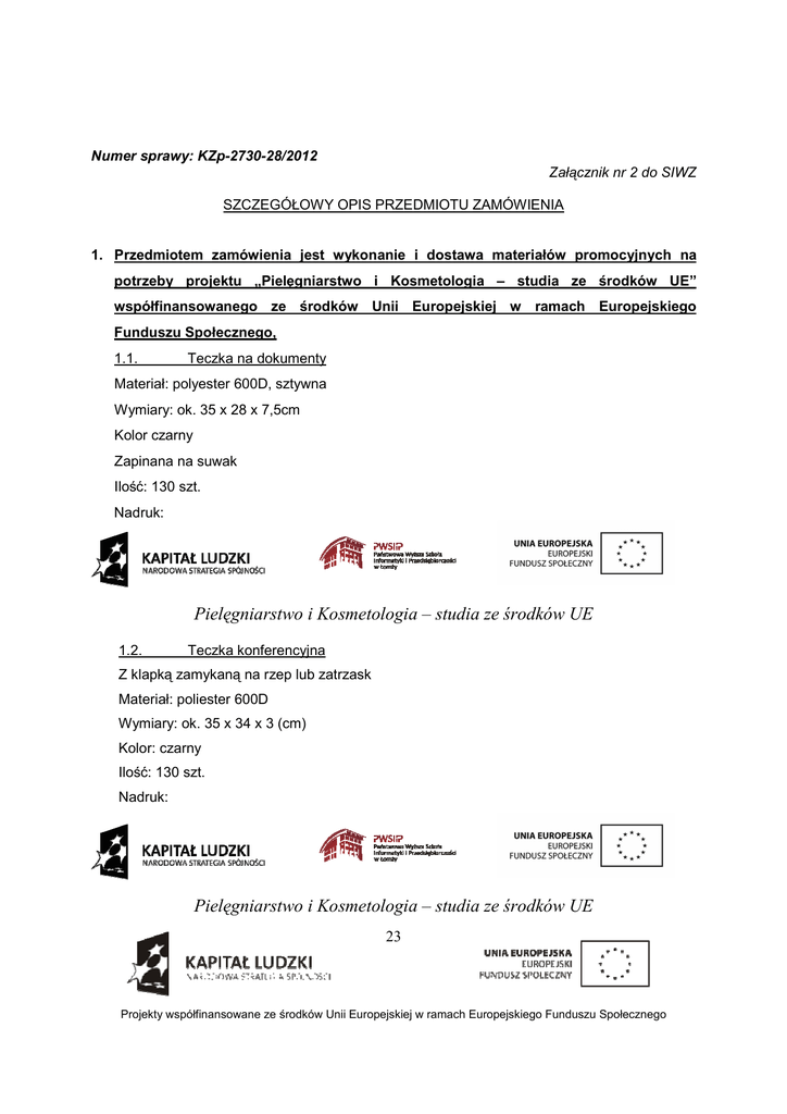 Numer sprawy: KZp-2730-28/2012 Załącznik nr 2 do SIWZ SZCZEGÓŁOWY OPIS PRZEDMIOTU ZAMÓWIENIA 1. Przedmiotem zamówienia jest wykonanie i dostawa materiałów promocyjnych na potrzeby projektu „Pielęgniarstwo i Kosmetologia – studia ze środków UE” współfinansowanego ze środków Unii Europejskiej w ramach Europejskiego Funduszu Społecznego, 1.1. Teczka na dokumenty Materiał: polyester 600D, sztywna Wymiary: ok. 35 x 28 x 7,5cm Kolor czarny Zapinana na suwak Ilość: 130 szt. Nadruk: Pielęgniarstwo i Kosmetologia – studia ze środków UE 1.2. Teczka konferencyjna Z klapką zamykaną na rzep lub zatrzask Materiał: poliester 600D Wymiary: ok. 35 x 34 x 3 (cm) Kolor: czarny Ilość: 130 szt. Nadruk: Pielęgniarstwo i Kosmetologia – studia ze środków UE 23 Projekty współfinansowane ze środków Unii Europejskiej w ramach Europejskiego Funduszu Społecznego 1.3. Notes bloczek A5 25 kartek czystych, papier offset Okładka: karton 200g, bez koloru Ilość: 130 szt. Nadruk na okładce : Pielęgniarstwo i Kosmetologia – studia ze środków UE Projekt współfinansowany przez Unię Europejską w ramach Europejskiego Funduszu Społecznego 1.4. Pen drive Pojemność: 16GB Obudowa: plastikowo-metalowa, kolor szary System operacyjny: Windows98/NT/ME/2000/XP/VIST Prędkość odczytu: 24 MB/s Prędkość zapisu: 10 MB/s Znakowanie: grawer Zawieszka: łańcuszek Ilość: 130 szt. Nadruk: Pielęgniarstwo i Kosmetologia – studia ze środków UE 1.5. Długopis metalowy Kolor: czerwony Ilość: 200szt Grawer: 2-stronny: Nadruk: 24 Projekty współfinansowane ze środków Unii Europejskiej w ramach Europejskiego Funduszu Społecznego Pielęgniarstwo i Kosmetologia – studia ze środków UE 1.6. Zawieszka z szeklą i metalowym kółkiem Szerokość tasiemki: ok. 20mm Długość tasiemki między szwami: ok. 85mm, Kolor tasiemki: czerwony Wykończenie: szekla, metalowe kółko do kluczy Ilość: 200 szt. Nadruk 2- stronny: Pielęgniarstwo i Kosmetologia – studia ze środków UE UWAGA: Zamawiający wymaga, aby Wykonawca dołączył do oferty fotografie oferowanego asortymentu tj. teczki na dokumenty, teczki konferencyjnej, notesu A5, pen driver, długopisu, zawieszki, w postaci wydruku na papierze bez naniesionego znaku graficznego 25 Projekty współfinansowane ze środków Unii Europejskiej w ramach Europejskiego Funduszu Społecznego