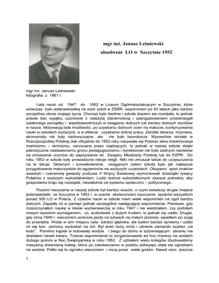 mgr inż. Janusz Leśniewski absolwent LO w Szczytnie 1952 mgr inż. Janusz Leśniewski fotografia z 1961 r. Lata nauki od 1947 do 1952 w Liceum Ogólnokształcącym w Szczytnie, które wówczas było jedenastolatką na wzór szkół w ZSRR, wspominam po 63 latach jako bardzo szczęśliwy okres mojego życia. Chociaż było biednie i szkoła dopiero sie rozwijała, to jednak prawie bez wyjątku uczniowie z należytą starannością i zaangażowaniem przestrzegali ustalonego porządku i współzawodniczyli w osiąganiu dobrych lub bardzo dobrych wyników w nauce. Motywacją była możliwość, po uzyskaniu dobrych ocen na maturze, kontynuowania nauki w szkołach wyższych, a w efekcie uzyskania dobrej pracy. Zarobki lekarza, inżyniera, ekonomisty nie były nadzwyczajne, ale nie było bezrobocia. Wprawdzie istniała w Rzeczpospolitej Polskiej (tak oficjalnie do 1952 roku nazywała się Polska) silna indoktrynacja marksizmu – leninizmu, narzucana przez rządzących, to jednak w naszej szkole dzięki patriotycznie nastawionemu gronu pedagogicznemu i dyrektorowi nie było żadnych nacisków na zmuszanie uczniów do zapisywanie do Związku Młodzieży Polskiej lub do PZPR. Do roku 1953 w szkole były prowadzone rekcje religii. Nikt nie zmuszał także do uczęszczania na te lekcje. Głównym i konsekwentnie osiąganym celem szkoły było jak najlepsze przygotowanie maturzystów do egzaminów na wyższych uczelniach. Okupanci spod znaków swastyki i czerwonej gwiazdy podczas II Wojny Światowej wymordowali dziesiątki tysięcy Polaków z wyższym wykształceniem. Ludzi dobrze wykształconych zawsze potrzeba, aby gospodarka kraju się rozwijała, niezależnie od systemu społeczno – politycznego. Poziom nauczania w naszej szkole był bardzo wysoki, o czym świadczy drugie miejsce jedenastolatki ze Szczytna w 1953 r. w ocenie skuteczności nauczania spośród wszystkich ponad 500 LO w Polsce. Z czasów nauki w szkole mam wiele wspomnień na ogół bardzo dobrych. Zapadły mi w pamięć jednak szczególne następujące wspomnienia. Pierwsze, gdy rozpoczynałem naukę w klasie wyrównawczej w roku 1947 i nie wiedziałem, czy podołam nowym wysokim wymaganiom, co, aczkolwiek z dużym trudem, to jednak się udało. Drugie, gdy zimą 1949 r. wieczorem podczas jazdy na łyżwach na małym jeziorze, wpadłem po szyję do przerębla. Woda w tym miejscu była bardzo głęboka, ale byłem bardzo sprawny i udało mi się bez pomocy wydostać na lód. Był dość duży mróz i ubranie zamarzło szybko „na kość”. Pomimo kąpieli w lodowatej wodzie i biegu do domu w sztywniejącym ubraniu nie dostałem nawet kataru. Trzecie wspomnienie to zorganizowanie ad hoc imprezy na wodach dużego jeziora w Noc Świętojańską w roku 1952. Z udziałem wielu kolegów zbudowaliśmy masywną drewnianą tratwę, która po zakotwiczeniu w pobliżu półwyspu stała sie ogniskiem na wodzie. Paliło się to ognisko wieczorem i nocą przez wiele godzin. Nawet rano jeszcze 1 żarzyły się węgle. O zmroku wszystkie kajaki i dwie żaglówki pływały zadymiając świecami dymnymi obszar nad wodą. Na kajakach i żaglówkach razem z nami pływali zaprzyjaźnieni milicjanci z komendantem posterunku MO w Szczytnie. Byli także z nami pracownicy szkoły MO. Dzięki temu mieliśmy sztuczne ognie z rakietnic milicyjnych. Udało się także wykorzystać w tym celu rakiety i petardy przechowywane nielegalnie przez niektórych kolegów od czasu zakończenia wojny. Obserwatorami tego quasi spektaklu było kilkuset mieszkańców Szczytna, którzy pocztą pantoflową byli informowani wcześniej. Była to na pewno pierwsza impreza z okazji Nocy Świętojańskiej w Szczytnie. Nie mieliśmy żadnych zezwoleń i pozwoleń. Powodem była chyba bardzo mała liczba urzędników administracji publicznej. Jak wynika z danych Głównego Urzędu Statystycznego, było ich w Polsce wtedy około 50 000, czyli 12 razy mniej niż aktualnie zatrudnionych we władzach rządowych i samorządowych. Czwarte wspomnienie to bal maturalny w roku 1952, po uzyskaniu pierwszego miejsca za wyniki w nauce i rozstanie się ze Szkołą i drogimi mi osobami. Naukę w LO rozpoczynałem w wieku niespełna 12 lat i siłą rzeczy dosyć trudno mi było precyzować szczegółowe plany na przyszłość. Wiedziałem jednak, że nauka w LO jest kolejnym etapem życiowej drogi i planowałem już wówczas, o ile się uda, studiować na wyższej uczelni. Było to naturalne, ponieważ moi rodzice byli absolwentami uniwersytetu im. Adama Mickiewicza w Poznaniu, a ojciec był dyrektorem jedenastolatki w Szczytnie. W tamtych warunkach politycznych awans społeczny, niezależny od panującej doktryny politycznej, był możliwy dla Polaków posiadających wysokie kompetencje, czyli wykształcenie, wyszkolenie, doświadczenie i umiejętności. W klasie wyrównawczej byłem skarbnikiem szkolnego sklepiku. Uczyłem się od klasy dziewiątej prywatnie języka angielskiego, gry na fortepianie – ale bez wyników, ukończyłem w 1951 r. kurs żeglarski w Giżycku i byłem w latach 1951 1952 bosmanem w Bazie Żeglarskiej naszej szkoły. Inicjowałem kółka zainteresowań; chemiczne i fizyczne. Bralem udział w inscenizacjach szkolnych i współorganizowałem szkolne zabawy przy gramofonie. Mieliśmy także zajęcia z obrony cywilnej. Nauczyłem się strzelać z krótkiej i długiej broni sportowej. Dla urzeczywistnienia realizacji życiowych planów, najpierw trzeba było uzyskać wyższe wykształcenie zgodne z umiejętnościami. Od dziecka interesowały mnie technika i podróże, więc siłą rzeczy myślałem o pracy na morzu w charterze mechanika lub elektryka na statkach handlowych. Polska miała już niewielką, ale ciągle rozbudowywaną flotę handlową i rybacką, ze statkami budowanymi we własnych stoczniach. Chciałem w ten sposób zwiedzać świat. Przed maturą zmieniłem zdanie i postanowiłem studiować na Wydziale Elektrycznym Politechniki Warszawskiej. Zawsze plany 