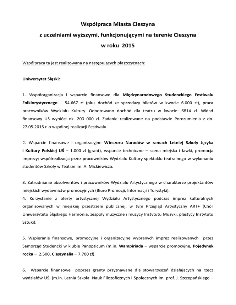 Współpraca Miasta Cieszyna z uczelniami wyższymi, funkcjonującymi na terenie Cieszyna w roku 2015 Współpraca ta jest realizowana na następujących płaszczyznach: Uniwersytet Śląski: 1. Współorganizacja i wsparcie finansowe dla Międzynarodowego Studenckiego Festiwalu Folklorystycznego – 54.667 zł (plus dochód ze sprzedaży biletów w kwocie 6.000 zł), praca pracowników Wydziału Kultury. Odnotowano dochód dla teatru w kwocie: 6814 zł. Wkład finansowy UŚ wyniósł ok. 200 000 zł. Zadanie realizowane na podstawie Porozumienia z dn. 27.05.2015 r. o wspólnej realizacji Festiwalu. 2. Wsparcie finansowe i organizacyjne Wieczoru Narodów w ramach Letniej Szkoły Języka i Kultury Polskiej UŚ – 1.000 zł (grant), wsparcie techniczne – scena miejska i ławki, promocja imprezy; współrealizacja przez pracowników Wydziału Kultury spektaklu teatralnego w wykonaniu studentów Szkoły w Teatrze im. A. Mickiewicza. 3. Zatrudnianie absolwentów i pracowników Wydziału Artystycznego w charakterze projektantów miejskich wydawnictw promocyjnych (Biuro Promocji, Informacji i Turystyki). 4. Korzystanie z oferty artystycznej Wydziału Artystycznego podczas imprez kulturalnych organizowanych w miejskiej przestrzeni publicznej, w tym Przegląd Artystyczny ART+ (Chór Uniwersytetu Śląskiego Harmonia, zespoły muzyczne i muzycy Instytutu Muzyki, plastycy Instytutu Sztuki). 5. Wspieranie finansowe, promocyjne i organizacyjne wybranych imprez realizowanych przez Samorząd Studencki w klubie Panopticum (m.in. Wampiriada – wsparcie promocyjne, Pojedynek rocka – 2.500, Cieszynalia – 7.700 zł). 6. Wsparcie finansowe poprzez granty przyznawane dla stowarzyszeń działających na rzecz wydziałów UŚ. (m.in. Letnia Szkoła Nauk Filozoficznych i Społecznych im. prof. J. Szczepańskiego – 4.000 zł rocznie). 7. Współpraca z Instytutem Sztuki w ramach Festiwalu Europejskich Szkół Artystycznych i Twórczości Kręgi Sztuki. Organizacja wystaw prezentujących dorobek pracowników i studentów UŚ w Cieszynie, Czeskim Cieszynie, Trzyńcu, Katowicach, Warszawie, Łodzi. 8. Udział pedagogów UŚ w radach programowych instytucji kultury oraz jury miejskich konkursów artystycznych. 9. Promowanie uniwersyteckich przedsięwzięć artystycznych w miejskich materiałach promocyjnych. 10. Udział uniwersyteckiego Chóru Harmonia w koncercie z okazji 100 -lecia urodzin Karola Stryji oraz 1 rocznicy śmierci Józefa Świdra (24 maja 2015), a także udział zespołów akademickich w programie Święta Trzech Braci (21 czerwca 2015). 11. Zawarcie w dn. 30.07.2015 r. Porozumienia o Współpracy UŚ z Gminą Cieszyn. Strony wyraziły w nim wolę współpracy w obszarach: a) realizacja wspólnych projektów edukacyjnych oraz badawczych o zasięgu regionalnym, ponadregionalnym i międzynarodowym; b) włączenie się Uczelni w projekty kulturalne Miasta; c) współpraca w zakresie organizacji inicjatyw prezentujących Miasto Cieszyn jako miasto akademickie; d) współpraca w zakresie wsparcia wysiłków Miasta w przywrócenie bezpośrednich połączeń kolejowych z Bielskiem – Białą; e) współpraca w zakresie organizacji i promocji wydarzeń skierowanych do środowiska akademickiego Uczelni oraz mieszkańców Miasta; f) promowanie idei przedsiębiorczości w środowisku akademickim Uczelni, w tym wspieranie projektów studentów Uczelni; g) organizacja praktyk studenckich dla studentów studiów stacjonarnych i niestacjonarnych Uczelni; h) organizacja staży dla najlepszych studentów i absolwentów uczelni; i) promowanie przez Strony idei transferu wiedzy do środowiska gospodarczego. 12. Planowana wspólna organizacja I Międzynarodowego Festiwalu im. Józefa Świdra (listopad 2015) – nagroda Burmistrza Miasta w wys. 2000 zł 13. Planowany konkurs na pamiątkę z Cieszyna. 14. Współorganizacja Letniej Akademii Gier oraz Festiwalu A rt+ ( Biuro Promocji, Informacji i Turystyki). 15. Wspieranie materiałami promocyjnymi Cieszyna imprez/konferencji/wyjazdów organizowanych przez Uniwersytet (Biuro Promocji, Informacji i Turystyki). Zakres współpracy Miejskiego Ośrodka Pomocy Społecznej w Cieszynie z uczelniami wyższymi w latach 2014 – 2015. a) Zlecenie Uniwersytetowi Śląskiemu w Katowicach (Wydział Etnologii i Nauk o Edukacji, Instytut Nauk o Edukacji, Zakład Pedagogiki Specjalnej), w ramach Gminnego Programu Profilaktyki i Rozwiązywania Problemów Alkoholowych oraz Przeciwdziałania Narkomanii Miasta Cieszyna, realizacji usługi badawczej pod nazwą „Monitorowanie skali problemów uzależnień i przemocy w środowisku lokalnym – przeprowadzenie diagnozy”. W roku 2014 przekazano UŚ na ten cel z budżetu miasta 15.000,00 zł, w roku 2015 planowane jest przekazanie 5.000,00 zł. Współpraca w tym zakresie zakończy się w grudniu 2015 roku, a jej efektem będzie raport końcowy z badań zawierający analizę danych oraz wnioski końcowe. b) Udział pracowników MOPS w konferencjach organizowanych przez Uniwersytet Śląski w Katowicach. c) Organizacja praktyk w MOPS dla studentów następujących uczelni wyższych: Uniwersytet Śląski w Katowicach (2014 i 2015), Akademia Techniczno-Humanistyczna w Bielsku-Białej (2015), Kolegium Pracowników Służb Społecznych w Czeladzi (2015). d) Organizacja stażu w MOPS dla studentów z Obchodní akademie a Vyšši odborna škola sociálni w Ostrawie, w ramach projektów: „Získávejme nové poznatky v oblasti sociální práce u nejbližších zahraničních sousedů”, realizowanego w ramach Programu Leonardo da Vinci (2014 rok) oraz„Zahraniční zkušenost jako prostředek zkvalitnění sociální práce”, realizowanego w ramach Programu Erasmus+ (listopad 2015). Wyższa Szkoła Biznesu w Dąbrowie Górniczej 1. Cieszyński Uniwersytet Dziecięcy – wsparcie finansowe 4.000 zł rocznie. 2. Festiwal Nauki WSB – wsparcie finansowe poprzednich edycji, wsparcie promocyjne wydarzenia. 3. Udział byłego Burmistrza, a 