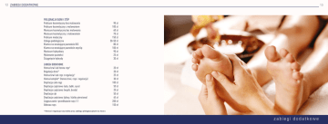 12 ZABIEGI DODATKOWE 13 PIELĘGNACJA DŁONI I STÓP Pedicure kosmetyczny bez malowania Pedicure kosmetyczny z malowaniem Manicure kosmetyczny bez malowania Manicure kosmetyczny z malowaniem Pedicure medyczny Usługa podologiczna Klamra na wrastające paznokcie B/S Klamra na wrastające paznokcie onyclip Manicure hybrydowy Malowanie paznokci Ściągnięcie hybrydy ZABIEGI DODATKOWE Henna brwi lub henna rzęs* Regulacja brwi* Henna brwi lub rzęs z regulacją* Henna komplet* (henna brwi, rzęs i regulacja) Depilacja całe nogi Depilacja częściowa (uda, łydki, ręce) Depilacja częściowa (wąsik, broda) Depilacja rąk Depilacja częściowa (plecy, klatka piersiowa) Zagęszczanie i przedłużanie rzęs 1:1 Odnowa rzęs 90 zł 100 zł 60 zł 70 zł 150 zł 20-50 zł 80 zł 100 zł 90 zł 25 zł 30 zł 20 zł 20 zł 25 zł 30 zł 100 zł 50 zł 20 zł 50 zł 65 zł 200 zł 150 zł * Henna i regulacja rzęs tylko przy zabiegu pielęgnacyjnym na twarz zabiegi dodatkowe