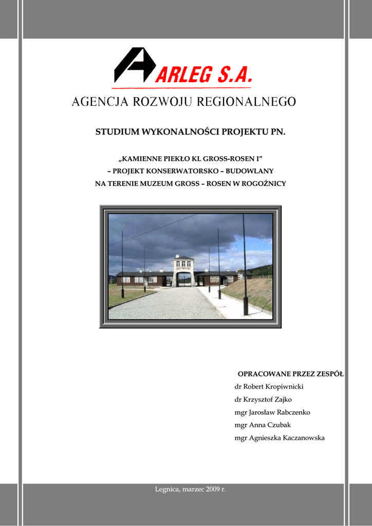 STUDIUM WYKONALNOŚCI PROJEKTU PN. „KAMIENNE PIEKŁO KL GROSS-ROSEN I” – PROJEKT KONSERWATORSKO – BUDOWLANY NA TERENIE MUZEUM GROSS – ROSEN W ROGOŹNICY STUDIUM WYKONALNOŚCI PROJEKTU PN. „KAMIENNE PIEKŁO KL GROSS-ROSEN I” – PROJEKT KONSERWATORSKO – BUDOWLANY NA TERENIE MUZEUM GROSS – ROSEN W ROGOŹNICY OPRACOWANE PRZEZ ZESPÓŁ: dr Robert Kropiwnicki dr Krzysztof Zajko mgr Jarosław Rabczenko mgr Anna Czubak mgr Agnieszka Kaczanowska Legnica, marzec 2009 r. Strona 1 Agencja Rozwoju Regionalnego „ARLEG” S.A. ul. M. Rataja 26, 59-220 Legnica STUDIUM WYKONALNOŚCI PROJEKTU PN. „KAMIENNE PIEKŁO KL GROSS-ROSEN I” – PROJEKT KONSERWATORSKO – BUDOWLANY NA TERENIE MUZEUM GROSS – ROSEN W ROGOŹNICY "...w naszej zbiorowej pamięci musi zostać zachowana świadomość rozmiarów Holokaustu, zaplanowanego i przeprowadzonego przez nazistów(...) Głębia grozy, ale też szczyty ludzkiego heroizmu mogą stać się miarą tego, do czego zdolny jest człowiek zarówno w czynieniu dobra, jak i zła..." (z deklaracji podpisanej w Sztokholmie w styczniu 2000 r. przez przedstawicieli 45. państw) Strona 2 Agencja Rozwoju Regionalnego „ARLEG” S.A. ul. M. Rataja 26, 59-220 Legnica STUDIUM WYKONALNOŚCI PROJEKTU PN. „KAMIENNE PIEKŁO KL GROSS-ROSEN I” – PROJEKT KONSERWATORSKO – BUDOWLANY NA TERENIE MUZEUM GROSS – ROSEN W ROGOŹNICY SPIS TREŚCI WSTĘP ....................................................................................................................................................................................5 I. PRZEDMIOT STUDIUM ..............................................................................................................................................26 1. 2. 3. GENEZA I ISTOTA PROJEKTU. POTENCJAŁ I MOŻLIWOŚCI .......................................................................................26 NAZWA I CEL PROJEKTU ..........................................................................................................................................44 PODMIOTY ODPOWIEDZIALNE ZA REALIZACJĘ PRZEDSIĘWZIĘCIA: INWESTOR, BENEFICJENT I OPERATOR .........45 II. PODSUMOWANIE I WNIOSKI ................................................................................................................................47 1. 2. 3. 4. WPROWADZENIE DO PROJEKTU...............................................................................................................................47 KOSZTY PRZEDSIĘWZIĘCIA ......................................................................................................................................72 PODSUMOWANIE WYNIKÓW ANALIZ I FINANSOWANIE .........................................................................................73 GŁÓWNE UWARUNKOWANIA INWESTYCJI (PRAWNE, ADMINISTRACYJNE) WRAZ ZALECENIAMI I REKOMENDACJAMI ............................................................................................................................................................78 III. OTOCZENIE MAKROEKONOMICZNE I TRENDY...........................................................................................80 1. 2. 3. 4. POTENCJAŁ POŁOŻENIA GEOGRAFICZNEGO ...........................................................................................................80 POTENCJAŁ SPOŁECZNO-GOSPODARCZY ................................................................................................................84 ZIDENTYFIKOWANE PROBLEMY ...............................................................................................................................92 UWARUNKOWANIA SPOŁECZNO-EKONOMICZNE REALIZACJI PRZEDSIĘWZIĘCIA .................................................96 IV. LOGIKA INTERWENCJI ...........................................................................................................................................98 1. 2. 5. 4. 5. 6. 7. 8. ŹRÓDŁA IDENTYFIKACJI PROJEKTU..........................................................................................................................98 CELE PROJEKTU ......................................................................................................................................................101 SPÓJNOŚĆ Z CELAMI RPO I KOMPLEMENTARNOŚĆ Z INNYMI PROGRAMAMI ......................................................107 ANALIZA SWOT....................................................................................................................................................112 KORZYŚCI I ODDZIAŁYWANIE ................................................................................................................................113 REZULTATY ............................................................................................................................................................114 PRODUKTY .............................................................................................................................................................115 MATRYCA LOGICZNA ............................................................................................................................................116 V. ANALIZA RYNKU......................................................................................................................................................120 1. 2. 3. 4. 5. 6. DEFINICJA RYNKU USŁUG ......................................................................................................................................120 WIELKOŚĆ RYNKU I JEGO PODZIAŁ (PODAŻ/POPYT) ............................................................................................123 UDZIAŁ NOWEGO PRZEDSIĘWZIĘCIA W RYNKU ....................................................................................................124 ODBIORCY USŁUG ................................................................................................................................