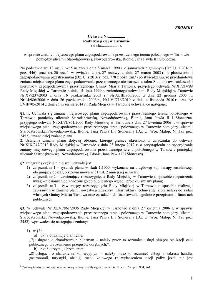 PROJEKT Uchwała Nr................. Rady Miejskiej w Tarnowie z dnia.................. r. w sprawie zmiany miejscowego planu zagospodarowania przestrzennego terenu położonego w Tarnowie pomiędzy ulicami: Starodąbrowską, Nowodąbrowską, Błonie, Jana Pawła II i Słoneczną. Na podstawie art. 18 ust. 2 pkt 5 ustawy z dnia 8 marca 1990 r. o samorządzie gminnym (Dz. U. z 2016 r. poz. 446) oraz art. 20 ust. 1 w związku z art. 27 ustawy z dnia 27 marca 2003 r. o planowaniu i zagospodarowaniu przestrzennym (Dz. U. z 2016 r. poz. 778 z późn. zm.2) po stwierdzeniu, że przedmiotowa zmiana miejscowego planu zagospodarowania przestrzennego nie narusza ustaleń Studium uwarunkowań i kierunków zagospodarowania przestrzennego Gminy Miasta Tarnowa, przyjętego uchwałą Nr XI/214/99 Rady Miejskiej w Tarnowie z dnia 15 lipca 1999 r. zmienionego uchwałami Rady Miejskiej w Tarnowie Nr XV/237/2003 z dnia 16 października 2003 r., Nr XLIII/766/2005 z dnia 22 grudnia 2005 r., Nr LI/986/2006 z dnia 26 października 2006 r., Nr LVI/716/2010 z dnia 4 listopada 2010 r. oraz Nr LVII/705/2014 z dnia 25 września 2014 r., Rada Miejska w Tarnowie uchwala, co następuje: §1. 1. Uchwala się zmianę miejscowego planu zagospodarowania przestrzennego terenu położonego w Tarnowie pomiędzy ulicami: Starodąbrowską, Nowodąbrowską, Błonie, Jana Pawła II i Słoneczną, przyjętego uchwałą Nr XLVI/861/2006 Rady Miejskiej w Tarnowie z dnia 27 kwietnia 2006 r. w sprawie miejscowego planu zagospodarowania przestrzennego terenu położonego w Tarnowie pomiędzy ulicami: Starodąbrowską, Nowodąbrowską, Błonie, Jana Pawła II i Słoneczną (Dz. U. Woj. Małop. Nr 385 poz. 2452), zwaną dalej zmianą planu. 2. Ustalenia zmiany planu dotyczą obszaru, którego granice określono w załączniku do uchwały Nr XIX/247/2012 Rady Miejskiej w Tarnowie z dnia 23 lutego 2012 r. o przystąpieniu do sporządzania zmiany miejscowego planu zagospodarowania przestrzennego terenu położonego w Tarnowie pomiędzy ulicami: Starodąbrowską, Nowodąbrowską, Błonie, Jana Pawła II i Słoneczną. §2. Integralną częścią niniejszej uchwały jest: 1) załącznik nr 1 – rysunek planu w skali 1:1000, wykonany na urzędowej kopii mapy zasadniczej, obejmujący obszar, o którym mowa w §1 ust. 2 niniejszej uchwały; 2) załącznik nr 2 – zawierający rozstrzygnięcia Rady Miejskiej w Tarnowie o sposobie rozpatrzenia uwag wniesionych do wyłożonego do publicznego wglądu projektu zmiany planu; 3) załącznik nr 3 – zawierający rozstrzygnięcia Rady Miejskiej w Tarnowie o sposobie realizacji zapisanych w zmianie planu, inwestycji z zakresu infrastruktury technicznej, które należą do zadań własnych Gminy Miasta Tarnowa oraz zasadach ich finansowania zgodnie z przepisami o finansach publicznych. §3. W uchwale Nr XLVI/861/2006 Rady Miejskiej w Tarnowie z dnia 27 kwietnia 2006 r. w sprawie miejscowego planu zagospodarowania przestrzennego terenu położonego w Tarnowie pomiędzy ulicami: Starodąbrowską, Nowodąbrowską, Błonie, Jana Pawła II i Słoneczną (Dz. U. Woj. Małop. Nr 385 poz. 2452), wprowadza się następujące zmiany: 1) w §3: a) pkt 7 otrzymuje brzmienie: „7) usługach o charakterze publicznym – należy przez to rozumieć usługi służące realizacji celu publicznego w rozumieniu przepisów odrębnych,”, b) pkt 8 otrzymuje brzmienie: „8) usługach o charakterze komercyjnym – należy przez to rozumieć usługi z zakresu handlu, gastronomii, turystyki, obsługi ruchu kołowego (z wyłączeniem stacji paliw jeżeli nie jest 2 Zmiany tekstu jednolitego wymienionej ustawy zostały ogłoszone w Dz. U. z 2016 r. poz. 904, 961. 1 wyszczególniona w ustaleniach szczegółowych) oraz inne usługi o zbliżonym charakterze,”, c) uchyla się pkt 9, d) uchyla się pkt 11, e) pkt 12 otrzymuje brzmienie: „12) nieprzekraczalnej linii zabudowy – należy przez to rozumieć linię wyznaczoną na rysunku planu, określającą graniczne usytuowanie bryły budynku z dopuszczeniem wysunięcia przed nią na głębokości do 1,5 m takich elementów jak schody, balkony, loggie, wykusze itp.,”, f) znajdującą się na końcu zdania kropkę zastępuje się przecinkiem i dodaje się pkt 16 w brzmieniu: “16) powierzchni zabudowy – należy przez to rozumieć powierzchnię terenu zajętą przez budynek w stanie wykończonym, liczoną w rzucie przyziemia mierzonego na wysokości 1 m po obrysie zewnętrznych ścian, z wyłączeniem tarasów, schodów, pochylni, dojść i dojazdów.”; 2) w §4: a) w ust. 3: − pkt 9 otrzymuje brzmienie: “9) KP – tereny parkingów i garaży,”, − uchyla się pkt 13, 14 i 15; b) uchyla się ust. 4; 3) §5 otrzymuje brzmienie: „§ 5 Zasady ochrony i kształtowania ładu przestrzennego. 1. Ustala się następujące, wiążące przy podziałach gruntów na nowe działki budowlane, minimalne ich wielkości oraz zasady zagospodarowania: 1) ustala się, jeżeli ustalenia szczegółowe nie stanowią inaczej, że dla terenów zabudowy mieszkaniowej wielorodzinnej i wielorodzinnej z usługami, oznaczonych symbolami MW i MWU wyklucza się możliwość uzupełniania istniejącej zabudowy nowymi obiektami mieszkalnymi i usługowymi, z wyłączeniem pkt 2; 2) ustala się, że dla terenów zabudowy mieszkaniowej wielorodzinnej i wielorodzinnej z usługami, oznaczonych na rysunku planu symbolami: 3MW, 4.MW, 1MWU, 2MWU i 4MWU: a) powierzchnia nowo wydzielonej działki budowlanej wynosi minimum 2000 m², b) w obrębie działki budowlanej należy zapewnić stałe miejsca postojowe w liczbie minimum 1,2 miejsca na jedno mieszkanie i określonej w pkt 5 lit c ilości miejsc dla usług, c) minimum 30% miejsc postojowych należy lokalizować w przyziemiu budynków mieszkaniowych, d) powierzchnia biologicznie czynna działki budowlanej nie może być mniejsza niż 30% jej powierzchni, e) intensywność zabudowy nie może być mniejsza niż 0,01 i większa niż 2,8; f) powierzchnia zabud