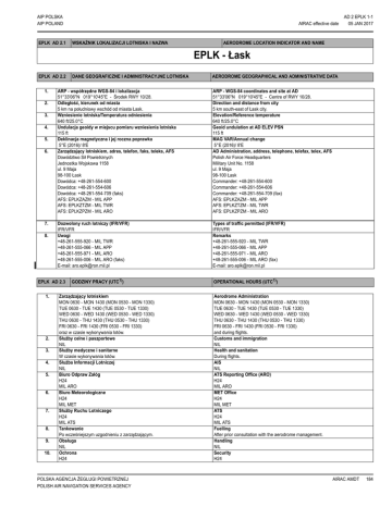 AIP POLSKA AIP POLAND EPLK AD 2.1 AIRAC effective date WSKAŹNIK LOKALIZACJI LOTNISKA I NAZWA AD 2 EPLK 1-1 05 JAN 2017 AERODROME LOCATION INDICATOR AND NAME EPLK - Łask cc EPLK AD 2.2 1. 2. 3. 4. 5. 6. 7. 8. 2. 3. 4. 5. 6. 7. 8. 9. 10. AERODROME GEOGRAPHICAL AND ADMINISTRATIVE DATA ARP - współrzędne WGS-84 i lokalizacja 51°33'06''N 019°10'45''E - Środek RWY 10/28. Odległość, kierunek od miasta 5 km na południowy wschód od miasta Łask. Wzniesienie lotniska/Temperatura odniesienia 640 ft/25.0°C Undulacja geoidy w miejscu pomiaru wzniesienia lotniska 115 ft Deklinacja magnetyczna i jej roczna poprawka 5°E (2016)/ 8'E Zarządzający lotniskiem, adres, telefon, faks, teleks, AFS Dowództwo Sił Powietrznych Jednostka Wojskowa 1158 ul. 9 Maja 98-100 Łask Dowódca: +48-261-554-600 Dowódca: +48-261-554-606 Dowódca: +48-261-554-709 (faks) AFS: EPLKZAZM - MIL APP AFS: EPLKZTZM - MIL TWR AFS: EPLKZPZM - MIL ARO ARP - WGS-84 coordinates and site at AD 51°33'06''N 019°10'45''E - Centre of RWY 10/28. Direction and distance from city 5 km south-east of Łask city. Elevation/Reference temperature 640 ft/25.0°C Geoid undulation at AD ELEV PSN 115 ft MAG VAR/Annual change 5°E (2016)/ 8'E AD Administration, address, telephone, telefax, telex, AFS Polish Air Force Headquarters Military Unit No. 1158 ul. 9 Maja 98-100 Łask Commander: +48-261-554-600 Commander: +48-261-554-606 Commander: +48-261-554-709 (fax) AFS: EPLKZAZM - MIL APP AFS: EPLKZTZM - MIL TWR AFS: EPLKZPZM - MIL ARO Dozwolony ruch lotniczy (IFR/VFR) IFR/VFR Uwagi +48-261-555-920 - MIL TWR +48-261-555-066 - MIL APP +48-261-555-971 - MIL ARO +48-261-555-006 - MIL ARO (faks) E-mail: [email protected] Types of traffic permitted (IFR/VFR) IFR/VFR Remarks +48-261-555-920 - MIL TWR +48-261-555-066 - MIL APP +48-261-555-971 - MIL ARO +48-261-555-006 - MIL ARO (fax) E-mail: [email protected] EPLK AD 2.3 1. DANE GEOGRAFICZNE I ADMINISTRACYJNE LOTNISKA GODZINY PRACY (UTC1)) Zarządzający lotniskiem MON 0630 - MON 1430 (MON 0530 - MON 1330) TUE 0630 - TUE 1430 (TUE 0530 - TUE 1330) WED 0630 - WED 1430 (WED 0530 - WED 1330) THU 0630 - THU 1430 (THU 0530 - THU 1330) FRI 0630 - FRI 1430 (FRI 0530 - FRI 1330) oraz w czasie wykonywania lotów. Służby celne i paszportowe NIL Służby medyczne i sanitarne W czasie wykonywania lotów. Służba Informacji Lotniczej NIL Biuro Odpraw Załóg H24 MIL ARO Biuro Meteorologiczne H24 MIL MET Służby Ruchu Lotniczego H24 MIL ATS Tankowanie Po wcześniejszym uzgodnieniu z zarządzającym. Obsługa NIL Ochrona H24 POLSKA AGENCJA ŻEGLUGI POWIETRZNEJ POLISH AIR NAVIGATION SERVICES AGENCY OPERATIONAL HOURS (UTC1)) Aerodrome Administration MON 0630 - MON 1430 (MON 0530 - MON 1330) TUE 0630 - TUE 1430 (TUE 0530 - TUE 1330) WED 0630 - WED 1430 (WED 0530 - WED 1330) THU 0630 - THU 1430 (THU 0530 - THU 1330) FRI 0630 - FRI 1430 (FRI 0530 - FRI 1330) and during flights. Customs and immigration NIL Health and sanitation During flights. AIS NIL ATS Reporting Office (ARO) H24 MIL ARO MET Office H24 MIL MET ATS H24 MIL ATS Fuelling After prior consultation with the aerodrome management. Handling NIL Security H24 AIRAC AMDT 184 AIP POLSKA AIP POLAND AD 2 EPLK 1-2 AIRAC effective date 23 JUN 2016 11. 12. Odladzanie NIL Uwagi De-icing NIL Remarks 1) 1) - patrz GEN 2.1. EPLK AD 2.4 1. 2. 3. 4. 5. 6. 7. Środki załadowcze Podnośniki widłowe. Rodzaje paliwa i oleju F-34 z dodatkiem S-1745 Olej silnikowy turbo NICOILL - 160 Hydrauliczny AEROSHELL FLUID 31 Urządzenia do tankowania/Pojemność 9 cystern - 2 x 33000 L, 5 x 27000 L, 2 x 10000 L; CARTER - 1. Urządzenia do odladzania NIL Możliwość hangarowania dla przylatujących statków powietrznych Brak. Urządzenia naprawcze dla przylatujących statków powietrznych Naprawa F-16./Drobne naprawy. Uwagi Tlen w stanie gazowym. EPLK AD 2.5 1. 2. 3. 4. 5. 6. 7. 2. 3. 4. UŁATWIENIA DLA PASAŻERÓW Hotele Hotel w miejscowości Kolumna. Restauracje Restauracje w mieście. Środki transportu Samochód dla załogi z lotniska do miejscowości Łask po wcześniejszym uzgodnieniu. Pomoc medyczna Na lotnisku pierwszy poziom pomocy medycznej. Szpital w mieście. Usługi bankowe i pocztowe W mieście. Informacja turystyczna W mieście. Uwagi NIL EPLK AD 2.6 1. SŁUŻBY I URZĄDZENIA HANDLINGOWE SŁUŻBA RATOWNICZA I PRZECIWPOŻAROWA Kategoria lotniska w zakresie ochrony przeciwpożarowej CAT 6 ICAO (CAT 8, możliwa po powiadomieniu wojskowej straży pożarnej z wyprzedzeniem 48 HR) Wyposażenie ratownicze Sprzęt zgodny z wymogami ICAO dla kategorii 6 ochrony przeciwpożarowej. Możliwości usuwania uszkodzonych statków powietrznych Dźwig do 18 t. Uwagi NIL EPLK AD 2.7 1. 2. 3. SEZONOWA DOSTĘPNOŚĆ LOTNISKA I OCZYSZCZANIE Rodzaj(e) urządzeń do oczyszczania Wirnikowy zgarniacz śniegu - 4, Oczyszczarka dróg startowych na podwoziu kołowym - 6, Polewarko-zmywarka - 4, Rozsypywarka środków chemicznych - 1, Odkurzacz lotniskowy - 4. Kolejność oczyszczania RWY, TWY D, TWY A, TWY E, pozostałe TWY. Uwagi NIL AIRAC AMDT 177 - see GEN 2.1. HANDLING SERVICES AND FACILITIES Cargo-handling facilities Fork lift trucks. Fuel/Oil types F-34 additionally S-1745 Motoroil turbo NICOILL - 160 Hydraulic AEROSHELL FLUID 31 Fuelling facilities/Capacity 9 tank trucks - 2 x 33000 L, 5 x 27000 L, 2 x 10000 L; CARTER - 1. De-icing facilities NIL Hangar space for visiting aircraft None. Repair facilities for visiting aircraft F-16 repairs./Minor repairs. Remarks Oxygen (gas). PASSENGER FACILITIES Hotels Hotel at Kolumna town. Restaurants City restaurants. Transportation Car for crew from the aerodrome to Łask town after prior consultation. Medical facilities First level of medical aid at the aerodrome. Hospital in the city. Bank and Post office In the city. Tourist office In the city. Remarks NIL RESCUE AND FIRE FIGHTING SERVICES Aerodrome category for fire fighting CAT 6 ICAO (CAT 8, possible by arrangement with the MIL firefighting service 48 HR in advance) Rescue equipment Rescue equipm