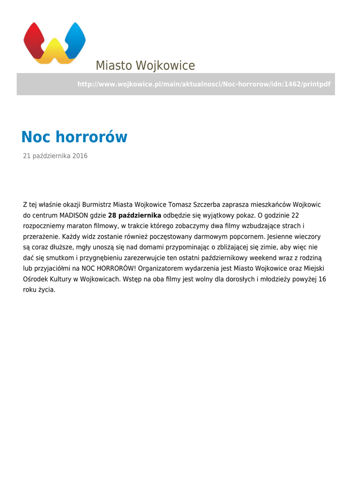 Miasto Wojkowice http://www.wojkowice.pl/main/aktualnosci/Noc-horrorow/idn:1462/printpdf Noc horrorów 21 października 2016 kategoria: Wojkowice Z tej właśnie okazji Burmistrz Miasta Wojkowice Tomasz Szczerba zaprasza mieszkańców Wojkowic do centrum MADISON gdzie 28 października odbędzie się wyjątkowy pokaz. O godzinie 22 rozpoczniemy maraton filmowy, w trakcie którego zobaczymy dwa filmy wzbudzające strach i przerażenie. Każdy widz zostanie również poczęstowany darmowym popcornem. Jesienne wieczory są coraz dłuższe, mgły unoszą się nad domami przypominając o zbliżającej się zimie, aby więc nie dać się smutkom i przygnębieniu zarezerwujcie ten ostatni październikowy weekend wraz z rodziną lub przyjaciółmi na NOC HORRORÓW! Organizatorem wydarzenia jest Miasto Wojkowice oraz Miejski Ośrodek Kultury w Wojkowicach. Wstęp na oba filmy jest wolny dla dorosłych i młodzieży powyżej 16 roku życia.