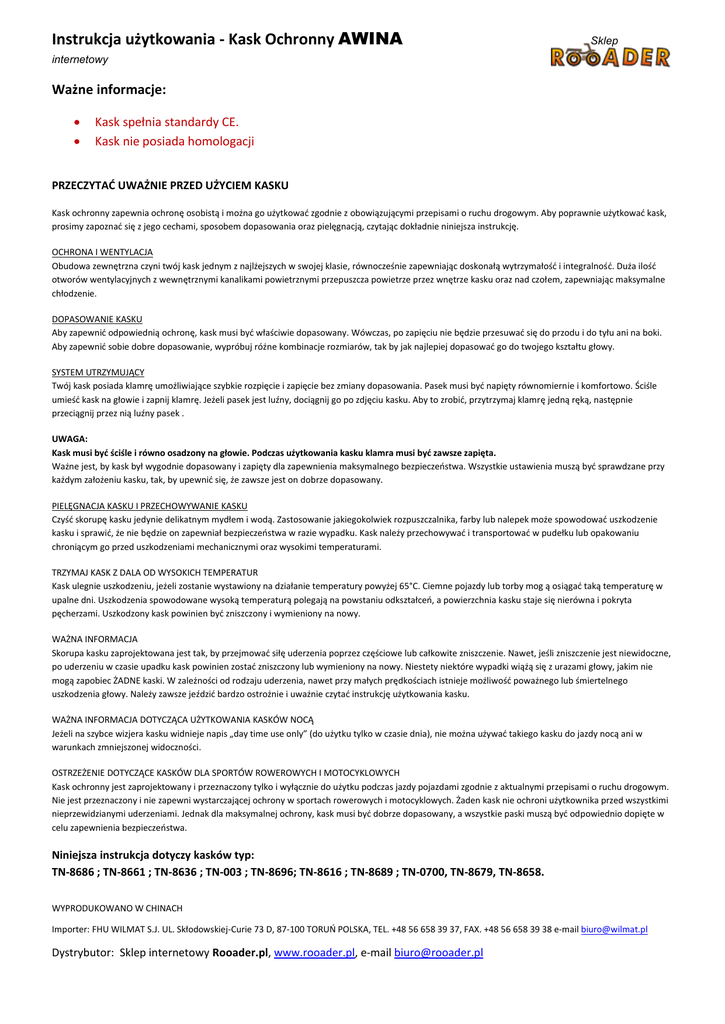 Instrukcja użytkowania - Kask Ochronny AWINA Sklep internetowy Ważne informacje: Kask spełnia standardy CE. Kask nie posiada homologacji PRZECZYTAĆ UWAŻNIE PRZED UŻYCIEM KASKU Kask ochronny zapewnia ochronę osobistą i można go użytkować zgodnie z obowiązującymi przepisami o ruchu drogowym. Aby poprawnie użytkować kask, prosimy zapoznać się z jego cechami, sposobem dopasowania oraz pielęgnacją, czytając dokładnie niniejsza instrukcję. OCHRONA I WENTYLACJA Obudowa zewnętrzna czyni twój kask jednym z najlżejszych w swojej klasie, równocześnie zapewniając doskonałą wytrzymałość i integralność. Duża ilość otworów wentylacyjnych z wewnętrznymi kanalikami powietrznymi przepuszcza powietrze przez wnętrze kasku oraz nad czołem, zapewniając maksymalne chłodzenie. DOPASOWANIE KASKU Aby zapewnić odpowiednią ochronę, kask musi być właściwie dopasowany. Wówczas, po zapięciu nie będzie przesuwać się do przodu i do tyłu ani na boki. Aby zapewnić sobie dobre dopasowanie, wypróbuj różne kombinacje rozmiarów, tak by jak najlepiej dopasować go do twojego kształtu głowy. SYSTEM UTRZYMUJĄCY Twój kask posiada klamrę umożliwiające szybkie rozpięcie i zapięcie bez zmiany dopasowania. Pasek musi być napięty równomiernie i komfortowo. Ściśle umieść kask na głowie i zapnij klamrę. Jeżeli pasek jest luźny, dociągnij go po zdjęciu kasku. Aby to zrobić, przytrzymaj klamrę jedną ręką, następnie przeciągnij przez nią luźny pasek . UWAGA: Kask musi być ściśle i równo osadzony na głowie. Podczas użytkowania kasku klamra musi być zawsze zapięta. Ważne jest, by kask był wygodnie dopasowany i zapięty dla zapewnienia maksymalnego bezpieczeństwa. Wszystkie ustawienia muszą być sprawdzane przy każdym założeniu kasku, tak, by upewnić się, że zawsze jest on dobrze dopasowany. PIELĘGNACJA KASKU I PRZECHOWYWANIE KASKU Czyść skorupę kasku jedynie delikatnym mydłem i wodą. Zastosowanie jakiegokolwiek rozpuszczalnika, farby lub nalepek może spowodować uszkodzenie kasku i sprawić, że nie będzie on zapewniał bezpieczeństwa w razie wypadku. Kask należy przechowywać i transportować w pudełku lub opakowaniu chroniącym go przed uszkodzeniami mechanicznymi oraz wysokimi temperaturami. TRZYMAJ KASK Z DALA OD WYSOKICH TEMPERATUR Kask ulegnie uszkodzeniu, jeżeli zostanie wystawiony na działanie temperatury powyżej 65°C. Ciemne pojazdy lub torby mog ą osiągać taką temperaturę w upalne dni. Uszkodzenia spowodowane wysoką temperaturą polegają na powstaniu odkształceń, a powierzchnia kasku staje się nierówna i pokryta pęcherzami. Uszkodzony kask powinien być zniszczony i wymieniony na nowy. WAŻNA INFORMACJA Skorupa kasku zaprojektowana jest tak, by przejmować siłę uderzenia poprzez częściowe lub całkowite zniszczenie. Nawet, jeśli zniszczenie jest niewidoczne, po uderzeniu w czasie upadku kask powinien zostać zniszczony lub wymieniony na nowy. Niestety niektóre wypadki wiążą się z urazami głowy, jakim nie mogą zapobiec ŻADNE kaski. W zależności od rodzaju uderzenia, nawet przy małych prędkościach istnieje możliwość poważnego lub śmiertelnego uszkodzenia głowy. Należy zawsze jeździć bardzo ostrożnie i uważnie czytać instrukcję użytkowania kasku. WAŻNA INFORMACJA DOTYCZĄCA UŻYTKOWANIA KASKÓW NOCĄ Jeżeli na szybce wizjera kasku widnieje napis „day time use only” (do użytku tylko w czasie dnia), nie można używać takiego kasku do jazdy nocą ani w warunkach zmniejszonej widoczności. OSTRZEŻENIE DOTYCZĄCE KASKÓW DLA SPORTÓW ROWEROWYCH I MOTOCYKLOWYCH Kask ochronny jest zaprojektowany i przeznaczony tylko i wyłącznie do użytku podczas jazdy pojazdami zgodnie z aktualnymi przepisami o ruchu drogowym. Nie jest przeznaczony i nie zapewni wystarczającej ochrony w sportach rowerowych i motocyklowych. Żaden kask nie ochroni użytkownika przed wszystkimi nieprzewidzianymi uderzeniami. Jednak dla maksymalnej ochrony, kask musi być dobrze dopasowany, a wszystkie paski muszą być odpowiednio dopięte w celu zapewnienia bezpieczeństwa. Niniejsza instrukcja dotyczy kasków typ: TN-8686 ; TN-8661 ; TN-8636 ; TN-003 ; TN-8696; TN-8616 ; TN-8689 ; TN-0700, TN-8679, TN-8658. WYPRODUKOWANO W CHINACH Importer: FHU WILMAT S.J. UL. Skłodowskiej-Curie 73 D, 87-100 TORUŃ POLSKA, TEL. +48 56 658 39 37, FAX. +48 56 658 39 38 e-mail [email protected] Dystrybutor: Sklep internetowy Rooader.pl, www.rooader.pl, e-mail [email protected]