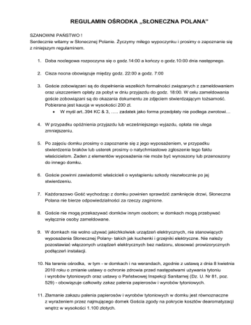 REGULAMIN OŚRODKA „SŁONECZNA POLANA” SZANOWNI PAŃSTWO ! Serdecznie witamy w Słonecznej Polanie. Życzymy miłego wypoczynku i prosimy o zapoznanie się z niniejszym regulaminem. 1. Doba noclegowa rozpoczyna się o godz.14:00 a kończy o godz.10:00 dnia następnego. 2. Cisza nocna obowiązuje między godz. 22:00 a godz. 7:00 3. Goście zobowiązani są do dopełnienia wszelkich formalności związanych z zameldowaniem oraz uiszczeniem opłaty za pobyt w dniu przyjazdu do godz. 18:00. W celu zameldowania goście zobowiązani są do okazania dokumentu ze zdjęciem stwierdzającym tożsamość. Pobierana jest kaucja w wysokości 200 zł. W myśl art..394 KC & 3, ….. zadatek jako forma przedpłaty nie podlega zwrotowi… 4. W przypadku opóźnienia przyjazdu lub wcześniejszego wyjazdu, opłata nie ulega zmniejszeniu. 5. Po zajęciu domku prosimy o zapoznanie się z jego wyposażeniem, w przypadku stwierdzenia braków lub usterek prosimy o natychmiastowe zgłoszenie tego faktu właścicielom. Żaden z elementów wyposażenia nie może być wynoszony lub przenoszony do innego domku. 6. Goście powinni zawiadomić właścicieli o wystąpieniu szkody niezwłocznie po jej stwierdzeniu. 7. Każdorazowo Gość wychodząc z domku powinien sprawdzić zamknięcie drzwi, Słoneczna Polana nie bierze odpowiedzialności za rzeczy zaginione. 8. Goście nie mogą przekazywać domków innym osobom; w domkach mogą przebywać wyłącznie osoby zameldowane. 9. W domkach nie wolno używać jakichkolwiek urządzeń elektrycznych, nie stanowiących wyposażenia Słonecznej Polany- takich jak kuchenki i grzejniki elektryczne. Nie należy pozostawiać włączonych urządzeń elektrycznych bez nadzoru, stosować prowizorycznych podłączeń instalacji. 10. Na terenie ośrodka, w tym - w domkach i na werandach, zgodnie z ustawą z dnia 8 kwietnia 2010 roku o zmianie ustawy o ochronie zdrowia przed następstwami używania tytoniu i wyrobów tytoniowych oraz ustawy o Państwowej Inspekcji Sanitarnej (Dz. U. Nr 81, poz. 529) - obowiązuje całkowity zakaz palenia papierosów i wyrobów tytoniowych. 11. Złamanie zakazu palenia papierosów i wyrobów tytoniowych w domku jest równoznaczne z wyrażeniem przez najmującego domek Gościa zgody na pokrycie kosztów dearomatyzacji wnętrz w wysokości 1.100 złotych. 12. Przedmioty osobistego użytku pozostawione w pokoju przez wyjeżdżającego Gościa będą odesłane na jego koszt, na adres przez niego wskazany. W przypadku nie otrzymania takiej dyspozycji właściciel Słonecznej Polany przechowa te przedmioty przez 3 miesiące, a następnie przekaże je na cele charytatywne lub do użytku publicznego. 13. Słoneczna Polana nie odpowiada za zaistniałe na jej terenie wypadki, nie będące następstwem przyczyn wynikających z wadliwej konstrukcji urządzeń i innych przedmiotów stanowiących jej wyposażenie. 14. Słoneczna Polana nie bierze odpowiedzialności za rzeczy zaginione. 15. Słoneczna Polana udostępnia nieodpłatnie miejsca parkingowe, ale nie bierze odpowiedzialności za ewentualne uszkodzenia, straty lub kradzieże. 16. Słoneczna Polana zastrzega sobie prawo do zwrotu kosztów za poczynione przez Gości uszkodzenia lub zniszczenia na terenie ośrodka. Rodzice odpowiadają za szkody wyrządzone przez dzieci. 17. Słoneczna Polana może odmówić dalszego świadczenia usług osobom które naruszą postanowienia regulaminu.
