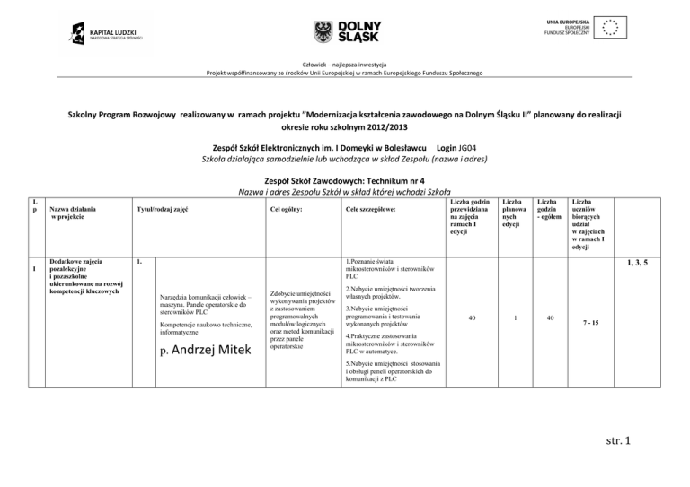 Człowiek – najlepsza inwestycja Projekt współfinansowany ze środków Unii Europejskiej w ramach Europejskiego Funduszu Społecznego Szkolny Program Rozwojowy realizowany w ramach projektu ”Modernizacja kształcenia zawodowego na Dolnym Śląsku II” planowany do realizacji okresie roku szkolnym 2012/2013 Zespół Szkół Elektronicznych im. I Domeyki w Bolesławcu Login JG04 Szkoła działająca samodzielnie lub wchodząca w skład Zespołu (nazwa i adres) Zespół Szkół Zawodowych: Technikum nr 4 Nazwa i adres Zespołu Szkół w skład której wchodzi Szkoła L p I Nazwa działania w projekcie Tytuł/rodzaj zajęć Dodatkowe zajęcia pozalekcyjne i pozaszkolne ukierunkowane na rozwój kompetencji kluczowych 1. Cel ogólny: Cele szczegółowe: Liczba godzin przewidziana na zajęcia ramach I edycji Liczba planowa nych edycji Liczba godzin - ogółem Liczba uczniów biorących udział w zajęciach w ramach I edycji 1.Poznanie świata mikrosterowników i sterowników PLC Narzędzia komunikacji człowiek – maszyna. Panele operatorskie do sterowników PLC Kompetencje naukowo techniczne, informatyczne p. Andrzej Mitek Zdobycie umiejętności wykonywania projektów z zastosowaniem programowalnych modułów logicznych oraz metod komunikacji przez panele operatorskie 1, 3, 5 2.Nabycie umiejętności tworzenia własnych projektów. 3.Nabycie umiejętności programowania i testowania wykonanych projektów 40 1 40 7 - 15 4.Praktyczne zastosowania mikrosterowników i sterowników PLC w automatyce. 5.Nabycie umiejętności stosowania i obsługi paneli operatorskich do komunikacji z PLC str. 1 Człowiek – najlepsza inwestycja Projekt współfinansowany ze środków Unii Europejskiej w ramach Europejskiego Funduszu Społecznego 2. Elektronika – technologie wytwarzania i pomiary Projektowanie, planowanie i montaż układów elektronicznych Kompetencje naukowo techniczne, informatyczne p. Eugeniusz Franczyk 3. Projektowanie układów elektronicznych z wykorzystaniem komputera Kompetencje naukowo techniczne, informatyczne p. Bartosz Zyss Projektowanie urządzeń elektronicznych 1. Poznanie i posługiwanie się przyrządami stosowanymi w elektronice 2. Poznanie programów wspomagających projektowanie układów elektronicznych 3. Poznanie sposobów montażu obwodów elektronicznych 4. Umiejętne wykorzystanie teorii w realizacji układów elektronicznych 1. Poznanie i posługiwanie się aplikacjami komputerowymi do projektowania ukł. Elektronicznych 2. Wykonywanie typowych układów elektronicznych: a) Projektowanie układów b) Montaż układów c) Strojenie układów d) Pomiary układów 1, 3, 5 40 1 40 7 - 15 1, 3, 4, 5 40 1 40 7 - 15 str. 2 Człowiek – najlepsza inwestycja Projekt współfinansowany ze środków Unii Europejskiej w ramach Europejskiego Funduszu Społecznego 4. Projektowanie publikacji drukowanych i elektronicznych z wykorzystaniem narzędzi informatycznych. Kompetencje naukowo techniczne, informatyczne p. Mariusz Potyszka Rozwinięcie podstawowych kompetencji technicznych i informatycznych związanych z redagowaniem publikacji drukowanych i elektronicznych oraz zastosowanie ich w praktyce 1. Zalety i wady różnych narzędzi do edycji publikacji 2. Pojęcie typografii i zastosowanie w praktyce 3. Przygotowanie książek i broszur do wydruku 4. Kompozycje barwne oraz dobór czionek i barw i układu tekstu 5. Dostosowanie rozmiarów stron, orientacji do rodzaju urządzeń przeznaczonych do wyświetlania efektów pracy 6. Wykorzystanie narzędzi do gromadzenia treści 1, 3, 4, 5 40 1 40 7 – 15 str. 3 Człowiek – najlepsza inwestycja Projekt współfinansowany ze środków Unii Europejskiej w ramach Europejskiego Funduszu Społecznego 5. Artystyczne edytowanie grafiki przeznaczonej do wydawnictw drukowanych oraz na potrzeby stron internetowych Kompetencje naukowo techniczne, informatyczne Rozwinięcie podstawowych kompetencji technicznych i informatycznych związanych z edycją obrazów statycznych. Nabycie kompetencji informatycznych umozliwiających sprawne wykorzystanie narzędzi do obróbki grafiki. 1. Przygotowanie materiału źródłowego do dalszej obróbki cyfrowej (zdjęcie cyfrowe, materiał skanowany) 2. Poznanie najpopularniejszych formatów przechowywania graficznej informacji statycznej. 3. Tworzenie kompozycja zdjęcia i podstawowe zasady obowiązujące w fotografii 4. Kategorie filtrów graficznych i umiejętne ich wykorzystanie 5. Opracowywanie na potrzeby publikacji drukowanych (tła i ozdobniki) 6. Opracowywanie layout’ów na potrzeby stron internetowych 7. Retusz zdjęć 8. Cyfrowe „ratowanie” zdjęć i obrazów” p. Mariusz Potyszka 1, 3, 4, 5 40 1 40 7 – 15 str. 4 Człowiek – najlepsza inwestycja Projekt współfinansowany ze środków Unii Europejskiej w ramach Europejskiego Funduszu Społecznego Rozwinięcie kompetencji dot. Przyswojenia podstawowych struktur matematycznych w stopniu umożliwiającym wykorzystanie ich przydatności w sytuacjach praktycznych 6. Matematyczne równania szans p. Jacek Kawka 7. Deutsch mit Erfolg p. Kamilla Dudek 1. Nabycie umiejętności dot. Sposobów rozwiązywania zadań z zakresu liczb rzeczywistych, funkcji i geometrii 2. Utrwalenie znajomości podstawowych zależności matematycznych i ich wzajemnych relacji 3. Nabycie umiejętności zastosowania definicji, twierdzeń i wzorów do rozwiązywania zadań w sytuacjach praktycznych 4. Nabycie umiejętności oceny przeprowadzonego rozumowania lub otrzymanego wyniku obliczeń 1. Doskonalenie wybranych kompetencji kluczowych : 1. Rozwijanie czterech podstawowych sprawności językowych: - porozumiewanie się w językach obcych - słuchanie - umiejętność uczenia się 1,2,4 40 1 40 7 – 15 1,2,4 - mówienie - czytanie - pisanie 40 1 40 7 – 15 2. Ugruntowanie i przypomnienie wiadomości zdobytych na l. jęz. niemieckiego 3. Wdrażanie uczniów do samodzielnego zdobywania wiedzy z zakresu j. niem. Przez pracę z podręcznikiem, słownikiem i wykonywani