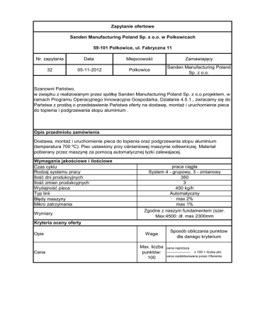 Zapytanie ofertowe Sanden Manufacturing Poland Sp. z o.o. w Polkowicach 59-101 Polkowice, ul. Fabryczna 11 Nr. zapytania Data Miejscowość Zamawiający 32 05-11-2012 Polkowice Sanden Manufacturing Poland Sp. z o.o. Szanowni Państwo, w związku z realizowanym przez spółkę Sanden Manufacturing Poland Sp. z o.o.projektem, w ramach Programu Operacyjnego Innowacyjna Gospodarka, Działanie 4.5.1., zwracamy się do Państwa z prośbą o przedstawienie Państwa oferty na dostawę, montaż i uruchomienie pieca do topienia i podgrzewania stopu aluminium . Opis przedmiotu zamówienia Dostawa, montaż i uruchomienie pieca do topienia oraz podgrzewania stopu aluminium (temperatura 700 ºC). Piec ustawiony przy ciśnieniowej maszynie odlewniczej. Materiał pobierany przez maszynę za pomocą automatycznej łyzki zalewajacej. Wymagania jakościowe i ilościowe Czas cyklu Rodzaj systemu pracy Ilość dni produkcyjnych Ilość zmian produkcyjnych Wydajność pieca Typ linii Błędy maszyny Mikro zatrzymania Wymiary praca ciągła System 4 - grupowy, 3 - zmianowy 350 3 450 kg/h Automatyczny max 2% max 1% Zgodne z naszym fundamentem (szer. Max:4500: dł. max 2300mm Kryteria oceny oferty Opis Waga Cena Max. liczba punktów: 100 Sposób obliczania punktow dla danego kryterium cena najniższa --------------------- x 100 = liczba pkt. cena zadeklarowana przez Oferenta Miejsce realizacji zamówienia Sanden Manufacturing Poland Sp. z o.o. 59-101 Polkowice, ul. Fabryczna 11 Termin realizacji zamówienia Tydzień 18/2013 Najważniejsze informacje dotyczące sposobu, terminu oraz miejsca skladania ofert Oferta powinna zostać złożona w formie pisemnej i zaadresowana na Sanden Manufacturing Poland Sp. z o.o. z siedzibą w Polkowicach, ul. Fabryczna 11, 59-101 Polkowice lub w formie elektronicznej jako skan podpisanej oferty na adres: [email protected], [email protected] Oferta powinna zostać złożona w terminie do dnia 21-11-2012. Każda oferta powinna wskazywać termin ważności na minimalny okres 60 dni. Inne istotne postanowienia /uwagi Zamawiający zastrzega sobie możliwość negocjowania ofert. O terminie ew. negocjacji Oferenci zostaną poinformowani w odpowiednim czasie. Oferty nie spełniające wymogów ilościowych i jakościowych oraz nie dostosowane do terminu wykonania usługi zadanego przez zamawiającego będą odrzucone. Osoba do kontaktu od strony Zamawiajacego Jarosław Sobczak, Mistrz Inżynierii Produkcji - Odlewnia Ciśnieniowa Krzysztof Bulik, Inżynier Produkcji - Odlewnia Ciśnieniowa E-mail [email protected] [email protected] Telefon Adres +48 76 72 49 206 Sanden Manufacturing Poland Sp. z o.o., 59-101 Polkowice,ul. Fabryczna 11 +48 76 72 49 211 Sanden Manufacturing Poland Sp. z o.o., 59-101 Polkowice,ul. Fabryczna 11 . .