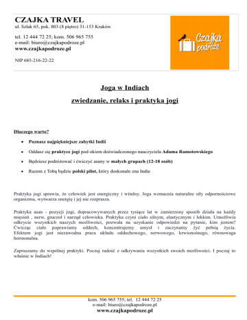 CZAJKA TRAVEL ul. Szlak 65, pok. 803 (8 piętro) 31-153 Kraków tel. 12 444 72 25; kom. 506 965 755 e-mail: [email protected] www.czajkapodroze.pl NIP 685-216-22-22 Joga w Indiach zwiedzanie, relaks i praktyka jogi Dlaczego warto? Poznasz najpiękniejsze zabytki Indii Oddasz się praktyce jogi pod okiem doświadczonego nauczyciela Adama Ramotowskiego Będziesz podróżować i ćwiczyć asany w małych grupach (12-18 osób) Razem z Tobą będzie polski pilot, który doskonale zna Indie Praktyka jogi sprawia, że człowiek jest energiczny i witalny. Joga wzmacnia naturalne siły odpornościowe organizmu, wytwarza energię i jej nie rozprasza. Praktyka asan - pozycji jogi, dopracowywanych przez tysiące lat w zamierzony sposób działa na każdy mięsień , nerw, gruczoł i narząd człowieka. Praktyka czyni ciało silnym, elastycznym i lekkim. Umożliwia odkrycie wszystkich naszych możliwości, pozwala na uzyskanie odpowiedzi na pytanie, kim jestem? Ćwicząc ciało poprawiamy oddech, koncentrujemy umysł i zaczynamy żyć pełnią życia. Efektem jogi jest niezawodna praca układu oddechowego, nerwowego, krwionośnego, równowaga hormonalna. Zapraszamy do wspólnej praktyki. Poczuj radość z odkrywania wszystkich swoich możliwości. I poczuj to właśnie w Indiach! kom. 506 965 755; tel. 12 444 72 25 e-mail: [email protected] www.czajkapodroze.pl Pilot wyjazdu – Rafał Kubik Nauczyciel jogi – Adam Ramotowski Właściciel warszawskiej szkoły jogi "Joga na Foksal". Przewodniczący Stowarzyszenia Szkół Jogi. Codzienną praktykę jogi rozpoczął w 1988 r., uczy od 2002 roku. Utrzymuje stały kontakt z Instytutem B.K.S. Iyengara w Punie w Indiach, a także z wieloma zaawansowanymi nauczycielami jogi. Regularnie uczestniczy w warsztatach prowadzonych przez doskonałych nauczycieli w kraju i za granicą. Kilka słów od Adama: W ramach rozwinięcia, czym dla mnie jest joga, niech posłuży komentarz Wjasy zaczerpnięty z Wisznupurany -„Joga jest nauczycielem jogi, jogę należy zrozumieć poprzez jogę. Dlatego żyj jogą, aby urzeczywistnić jogę, pojmuj jogę przez jogę. Ten kto jest wolny od zaburzeń, raduje się jogą poprzez jogę". Wyrażam głęboką wdzięczność wszystkim moim Nauczycielom, a także moim Uczniom, od których uczę się najwięcej. Zapraszam do wspólnej praktyki! PROGRAM Codziennie oprócz zwiedzania będziemy oddawać się praktyce jogi. 1 dzień: Wylot z Polski do Delhi z przesiadką w jednym z europejskich lub azjatyckich portów lotniczych. 2 dzień: DELHI Przylot na lotnisko w Delhi, transfer do hotelu. Następnie zwiedzanie Grobowca Humajuna i Nowego Delhi. Kolacja i nocleg w Delhi. (Ś,K) 3 dzień: DELHI - DŹODHPUR Po śniadaniu zwiedzanie Starego Delhi, w tym Wielkiego Meczetu, największego meczetu w Indiach. Wieczorem transfer na dworzec kolejowy, na nocny pociąg do Dźodhpuru (Jodhpur) -Błękitnego Miasta. (Ś) 4 dzień: DŹODHPUR Rano śniadanie w hotelu. Po śniadaniu zwiedzimy Dźodhpur, m.in. potężną twierdzę Mehrangarh, jeden z największych fortów w Indiach. Udamy się również do Ogrodu Mandore. Kolacja i nocleg w Dźodhpurze. (Ś,K) 5 dzień: DŹODHPUR - DŹAJSALMER Po śniadaniu transfer na stację kolejową, gdzie wsiądziemy na pociąg do Dźajsalmer (Jaisalmer) - Złotego Miasta. Po południu pojedziemy dżipami na pustynie, gdzie na wydmach będziemy mieli możliwość podziwiania zachodu słońca. Kolacja i nocleg na pustyni. (Ś,O,K) kom. 506 965 755; tel. 12 444 72 25 e-mail: [email protected] www.czajkapodroze.pl 6 dzień: PUSTYNIA THAR Dzień na pustyni. Przejazd dżipami oraz wielbłądami. Obiad, kolacja i nocleg na pustyni. (Ś,O,K) 7 dzień: PUSTYNIA THAR Wczesna pobudka by zobaczyć wschód słońca. Następnie razem z wielbłądami powędrujemy do kolejnego miejsca na pustyni. Obiad, kolacja i nocleg na pustyni. (Ś,O,K) 8 dzień: DŹAJSALMER Po śniadaniu pożegnamy się z pustynią i pojedziemy do hotelu w Dźajsalmer. Po południu czas wolny. Kolacja i nocleg w Dźajsalmer. (Ś,K) 9 dzień: DŹAJSALMER - DŹAJPUR Rano zwiedzimy piękny fort i pospacerujemy po mieście. Po południu wsiądziemy w pociąg do Dźajpuru - Różowego Miasta, gdzie przybędziemy wczesnym rankiem. (Ś) 10 dzień: DŹAJPUR Po śniadaniu ruszymy na zwiedzanie miasta. Zobaczymy słynny Pałac Wiatrów, obserwatorium astronomiczne, kompleks pałacowy maharadżów Dźajpuru oraz monumentalny fort Amber. Kolacja i nocleg w Dźajpurze. (Ś,K) 11 dzień: DŹAJPUR - GOA Rano transfer na lotnisko. Lot na Goa przez Bombaj. Transfer do zacisznej miejscowości nad piękną plażą. Zakwaterowanie w domkach przy plaży. Kolacja i nocleg na Goa. (Ś) 12- 14 dzień: GOA Relaks i praktyka jogi. Noclegi na Goa. (Ś) 15 dzień: POŻEGNANIE Transfer na lotnisko w Goa, skąd, przez jeden z bliskowschodnich portów udamy się do Polski. (Ś) 16 dzień: Powrót do Polski. Kolejność zwiedzania może ulec zmianie. kom. 506 965 755; tel. 12 444 72 25 e-mail: [email protected] www.czajkapodroze.pl CENA OBEJMUJE: noclegi zgodnie z programem wyżywienie zgodnie z programem (Ś-śniadanie, O-obiad, K-kolacja) opłatę wizową zajęcia jogi przelot samolotem z Dźajpuru do Goa z międzylądowaniem w Bombaju bilety wstępu zgodnie z programem przejazdy samochodami z klimatyzacją zgodnie z programem safari na wielbłądach bilety kolejowe zgodnie z programem : Delhi-Dźodhpur (3 klasa A/C); Dźodhpur-Dźajsalmer (3 klasa A/C); Dźajsalmer-Dźajpur (3 klasa A/C); lokalne opłaty klimatyczne lokalni przewodnicy opiekę polskiego pilota Ubezpieczenie KL, NNW, bagażu CENA NIE OBEJMUE: dopłat za kamery i aparaty fotograficzne zwyczajowych napiwków dodatkowego wyżywienia i napojów TERMINY/CENY TERMIN CENA (8-11 osób) CENA (12-15 osób) CENA (16-18 osób) 10.0325.03.2016 5270PLN + 970 USD 4670PLN + 830USD + 4070PLN + 770USD + + przelot przelot przelot UWAGA: Część w PLN: zaliczka (500zł) płatna w biurze przed wyjazdem; pozostała kwota w PLN - 60 dni przed