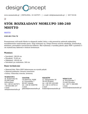www.momastudio.pl | INFOLINIA.: 22 2437671 | e-mail: [email protected] | 2017-03-04 STÓŁ ROZKŁADANY MORLUPO 180-240 MIOTTO MIOTTO 4183.00 3764.70 Prezentowany stół marki Miotto to elegancki mebel, który z całą pewnością zadowoli najbardziej wysublimowane wnętrzarskie gusta. Nogi wykonane są z litego drewna orzecha włoskiego. Konstrukcja metalowa, prowadnice synchroniczne kulkowe. Blat wykonany z wysokiej jakości płyty MDF o grubości 5 cm wykończony lakierem w kolorze kremowym. Wymiary ● ● ● ● Szerokość: 180.00 cm Wysokość: 76.00 cm Głębokość: 100.00 cm Szerokość po rozłożeniu: 240 cm Dane techniczne ● ● ● Materiał blat: Płyta MDF lakierowana na wysoki połysk Materiał podstawa: Drewno orzechowe Kolory: Naturalny orzecha, kremowy WARSZAWA Al. Krakowska 6a 05-090 Janki k/Warszawy tel: +48 22 2437671 +48 664 890 337 e-mail: [email protected] GDAŃSK CH RENTAL PARK ul. Przywidzka 7 80-001 Gdańsk tel: +48 58 3508790 e-mail: [email protected] KRAKÓW ul. Zakopiańska 56 30-418 Kraków tel: +48 505 436 669 tel: +48 12 3070112 e-mail: [email protected] WROCŁAW ul. Wrocławska 7 55-040 Wrocław tel: +48 71 3461885 e-mail: [email protected]
