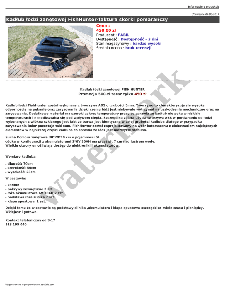 Informacje o produkcie Utworzono 04-03-2017 Kadłub łodzi zanętowej FishHunter-faktura skórki pomarańczy Cena : 450,00 zł er m ar k Producent : FABIL Dostępność : Dostępność - 3 dni Stan magazynowy : bardzo wysoki Średnia ocena : brak recenzji Kadłub łódki zanętowej FISH HUNTER Promocja 500 zł teraz tylko 450 zł Kadłub łodzi FishHunter został wykonany z tworzywa ABS o grubości 5mm. Tworzywo to charakteryzuje się wysoką odpornością na pękanie oraz zarysowania dzięki czemu łódź jest niebywale wytrzymał na uszkodzenia mechaniczne oraz na zarysowania. Dodatkowo materiał ma szeroki zakres temperatury pracy co sprawia że kadłub nie pęka w niskich temperaturach i nie odkształca się pod wpływem ciepła. Szczególną zaletą użycia tworzywa ABS w porównaniu do łodzi wykonanych z włókna szklanego jest fakt że barwa jest identyczna w całej grubości kadłuba dlatego w przypadku zarysowania kolor pozostaje taki sam. FishHunter został zaprojektowany na wzór katamaranu z ulokowaniem najcięższych elementów w najniższej części kadłuba co sprawia że łódź jest niezwykle stabilna. Sucha Komora zanętowa 30*20*10 cm o pojemności 5l. Łódka w konfiguracji z akumulatorami 2*6V 10AH ma prześwit 7 cm nad lustrem wody. Wielkie otwory umożliwiają dostęp do elektroniki i akumulatorów. ● ● ● długość: 70cm szerokość: 50cm wysokość: 23cm W zestawie: ● ● ● ● kadłub pokrywy zewnętrzne 2 szt łoże akumulatora 6V 10AH 2 szt. podstawa łoża silnika 2 szt. klapa spustowa 1 szt. w ● at Wymiary kadłuba: Dzięki temu że w zestawie są podstawy silnika ,akumulatora i klapa spustowa oszczędzisz wiele czasu i pieniędzy. Wklejasz i gotowe. Kontakt telefoniczny od 9-17 513 195 040 Wygenerowano w programie www.oscGold.com er m ar k at w w at er m ar k Informacje o produkcie Wygenerowano w programie www.oscGold.com er m ar k w at Gwarancja: 2 lata