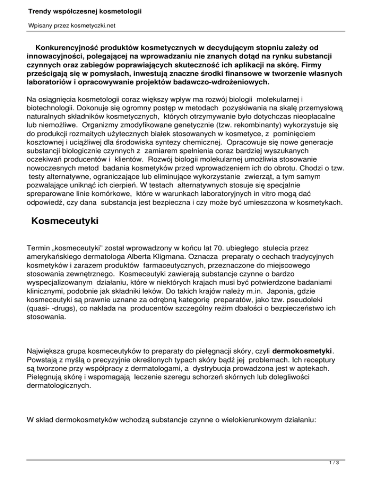 Trendy współczesnej kosmetologii Wpisany przez kosmetyczki.net Konkurencyjność produktów kosmetycznych w decydującym stopniu zależy od innowacyjności, polegającej na wprowadzaniu nie znanych dotąd na rynku substancji czynnych oraz zabiegów poprawiających skuteczność ich aplikacji na skórę. Firmy prześcigają się w pomysłach, inwestują znaczne środki finansowe w tworzenie własnych laboratoriów i opracowywanie projektów badawczo-wdrożeniowych. Na osiągnięcia kosmetologii coraz większy wpływ ma rozwój biologii molekularnej i biotechnologii. Dokonuje się ogromny postęp w metodach pozyskiwania na skalę przemysłową naturalnych składników kosmetycznych, których otrzymywanie było dotychczas nieopłacalne lub niemożliwe. Organizmy zmodyfikowane genetycznie (tzw. rekombinanty) wykorzystuje się do produkcji rozmaitych użytecznych białek stosowanych w kosmetyce, z pominięciem kosztownej i uciążliwej dla środowiska syntezy chemicznej. Opracowuje się nowe generacje substancji biologicznie czynnych z zamiarem spełnienia coraz bardziej wyszukanych oczekiwań producentów i klientów. Rozwój biologii molekularnej umożliwia stosowanie nowoczesnych metod badania kosmetyków przed wprowadzeniem ich do obrotu. Chodzi o tzw. testy alternatywne, ograniczające lub eliminujące wykorzystanie zwierząt, a tym samym pozwalające uniknąć ich cierpień. W testach alternatywnych stosuje się specjalnie spreparowane linie komórkowe, które w warunkach laboratoryjnych in vitro mogą dać odpowiedź, czy dana substancja jest bezpieczna i czy może być umieszczona w kosmetykach. Kosmeceutyki Termin „kosmeceutyki” został wprowadzony w końcu lat 70. ubiegłego stulecia przez amerykańskiego dermatologa Alberta Kligmana. Oznacza preparaty o cechach tradycyjnych kosmetyków i zarazem produktów farmaceutycznych, przeznaczone do miejscowego stosowania zewnętrznego. Kosmeceutyki zawierają substancje czynne o bardzo wyspecjalizowanym działaniu, które w niektórych krajach musi być potwierdzone badaniami klinicznymi, podobnie jak składniki leków. Do takich krajów należy m.in. Japonia, gdzie kosmeceutyki są prawnie uznane za odrębną kategorię preparatów, jako tzw. pseudoleki (quasi- -drugs), co nakłada na producentów szczególny reżim dbałości o bezpieczeństwo ich stosowania. Największa grupa kosmeceutyków to preparaty do pielęgnacji skóry, czyli dermokosmetyki. Powstają z myślą o precyzyjnie określonych typach skóry bądź jej problemach. Ich receptury są tworzone przy współpracy z dermatologami, a dystrybucja prowadzona jest w aptekach. Pielęgnują skórę i wspomagają leczenie szeregu schorzeń skórnych lub dolegliwości dermatologicznych. W skład dermokosmetyków wchodzą substancje czynne o wielokierunkowym działaniu: 1/3 Trendy współczesnej kosmetologii Wpisany przez kosmetyczki.net - opóźniającym naturalny proces starzenia się skóry (retinoidy, kwasy owocowe, przeciwutleniacze, koenzym Q10, fitohormony, melatonina, peptydy, czynniki wzrostu, cząsteczki sygnałowe, ochrona telomerów); - chroniącym przed promieniowaniem UVA i UVB; filtry mineralne (TiO2 i ZnO) występują w postaci zmikronizowanej, dzięki czemu są bardziej efektywne i nie pozostawiają na skórze białego filmu; - nawilżającym skórę (składniki NMF, alkohole wielowodorotlenowe, kwas hialuronowy, stymulatory akwaporyn); - rozjaśniającym przebarwienia skóry (hydrochinon, arbutyna, witamina C i jej pochodne); - przeciwzapalnym (ekstrakty roślinne, np. z rumianku, z kłączy kurkumy, glicyryzyna z korzenia lukrecji, olej z nasion kolendry); - regulującym proces rozkładu tłuszczów; stosowane w preparatach antycellulitowych (kofeina, L-karnityna, ekstrakty z alg morskich); - uszczelniającym naczynia krwionośne, np. ekstrakty z kasztanowca; - przeciwtrądzikowym (ekstrakty roślinne, substancje chemiczne). Na rynku występują też kosmeceutyki przeznaczone do włosów. Włosy są tkanką martwą, pozbawioną aktywności biologicznej. Nie posiadają mechanizmów ochronnych i regeneracyjnych, a w równym stopniu jak skóra narażone są na szkodliwe działanie czynników zewnętrznych, takich jak wysoka temperatura, promieniowanie UV, farby, środki rozjaśniające, wolne rodniki zawarte w smogu. Składniki aktywne obecne w szamponach, odżywkach, maskach czy lotionach to głównie oleje roślinne, ceramidy, witaminy (np. biotyna), hydrolizaty białek o powinowactwie do keratyny oraz związki stymulujące biosyntezę keratyny. Lecznicze działanie kosmeceutyków dotyczy włosów przetłuszczających się oraz problemów z łupieżem i wypadaniem włosów. Środki takie regulują szybkość wydzielania łoju i kontrolują populację mikroorganizmów wywołujących łojotokowe zapalenie skóry głowy. Najczęściej stosuje się substancje chemiczne (pirytonian cynku, ketokonazol, climbazol, siarkę), kwasy alginowe i alkohole z alg morskich regulujące pracę gruczołów łojowych oraz ekstrakty roślinne (z kłączy tataraku, liści pokrzywy, brzozy, bylicy bożego drzewka, korzeni łopianu, ziela krwawnika, czarnej rzepy). Na uwagę zasługują też olejki eteryczne, np. lawendowy, rozmarynowy, geraniowy. więcej w Cabines nr 48 [ źródło: www.cabines.pl ] 2/3 Trendy współczesnej kosmetologii Wpisany przez kosmetyczki.net Tekst zamieszczono za zgodą redakcji Cabines. // // // 3/3