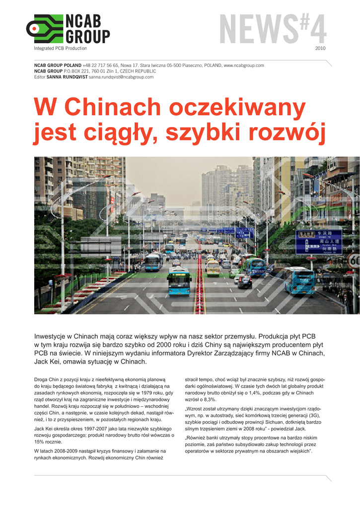 News 4 # 2010 NCAB GROUP POLAND +48 22 717 56 65, Nowa 17. Stara Iwiczna 05-500 Piaseczno, POLAND, www.ncabgroup.com NCAB GROUP P.O.BOX 221, 760 01 Zlín 1, CZECH REPUBLIC Editor SANNA RUNDQVIST [email protected] W Chinach oczekiwany jest ciągły, szybki rozwój Inwestycje w Chinach mają coraz większy wpływ na nasz sektor przemysłu. Produkcja płyt PCB w tym kraju rozwija się bardzo szybko od 2000 roku i dziś Chiny są największym producentem płyt PCB na świecie. W niniejszym wydaniu informatora Dyrektor Zarządzający firmy NCAB w Chinach, Jack Kei, omawia sytuację w Chinach. Droga Chin z pozycji kraju z nieefektywną ekonomią planową do kraju będącego światową fabryką z kwitnącą i działającą na zasadach rynkowych ekonomią, rozpoczęła się w 1979 roku, gdy rząd otworzył kraj na zagraniczne inwestycje i międzynarodowy handel. Rozwój kraju rozpoczął się w południowo – wschodniej części Chin, a następnie, w czasie kolejnych dekad, nastąpił również, i to z przyspieszeniem, w pozostałych regionach kraju. Jack Kei określa okres 1997-2007 jako lata niezwykle szybkiego rozwoju gospodarczego; produkt narodowy brutto rósł wówczas o 15% rocznie. W latach 2008-2009 nastąpił kryzys finansowy i załamanie na rynkach ekonomicznych. Rozwój ekonomiczny Chin również stracił tempo, choć wciąż był znacznie szybszy, niż rozwój gospodarki ogólnoświatowej. W czasie tych dwóch lat globalny produkt narodowy brutto obniżył się o 1,4%, podczas gdy w Chinach wzrósł o 8,3%. „Wzrost został utrzymany dzięki znaczącym inwestycjom rządowym, np. w autostrady, sieć komórkową trzeciej generacji (3G), szybkie pociągi i odbudowę prowincji Sichuan, dotkniętą bardzo silnym trzęsieniem ziemi w 2008 roku” - powiedział Jack. „Również banki utrzymały stopy procentowe na bardzo niskim poziomie, zaś państwo subsydiowało zakup technologii przez operatorów w sektorze prywatnym na obszarach wiejskich”. News#4 2010 Jack Kei Managing Director, Factory Management, NCAB Group China. Niska konsumpcja stanowi wyzwanie W tym roku widoczne są oznaki powrotu ekonomii do zdrowia po kryzysie i dla Chin prognozowany jest wzrost na poziomie 9,5%, w porównaniu z wartością globalnego wzrostu na poziomie 4%. Jednakże Jack przewiduje, że pomimo utrzymania wzrostu w Chinach na wysokim poziomie przez następne pięć lat, nie będzie on tak szybki, jak w dekadzie poprzedzającej kryzys. Ze względu na charakter chińskiej ekonomii, Jack nie przewiduje ponownego osiągnięcia wzrostu na poziomie15%. „Rząd realizuje znaczące inwestycje, podczas gdy konsumpcja pozostaje na niskim poziomie. Mamy bogate państwo z mniej bogatą ludnością” - powiedział. Polityka ekonomiczna w Chinach jest w związku z tym skupiona na zwiększaniu poziomu przychodów. W tym roku wzrosły one średnio o 17%, a koszty płac w kolejnych latach będą dalej rosły. „Zasadniczo jest to pozytywne dla ekonomii” - powiedział Jack. „Ludzie mają w kieszeni więcej pieniędzy przeznaczonych na konsumpcję, co sprawia, że ekonomia jest zdrowsza i stymulowana do dalszego rozwoju. Jednocześnie rząd będzie starał się utrzymać inflację na stabilnym poziomie”. Rosnąca wartość waluty Kolejnym aktualnym zagadnieniem jest kurs wymiany pomiędzy chińską walutą RMB, a dolarem amerykańskim. Stany Zjednoczone nie są zadowolone z polityki walutowej prowadzonej przez Chiny, uważają bowiem, że zapewnia ona Chinom nieuczciwe korzyści handlowe. Jack powiedział, że zasadniczo jest to zagadnienie, które powinni rozwiązać prezydent Obama i premier Wen. „Oczywiście śledzimy rozwój sytuacji. W tym roku kurs wymiany w stosunku do dolara spadł z 6,85 do 6,70 i myślę, że ten trend zostanie utrzymany. Ekonomiści twierdzą, że za kilka lat kurs wymiany ustali się na poziomie 6,50 pod warunkiem, że unikniemy nowej recesji”. Na pytanie, kiedy możemy się spodziewać demokratyzacji systemu politycznego, Jack odpowiedział, że obecny w Chinach trend, skierowany na zarabianie pieniędzy, będzie się utrzymywał przez jakiś czas. Zagadnienie rzeczywistej demokracji nie stanie się palącym problemem do czasu osiągnięcia przez ludność bardziej komfortowego standardu życia. Większe fabryki, mniej fabryk, Następna stro News#4 2010 Większe fabryki, mniej fabryk Anna Lothsson Strategic Purchasing Manager; Jim Liu, Factory Supervisor i Aaron Dai, QC Engineer z NCAB Group, spotkanie weryfikujące działania korygujące po wcześniejszym audycie w jednej z fabryk. Fabryki przetrwały kryzys Wracając do tematyki związanej z przemysłem PCB: działalność rozpoczęła się na skromną skalę w późnych latach 80-tych i w zasadzie nie rosła do 2000 roku. W latach poprzedzających kryzys ta gałąź przemysłu rosła średnio o 18% rocznie. W roku 2008 i 2009 nastąpił spadek o 5,2%, co było wciąż znacznie mniej, niż spadek rzędu prawie 15%, jaki odnotowano na skalę światową. Jack przypomina, że prawie każdy oczekiwał, że wiele fabryk produkujących płyty PCB zniknie. „Jednakże dziś mamy prawie taką samą ilość fabryk, jak przed kryzysem, około 3000. Wiele fabryk, około 20-30%, musiało zostać zamkniętych, ale ponieważ w Chinach był dostępny znaczny kapitał ryzyka, nowi inwestorzy pojawili się w momencie, gdy te fabryki bankrutowały” – powiedział Jack. Wysiłki państwa w budowaniu np. sieci komórkowej 3G pomogły w utrzymaniu zapotrzebowania na płyty PCB w czasie kryzysu. W roku 2010 rozpoczął się zdecydowany proces powrotu przemysłu PCB do stanu poprzedniego, ze wzrostem w Chinach na poziomie 18,6%, czyli o 5% lepiej, niż w całym światowym przemyśle PCB. Nowe fabryki położone w głębi kraju „To co wydarzy się w przeciągu następnych pięciu lat, to po pierwsze fakt, że nowe fabryki będą tworzone raczej w głębi kraju, w Chinach wschodnich, nie zaś na wybrzeżu” – powiedział Jack. „Wynika to z