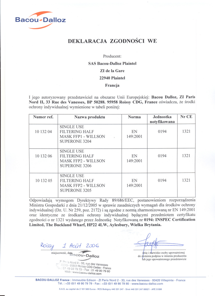 ~ Bacou.-Dalloz / DEKLARACJA ZGODNOSCI WE Producent: SAS Bacou-Dalloz Plaintel Zl de la Gare 22940 Plaintel Francja I jego autoryzowany przedstawiciel na obszarze Unii Europejskiej: Bacou Dalloz, Zl Paris Nord II, 33 Rue des Vanesses, BP 50288. 95958 Roissy CDG, France oswiadcza, ze srodki ochrony indywidualnej wymienione w tabeli ponizej: Jednostka notyfikowana SINGLE USE FILTERING HALF MASK FFP1 - WILLSON SUPERONE 3204 EN 149:2001 0194 1321 SINGLE USE FILTERING HALF MASK FFP2 - WILLSON SUPERONE 3206 EN 149:2001 0194 1321 SINGLE USE FILTERING HALF MASK FFP2 - WILLSON SUPERONE 3205 EN 149:2001 0194 1321 Nazwa produktu 10 13204 10 13206 1013205 NrCE Norma Numer ref. Odpowiadaja wymogom Dyrektywy Rady 89/686/EEC, postanowieniom rozporzadzenia Ministra Gospodarki z dnia 21/12/2005 w sprawie zasadniczych wymagan dla srodków ochrony indywidualnej (Dz. U. Nr 259, poz. 2172) i sa zgodne z norma zharmonizowana nr EN 149:2001 oraz identyczne ze srodkami ochrony indywidualnej bedacymi przedmiotem certyfikatu zgodnosci o nr 1321 wydanego przez Jednostke Notyfikowana nr 0194: lNSPEC Certification Limited, The Buckland Wharf, HP22 4LW, Aylesbury, Wielka Brytania. ~. j lloDf 2m~ : ~~~(j miejscowosc, d~acou ~ ~ 7 ':>, s Nord" ~ i/nie i rlazwisko osoby upowaznionej do zJ~zenia podpisu w imieniu producenta ub jego upowaznionego przedstawicie _ Dalloz -33, rue des Vanesses :.'..' >] - GS959 Roi$sy CDG Cedex - France . 01 <'!-9 80 79 79 - Fax: 01 49907980 Web: www.bacou-dlilloz.com BACOU-DALLOZFrance: Immeuble Edison - ZI Paris Nord 2 - 33, rue des Vanesses - 93420 Villepinte - France Tel. : +33 (0)1 49907979 - Fax: +33 (0)1 49907980 - www.bacou-dalloz.com SAS. au capital de 2 181 500 Euros. RCS Bobigny 440 331 247 . Siret 440 331 24700021 . APE 518M