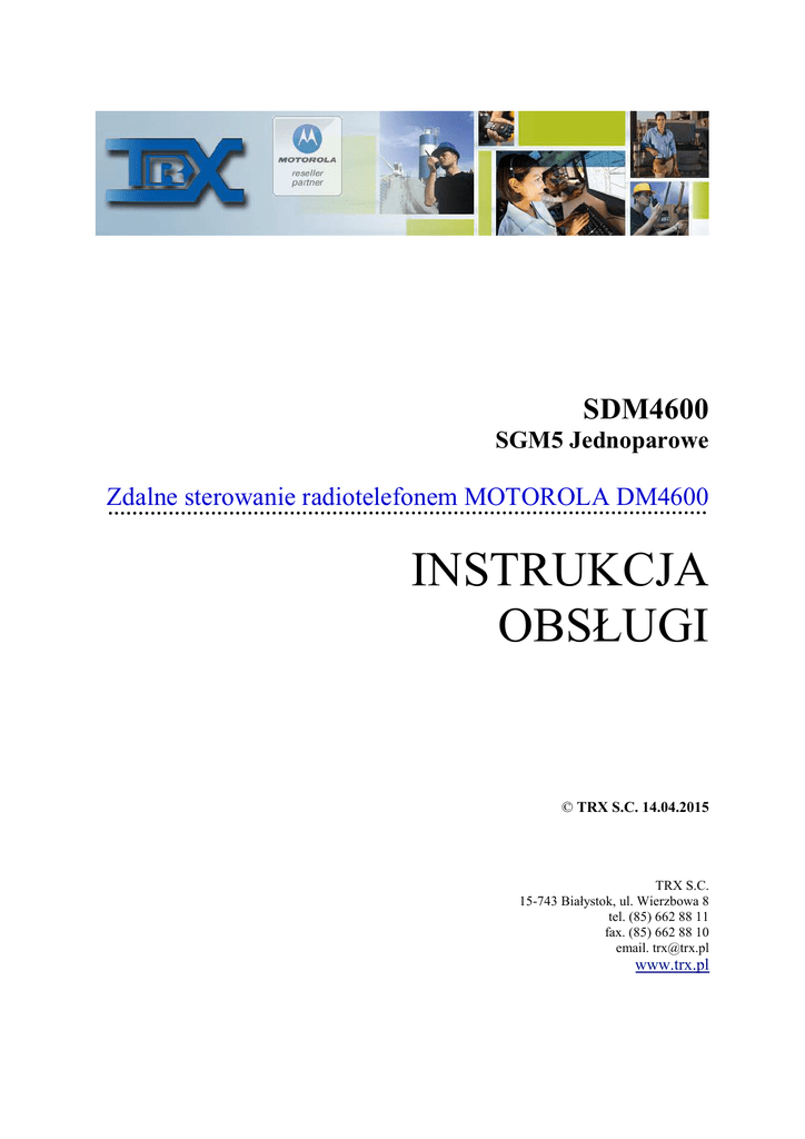 SDM4600 SGM5 Jednoparowe Zdalne sterowanie radiotelefonem MOTOROLA DM4600 INSTRUKCJA OBSŁUGI © TRX S.C. 14.04.2015 TRX S.C. 15-743 Białystok, ul. Wierzbowa 8 tel. (85) 662 88 11 fax. (85) 662 88 10 email. [email protected] www.trx.pl 1. OPIS OGÓLNY Urządzenie SGM5 w wersji SDM4600. Charakterystyka urządzenia Urządzenie SGM5 w wersji SDM4600 oferuje przeniesienie na odległość prawie wszystkich funkcji radiotelefonów Motorola DM 4600/4601. Daje możliwość nadawania i odsłuchiwania sygnału audio z danego radiotelefonu, odczyt zawartości wyświetlacza radia oraz korzystanie z dostępnej klawiatury radiotelefonu. Zdalne sterowanie daje możliwość przesyłania dwóch stanów logicznych do manipulatora SGM5, co pozwala na przesłanie informacji (np.: praca z baterii, włamania, niski poziom baterii lub inne). Dzięki opcjonalnemu modułowi do obsługi 4 pulpitów dodatkowych możemy mieć możliwość nadawania i odsłuchiwania sygnału audio z radiotelefonu. Urządzenie SGM5 w wersji SDM4600 z opcjonalnym modułem do podłączenia pulpitów dodatkowych. 3 1 Zdalne sterowanie SDM4600 składa się z dwóch części: modułu manipulatora oraz modułu nadawczo-odbiorczego. Moduł nadawczo odbiorczy Zintegrowany z modułem rozdzielającym radiotelefon PMLN 6404. Złącze RJ-11 6/2pin (linia) Wbudowane złącze do wykorzystania urządzenia jako przekaźnika informacji lub kontrolera innych urządzeń. Moduł manipulatora Zasilanie 230VAC / 12VDC (zasilacz wbudowany / zaciski akumulatora). Połączenie z manipulatorem radiotelefonu (złącze IDC 26 pin ). Złącze do rejestracji rozmów (linia analogowa RJ-11 6/2 pin). Złącze RJ-48 10p10c do połączenia mikrofonu biurkowego RMN5068 (serii GM). Złącze RJ-11 6/2pin (linia). Możliwość zamontowania opcjonalnego modułu do obsługi 4 pulpitów dodatkowych. Pulpit dodatkowy (opcjonalny) Możliwość nadawania i odsłuchiwania sygnału audio z danego radiotelefonu. Wbudowany mikrofon i głośnik. Maksymalna odległość pulpitu dodatkowego od modułu manipulatora do 1km na 1 parze. Zasilanie pulpitu dodatkowego 9-12VDC (zewnętrzny zasilacz). Złącze RJ-48 10p10c do połączenia mikrofonu biurkowego RMN5068 (serii GM). Dane techniczne SDM4600 Zasięg do 20 km – linia dzierżawiona (1 para) - złącze RJ-11 6/2 pin 5,4km dla skrętki ɸ 0,4mm 7,5 km dla skrętki ɸ 0,5mm 11,2 km dla skrętki ɸ 0,64mm 20,7 km dla skrętki ɸ 0,9mm Zgodne z TPH0562LC Wymiary modułu manipulatora: 220x130x45mm Moduł nadawczo-odbiorczy jest zintegrowany z modułem rozdzielającym PMLN 6404. 3 2 2. MODUŁ MANIPULATORA OPIS ZŁĄCZ I SYGNALIZATORÓW MODUŁU MANIPULATORA Moduł manipulatora SGM5 w wersji SDM.4600 1 – sygnalizacja zasilania 2 – sygnalizacja zasilania z baterii lokalnej (informuje nas o pracy z baterii lokalnej i świadczy o braku zasilania z sieci 230V. Powodem świecenia tej kontrolki może być brak prądu w sieci zasilającej 230V, spalony bezpiecznik B1 lub odłączony kabel łączący gniazdo zasilające z gniazdem sieci 230V) 3 – sygnalizacja poprawnej komunikacji cyfrowej w linii (lampka migająca powoli informuje - brak komunikacji (zbyt długa linia lub jej brak), migająca szybko – nawiązywanie połączenia trwające od kilku do kilkunastu sekund, świeci na stałe – połączenie nawiązane.) 4 – sygnalizacja stanu logicznego BAT.2 (proponowane do kontroli pracy z baterii części nadawczo-odbiorczej) 3 3 5 – sygnalizacja alarmu z wejścia ALARM 1 (tylko wtedy, gdy są podłączone w części nadawczo-odbiorczej) 6 – ALARM 2 - sygnalizacja rozłączenia linii przy włączonym radiu (ponowne podłączenie linii uruchomi radiotelefon) 7 – zaciski akumulatora (12VDC) 8 –gniazdo do opcjonalnego podłączenia mikrofonem biurkowym do serii radiotelefonów GM (złącze RJ-48 10p10c) 9 – gniazdo do połączenie z manipulatorem radiotelefonu poprzez panel rozdzielający radiotelefon PMLN 6404 - (złącze IDC 26 pin) 10 – gniazdo do podłączenia rejestratora rozmów (linia analogowa) RJ11 6/2 11 – gniazdo linii RJ11 6/2 linia przesyłowa - wewnętrzna para 12 – gniazdo zasilania 230VAC z bezpiecznikiem 1A 3 4 3. MODUŁ NADAWCZO-ODBIORCZY OPIS ZŁĄCZ I SYGNALIZATORÓW MODUŁU NADAWCZO-ODBIORCZEGO Moduł nadawczo-odbiorczy SGM5 w wersji SDM4600. 1 – sygnalizacja zasilania. 2 – sygnalizacja poprawnej komunikacji cyfrowej w linii 3 – gniazdo linii RJ11 6/2 linia - wewnętrzna para 3 5 4. SGM5 W WERSJI SDM4600 POŁĄCZENIE URZĄDZENIA SGM5 W WERSJI MOTOSDM Z RADIOTELEFONEM MOTOROLA Sposób podłączenia urządzenia SGM5 w wersji SDM4600 z radiotelefonem Motorola. 6 PRZEWÓD ŁĄCZĄCY MODUŁ MANIPULATORA Z MODUŁEM NADAWCZO-ODBIORCZYM. Kabel łączący moduł nadawczo-odbiorczy z modułem manipulatora (1para – np. linia dzierżawiona) KONFIGURACJA: Radiotelefony pracujące z urządzeniem SGM5 w wersji SDM4600 nie wymagają specjalnego programowania. 7 5. SGM5 W WERSJI SDM4600 Z PULPITAMI DODATKOWYMI Urządzenie SGM5 w wersji SDM4600 może być wyposażone w moduł do obsługi 4 pulpitów dodatkowych dających możliwość nadawania i odsłuchiwania sygnału audio radiotelefonu poprzez pulpit oddalony od modułu manipulatora maksymalnie 1km. Urządzenie SGM5 w wersji SDM4600 z opcjonalnym modułem do podłączenia pulpitów dodatkowych. Pulpit dodatkowy 8 Funkcje przycisków: PTT 1 – włącza nadawanie radiotelefonu PTT 2 – włącza komunikację lokalną (odsłuch w pulpicie głównym) PTT 3 – nieużywany PTT 4 – nieużywany Prawy przycisk mikrofonu biurkowego włącza nadawanie radiotelefonu. Lewy przycisk mikrofonu biurkowego włącza komunikację lokalną (odsłuch w pulpicie głównym) Programowanie pulpitu dodatkowego 4P (cztero-przyciskowego) Przełączenie trybu nasłuchu z innych pulpitów: - wyłączamy zasilanie pulpitu dodatkowego - naciskamy i trzymamy 4 przyciski PTT 1, PTT 2, PTT 3 i PTT 4 - włączamy zasilanie Zaczyna świecić dioda RX nad przyciskiem PTT 3, po 2 sekundach dioda