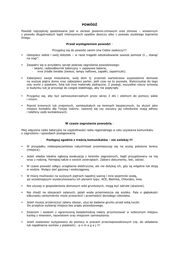 POWÓDŹ Powódź najczęściej spodziewana jest w okresie jesienno-zimowym oraz zimowo – wiosennym z powodu długotrwałych bądź intensywnych opadów deszczu albo z powodu szybkiego topnienia śniegu. Przed wystąpieniem powodzi : Przygotuj się do powodzi zanim ona Ciebie zaskoczy!!! Ubezpiecz siebie i swój dobytek – w razie tragedii odszkodowanie zawsze pomoże Ci „ stanąć na nogi”. Zaopatrz się w przydatny sprzęt podczas zagrożenia powodziowego: - latarki, radioodbiornik bateryjny + zapasowe baterie, inne źródła światła (świece, lampy naftowe, zapałki, zapalniczki). Zabezpiecz swoje mieszkanie, swój dom tj. przenieś wartościowe wyposażenie domowe na wyższe piętra domu oraz zabezpiecz parter, jeśli czas na to pozwala. Wykorzystaj do tego celu worki z piaskiem, folię lub inne materiały podręczne. Z posesji, wszystkie rzeczy schowaj w budynku lub je przywiąż do czegoś stabilnego, aby nie popłynęły. Przygotuj się, aby być samowystarczalnym przez okres 3 dni i zdolnym do pomocy sobie i innym. Poproś krewnych lub znajomych, zamieszkałych na terenach bezpiecznych, by służyli jako miejsce kontaktu dla Twojej rodziny. Upewnij się czy wszyscy jej członkowie znają adresy i telefony osób kontaktowych. W czasie zagrożenia powodzią : Miej włączone radio bateryjne na częstotliwości radia regionalnego w celu uzyskania komunikatu o zagrożeniu i sposobach postępowania. Postępuj zgodnie z treścią komunikatów - nie zwlekaj !!! W przypadku niebezpieczeństwa natychmiast przemieszczaj się na wyżej położone tereny (miejsca). Jeżeli władze lokalne ogłoszą ewakuację z terenów zagrożonych, bądź przygotowany na nią wraz z rodziną. Pamiętaj także o swoich zwierzętach. Zabierz dokumenty, leki, odzież. W czasie powodzi odłącz urządzenia elektryczne, ale nie dotykaj ich, gdy są wilgotne lub stoją w wodzie. Wyłącz sieć gazową i wodociągową. W miarę możliwości na wyższych piętrach napełnij wannę i inne pojemniki wodą, po wcześniejszym wysterylizowaniu ich płynami typu: ACE, Bielinka, Chlorobis, inne. Nie używaj w gospodarstwie domowym wód gruntowych, mogą być zatrute (skażone). Nie chodź na obszarach zalanych, jeżeli woda przemieszcza się szybko. Fala o głębokości kilkunastu centymetrów może przewrócić i przemieścić dorosłego człowieka. Jeżeli musisz przekroczyć zalany obszar, użyj do badania gruntu przed sobą tyczki. Do przejścia wybieraj miejsca bez prądu powodziowego. Dzieciom i osobom z ograniczoną świadomością należy przymocować w widocznym miejscu kartkę z imieniem, nazwiskiem oraz miejscem zamieszkania. Jeżeli zostaniesz wytypowany do pomocy w pracach przeciwpowodziowych (np. do układania lub napełniania worków z piaskiem) - p o m a g a j !!! W miarę możliwości zapobiegaj tworzeniu się atmosfery paniki, bądź rozsądny, zachowaj trzeźwość umysłu - to połowa sukcesu. Po powodzi : Jak najdłużej pozostań poza zasięgiem wód powodziowych, gdyż mogą być skażone np. produktami ropopochodnymi, nie oczyszczonymi ściekami, bakteriami chorobotwórczymi itp. Nie używaj ich do picia! Mogą być one również pod napięciem z uszkodzonych linii energetycznych napowietrznych lub podziemnych. Bądź ostrożny, gdy wjeżdżasz na tereny dotknięte powodzią. Drogi mogą być osłabione i nie wytrzymać ciężaru Twojego samochodu (ciągnika), czy innego pojazdu. Miej zawsze włączone radio w celu uzyskania informacji lokalnych, dotyczących udzielanej pomocy tj. zaopatrzenia w żywność i wodę zdatną do picia i użytku ogólnego. Zwracaj uwagę na zdrowie i bezpieczeństwo Twoje i Twojej rodziny. Często myj ręce mydłem w czystej wodzie, jeśli miałeś kontakt z wodami powodziowymi. Pamiętaj o wspomożeniu swoich sąsiadów, którzy mogą potrzebować specjalnej pomocy przy małych dzieciach, starszych lub przy niepełnosprawnych osobach. Wyrzuć żywność, która miała kontakt z wodami powodziowymi. Poinformuj odpowiednie służby o zerwanych liniach energetycznych, nieszczelności rurociągu gazowego lub o innych zagrożeniach występujących na Twoim terenie. Mieszkanie i wszystkie sprzęty, które przydatne są do dalszego użytkowania trzeba zdezynfekować, gdyż naniesiony muł zawiera duże ilości grzybów i bakterii chorobotwórczych, które zagrażają zdrowiu ludzi i zwierząt. Przygotuj do wymiany podłogi i mury, które nasiąkły wodami powodziowymi. Sprawdzaj czy fundamenty Twego domu nie mają pęknięć, aby upewnić się, że budynek nie grozi zawaleniem. Uważaj na poluzowane tynki, sufity. Odpompuj zalane piwnice stopniowo - około 1/3 pierwotnego poziomu wody dziennie - w celu uniknięcia zniszczenia struktury fundamentów. Dopilnuj, aby instalacje domowe; elektryczne, gazowe i wodno-kanalizacyjne zostały sprawdzone przez fachowców i ewentualnie naprawione przed ich ponownym użytkowaniem. Jeżeli byłeś ubezpieczony przed powodzią, skontaktuj się z firmą ubezpieczeniową, aby uniknąć nieporozumień z odszkodowaniami. Zrób zdjęcia zastanych zniszczeń - zarówno budynku, jak i wyposażenia.