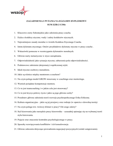 ZAGADNIENIA I PYTANIA NA EGZAMIN DYPLOMOWY SUM ZZR-2 CiMo 1. Kluczowe cnoty Sokratejskie jako założenia pracy coacha. 2. Etyka a kodeksy etyczne; wady i zalety kodeksów etycznych. 3. Najważniejsze zasady moralne w świetle Kodeksu Etycznego Coacha. 4. Istota dylematu etycznego. Omów przykładowe dylematy etyczne w pracy coacha . 5. Wskazówki pomocne w rozstrzyganiu dylematów moralnych. 6. Główne nurty metaetyczne w etyce zarządzania. 7. Odpowiedzialność jako sytuacja etyczna; zaburzenia pola odpowiedzialności. 8. Podstawowe założenia (aksjomaty) współczesnej etyki. 9. Ideał etyczno-osobowy menedżera. 10. Jakie są różnice między mentorem a coachem? 11. Na czym polega model GROW stosowany w coachingu oraz mentoringu. 12. Wymień pożądane kompetencje mentora. 13. Co to jest teamcoaching i w jakim celu jest stosowany? 14. Co to jest kryzys połowy życia i jakie są jego główne cechy? 15. Przedstaw główne założenia teorii rozwoju psychospołecznego Erika Eriksona. 16. Kultura organizacyjna – jakie są jej przejawy oraz rodzaje (w oparciu o dowolną teorię) 17. Na czym polega tzw. twórczy klimat w pracy? Od czego zależy? 18. Styl kierowania jako narzędzie pracy kierownika – uzasadnij opierając się na wybranej teorii stylu kierowania. 19. Pojęcie oraz znaczenie kontraktu psychologicznego w pracy. 20. Sposoby rozwiązywania konfliktów i ich konsekwencje. 21. Główne zalecenia dotyczące prowadzenia negocjacji pozycyjnych (sztuki ustępowania). 1 22. Jakie są najważniejsze zalecenia dotyczące prowadzenia negocjacji problemowych? 23. Jak skutecznie prowadzić mediacje? Omów podstawowe zalecenia. 24. Manipulacja i „brudne chwyty” w negocjacjach – przykłady; czy są skuteczne? 25. Podstawowe sposoby rozwiązywania konfliktów przez osoby neutralne. 26. Przedstaw problem współczesnego rynku pracy. Określ różnice między aktywną a pasywną metodą walki z bezrobociem. 27. Inflacja a deflacja: istota, skutki. Rodzaje inflacji oraz omów metody walki z inflacją. 28. Polityka fiskalna: istota, znaczenie, narzędzia. Różnica między polityką ekspansywną a restrykcyjną. 29. Polityka pieniężna: istota i znaczenie. Narzędzia stosowane w regulacji podaży pieniądza na rynek. 30. Zdefiniuj i przedstaw różnicę między wzrostem a rozwojem gospodarczym. Wymień mierniki wzrostu i rozwoju. 2