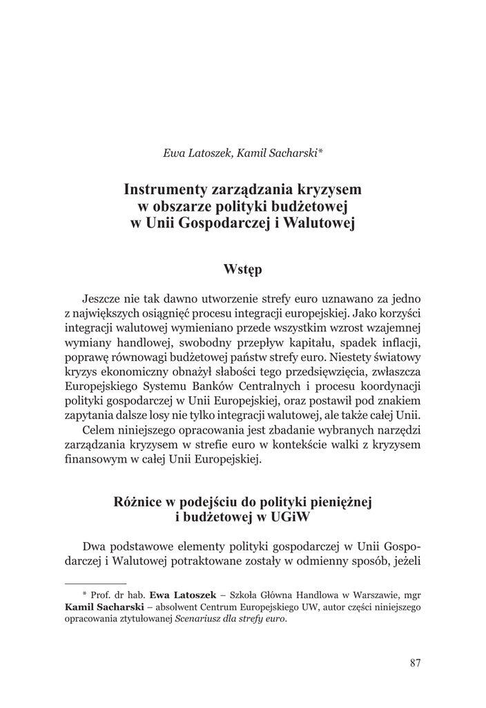 Ewa Latoszek, Kamil Sacharski* Instrumenty zarządzania kryzysem w obszarze polityki budżetowej w unii gospodarczej i walutowej wstęp Jeszcze nie tak dawno utworzenie strefy euro uznawano za jedno z największych osiągnięć procesu integracji europejskiej. Jako korzyści integracji walutowej wymieniano przede wszystkim wzrost wzajemnej wymiany handlowej, swobodny przepływ kapitału, spadek inflacji, poprawę równowagi budżetowej państw strefy euro. Niestety światowy kryzys ekonomiczny obnażył słabości tego przedsięwzięcia, zwłaszcza Europejskiego Systemu Banków Centralnych i procesu koordynacji polityki gospodarczej w Unii Europejskiej, oraz postawił pod znakiem zapytania dalsze losy nie tylko integracji walutowej, ale także całej Unii. Celem niniejszego opracowania jest zbadanie wybranych narzędzi zarządzania kryzysem w strefie euro w kontekście walki z kryzysem finansowym w całej Unii Europejskiej. różnice w podejściu do polityki pieniężnej i budżetowej w ugiw Dwa podstawowe elementy polityki gospodarczej w Unii Gospodarczej i Walutowej potraktowane zostały w odmienny sposób, jeżeli * Prof. dr hab. Ewa Latoszek – Szkoła Główna Handlowa w Warszawie, mgr Kamil Sacharski – absolwent Centrum Europejskiego UW, autor części niniejszego opracowania ztytułowanej Scenariusz dla strefy euro. 87 Studia Europejskie, 3/2013 chodzi o metodę ich prowadzenia. Polityką pieniężną steruje jedna instytucja – Europejski Bank Centralny, która została wyposażona w wiele atrybutów i narzędzi mających zapewnić skuteczne osiąganie celu inflacyjnego. EBC, jak wskazuje nazwa, to instytucja centralna. Nie koordynuje polityk państw członkowskich, lecz prowadzi własną politykę pieniężną w imieniu wszystkich członków UGiW. Można więc powiedzieć, że jest instytucją federalną. Za całość polityki gospodarczej w UGiW odpowiada zaś tzw. policy mix, w którym polityką pieniężną zarządza EBC, a polityką fiskalną – duża liczba silnych aktorów narodowych, o często sprzecznych strategiach i interesach.1 Inaczej rozwiązano kwestię polityki budżetowej w strefie euro. Kształtowanie dochodów i wydatków pozostawiono państwom, z wyłączeniem małego budżetu UE jako całości.2 Rozstrzygającym argumentem za stworzeniem takiego podziału zadań w zakresie polityki budżetowej są kwestie polityczne. Leokadia Oręziak wymienia wśród nich chęć samodzielnego decydowania o finansach publicznych, zachowanie wpływu na rozdział dóbr publicznych i wykorzystanie polityki budżetowej jako narzędzia w wewnętrznej walce politycznej. Ponadto nie bez znaczenia jest fakt, że w sytuacji cesji polityki pieniężnej na rzecz ponadnarodowego Europejskiego Banku Centralnego postrzegano politykę budżetową jako decydujący (i jedyny pozostający w rękach państwa narodowego) instrument umożliwiający reakcję na zagrożenia gospodarcze wynikające na przykład z kryzysów finansowych.3 Wobec braku politycznej możliwości ujednolicenia polityki budżetowej postawiono na półśrodek – jej koordynację. Jako podstawową przyczynę konieczności zastosowania jakiejś formy synchronizacji polityki budżetowej Oręziak wymienia ochronę przed „rozlaniem się” negatywnych skutków działań w jakiejś części jednolitego obszaru walutowego na pozostałe obszary. Taka konstrukcja umożliwia również wpływanie na polityki gospodarcze państw UE nienależących do J. Kaarlejärvi, Fiscal Policy without a State in EMU?, New York 2007, s. 29. W 2009 r. wynosił około 116 mld euro, co sytuuje go na poziomie budżetów Danii czy Grecji z tego okresu – por.: J. Woliński, Ile warty jest komisarz budżetowy, „Notabene” nr 5/2010, s. 13. 3 L. Oręziak, Finanse publiczne w krajach strefy euro – skuteczność mechanizmów dyscyplinujących politykę budżetową w: Euro – ekonomia i polityka, red. D. Rosati, Warszawa 2009, s. 48–49. 1 2 88 E. Latoszek, K. Sacharski, Instrumenty zarządzania kryzysem... UGiW (koordynację polityki budżetowej zapisano w traktatach obowiązujących wszystkie państwa członkowskie).4 traktatowe uwarunkowania polityki budżetowej w ue Podstawowym i najbardziej ogólnym odniesieniem do polityki gospodarczej w Traktacie o Unii Europejskiej jest zawarte w art. 3 stwierdzenie: „podstawą [rozwoju] Europy jest zrównoważony wzrost gospodarczy oraz stabilność cen (…)”. Konieczność prowadzenia skoordynowanej polityki gospodarczej i utrzymywania „zdrowych” finansów publicznych wyraża art. 119 TFUE.5 Oprócz tych ogólnych odwołań duże znaczenie mają regulacje zawarte w art. 120–126 TFUE. Wynika z nich konieczność dostosowywania polityk gospodarczych do ogólnych celów UE (art. 120), koordynacji polityk gospodarczych za pośrednictwem Rady Unii Europejskiej (art. 121), zakaz finansowania deficytów budżetowych przez banki centralne, w tym EBC (art. 123), a także nakaz unikania nadmiernego deficytu budżetowego wraz z przewidzianą procedurą na wypadek jego zaistnienia (art. 126). Procedurę nadmiernego deficytu uruchamia się w sytuacji, gdy państwo członkowskie przekroczy granice określone w Protokole 12 do TFUE. Już w Traktacie z Maastricht zapisane zostały tzw. kryteria konwergencji, które spełniać miały państwa członkowskie przyszłej Unii Gospodarczej i Walutowej. Dotyczyły utrzymywania na określonym poziomie inflacji, deficytu budżetowego, długu publicznego i długoterminowych stóp procentowych, a także udziału w systemie ERM II. W TFUE takimi granicami są: planowany lub rzeczywisty deficyt budżetowy w stosunku do PKB w cenach rynkowych powyżej 3% i dług publiczny w stosunku do PKB w cenach rynkowych przekraczający 60%.6 Zatem te dwie wartości obowiązują państwa członkowskie, jeżeli chodzi o prowadzenie „zdrowej” polityki budżetowej. L. Oręziak, Finanse Unii Europejskiej, Warszawa 2009, s. 28–29. Dz.Urz. WE, C 83/53, 30.08.2010 i Dz.Urz. WE, C 115