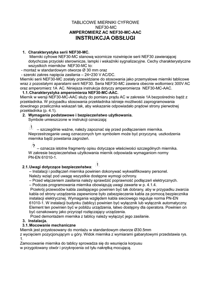 TABLICOWE MIERNIKI CYFROWE NEF30-MC AMPEROMIERZ AC NEF30-MC-AAC INSTRUKCJA OBSŁUGI 1. Charakterystyka serii NEF30-MC. Mierniki cyfrowe NEF30-MC stanową wzornicze rozwinięcie serii NEF30 zawierającej dotychczas przyciski sterownicze, lampki i wskaźniki sygnalizacyjne. Cechy charakterystyczne wszystkich mierników NEF30-MC to: - montaż w standardowym otworze Ø 30 mm oraz - szeroki zakres napięcia zasilania – 24÷230 V AC/DC. Mierniki serii NEF30-MC zostały przewidziane do stosowania jako przemysłowe mierniki tablicowe wraz z pozostałymi aparatami serii NEF30. Seria NEF30-MC zawiera obecnie woltomierz 300V AC oraz amperomierz 1A AC. Niniejsza instrukcja dotyczy amperomierza NEF30-MC-AAC. 1.1. Charakterystyka amperomierza NEF30-MC-AAC. Miernik w wersji NEF30-MC-AAC służy do pomiaru prądu AC w zakresie 1A bezpośrednio bądź z przekładnika. W przypadku stosowania przekładnika istnieje możliwość zaprogramowania dowolnego przelicznika wskazań tak, aby wskazanie odpowiadało prądowi strony pierwotnej przekładnika (p. 4.1). 2. Wymagania podstawowe i bezpieczeństwo użytkowania. Symbole umieszczone w instrukcji oznaczają: – szczególnie ważne, należy zapoznać się przed podłączeniem miernika. Nieprzestrzeganie uwag oznaczonych tym symbolem może być przyczyną uszkodzenia miernika bądź powstania zagrożeń. – oznacza istotne fragmenty opisu dotyczące właściwości szczególnych miernika. W zakresie bezpieczeństwa użytkowania miernik odpowiada wymaganiom normy PN-EN 61010-1. 2.1. Uwagi dotyczące bezpieczeństwa: – Instalacji i podłączeń miernika powinien dokonywać wykwalifikowany personel. Należy wziąć pod uwagę wszystkie dostępne wymogi ochrony. – Przed włączeniem zasilania należy sprawdzić poprawność podłączeń elektrycznych. – Podczas programowania miernika obowiązują uwagi zawarte w p. 4.1.4. Przekrój przewodów kabla zasilającego powinien być tak dobrany, aby w przypadku zwarcia kabla od strony urządzenia zapewnione było zabezpieczenie kabla za pomocą bezpiecznika instalacji elektrycznej. Wymagania względem kabla sieciowego reguluje norma PN-EN 61010-1. W instalacji budynku (tablicy) powinien być wyłącznik lub wyłącznik automatyczny. Element ten powinien być w pobliżu urządzenia, łatwo dostępny dla operatora. Powinien on być oznakowany jako przyrząd rozłączający urządzenia. Przed demontażem miernika z tablicy należy wyłączyć jego zasilanie. 3. Instalacja. 3.1. Mocowanie mechaniczne Miernik jest przystosowany do montażu w standardowym otworze Ø30.5mm z wycięciem pozycjonującym u góry. Widok miernika z wymiarami gabarytowymi przedstawia rys. 1. Zamocowanie miernika do tablicy sprowadza się do wsunięcia korpusu w przygotowany otwór i przykręcenia od tyłu nakrętką mocującą. Rys.1 3.2. Podłączenia elektryczne Miernik jest wyposażony w cztery zaciski przyłączowe śrubowe. Maksymalny przekrój przewodu – 1.5mm2. Końcówki przewodów linkowych zaleca się oblutować lub zastosować końcówki tulejkowe. Zasilanie należy podłączyć przewodem dwużyłowym, o średnicy przewodów zapewniającej jego zabezpieczenie za pomocą bezpiecznika instalacyjnego. Oznaczenia zacisków i połączenia elektryczne przedstawiono na rys.2. Rys.2 Biegunowość zasilania DC – dowolna. 4. Obsługa Po podłączeniu i podaniu zasilania miernik rozpoczyna normalną pracę. Przy ustawieniach fabrycznych prądowi 1A AC na wejściu odpowiada wskazanie 1.000A na wyświetlaczu. Jeżeli stosowany będzie przekładnik – przed zamontowaniem i rozpoczęciem eksploatacji miernik można przeprogramować postępując w sposób opisany w p. 4.1. Maksymalne wskazanie to zaprogramowany zakres + 1cyfra (dla ustawienia fabrycznego 1.001A). Dla wartości wyższych wyświetla się symbol przeciążenia OL--. Wartości wskazań poniżej 20 najmłodszych cyfr są zerowane. 4.1. Przeprogramowanie. 4.1.1. Informacje ogólne Ze względu na możliwość pracy amperomierza z przekładnikiem prądowym wprowadzono funkcję przeliczania wartości mierzonej tak, aby wartość odczytana odpowiadała wprost wartości prądu po stronie pierwotnej przekładnika. Zaprogramowanie przelicznika polega na wprowadzeniu za pomocą dwóch przycisków wartości odpowiadającej maksimum zakresu (faktycznemu prądowi wejścia równemu 1A). 4.1.2. Czynności przygotowawcze Przeprogramowanie miernika przeprowadza się po zdjęciu maskownicy przedniej przez podważenie jej specjalnym narzędziem dostarczanym w komplecie z miernikiem. Narzędzie pasuje do wgłębień na bokach maskownicy. Widok miernika od strony czołowej po zdjęciu maskownicy pokazano na rys. 3. Rys. 3 Uzyskujemy dostęp do dwóch przycisków typu TACT znajdujących się pod wyświetlaczem. Przyciski nie są oznakowane symbolami, ich działanie jest różne w zależności od wersji miernika. Dalej będą określane jako lewy „L” i prawy „P” (w widoku jak na rys.3). Miernik należy zasilić z uwzględnieniem uwag dotyczących bezpieczeństwa p. 4.1.4. 4.1.3. Przebieg programowania Po podaniu zasilania miernika powinno się pojawić wskazanie (zerowe, jeśli zerowy prąd wejścia pomiarowego). Bez wchodzenia w tryb programowania możemy krótkim wciśnięciem przycisku „P” wywołać na ok. 3s maksymalną wartość wskazań ustawioną poprzednio (fabrycznie 1.000A). W tryb programowania wchodzimy wciskając i przytrzymując przez ok. 3s przycisk „L”. W chwili wejścia w tryb programowania najstarsza cyfra zachowuje pełną jasność, pozostałe cyfry i kropka dziesiętna przygasają. W tym momencie należy zwolnić przycisk „L”. Odtąd działanie przycisków jest następujące: „L” – każde wciśnięcie powoduje rozjaśnienie kolejnej cyfry. Po cyfrze najmłodszej rozjaśnia się kropka dziesiętna. „P” – każde wciśnięcie powoduje inkrementację wartości rozjaśnionej cyfry, w przypadku kropki dziesiętnej zmianę jej położenia. Po ustawieniu pot
