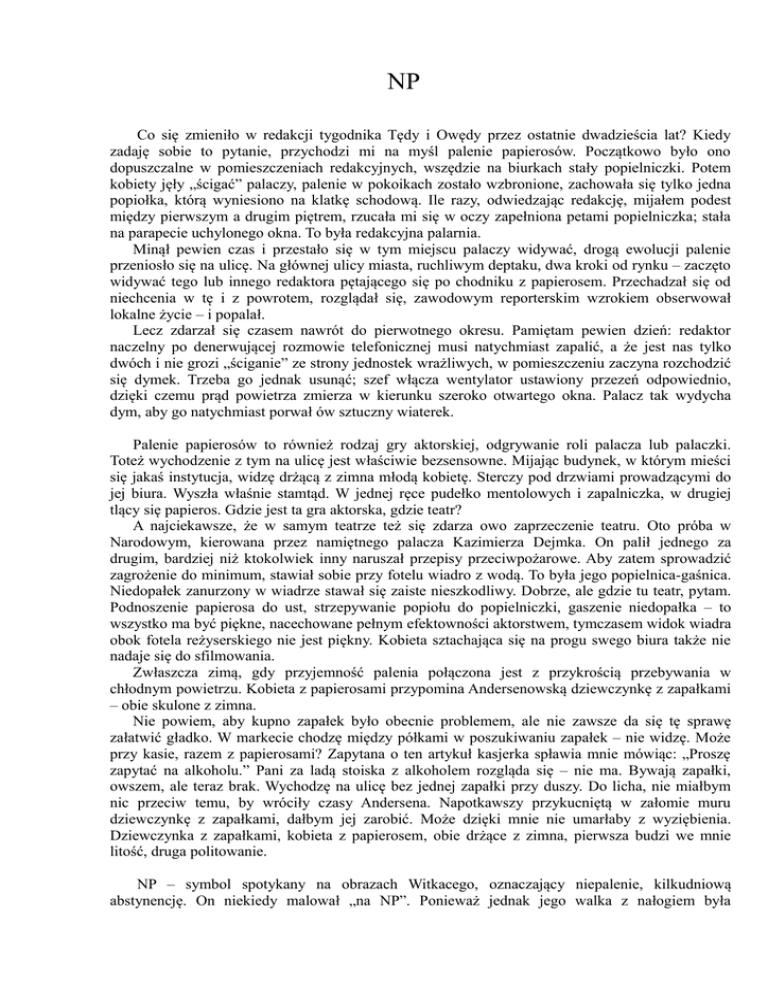NP Co się zmieniło w redakcji tygodnika Tędy i Owędy przez ostatnie dwadzieścia lat? Kiedy zadaję sobie to pytanie, przychodzi mi na myśl palenie papierosów. Początkowo było ono dopuszczalne w pomieszczeniach redakcyjnych, wszędzie na biurkach stały popielniczki. Potem kobiety jęły „ścigać” palaczy, palenie w pokoikach zostało wzbronione, zachowała się tylko jedna popiołka, którą wyniesiono na klatkę schodową. Ile razy, odwiedzając redakcję, mijałem podest między pierwszym a drugim piętrem, rzucała mi się w oczy zapełniona petami popielniczka; stała na parapecie uchylonego okna. To była redakcyjna palarnia. Minął pewien czas i przestało się w tym miejscu palaczy widywać, drogą ewolucji palenie przeniosło się na ulicę. Na głównej ulicy miasta, ruchliwym deptaku, dwa kroki od rynku – zaczęto widywać tego lub innego redaktora pętającego się po chodniku z papierosem. Przechadzał się od niechcenia w tę i z powrotem, rozglądał się, zawodowym reporterskim wzrokiem obserwował lokalne życie – i popalał. Lecz zdarzał się czasem nawrót do pierwotnego okresu. Pamiętam pewien dzień: redaktor naczelny po denerwującej rozmowie telefonicznej musi natychmiast zapalić, a że jest nas tylko dwóch i nie grozi „ściganie” ze strony jednostek wrażliwych, w pomieszczeniu zaczyna rozchodzić się dymek. Trzeba go jednak usunąć; szef włącza wentylator ustawiony przezeń odpowiednio, dzięki czemu prąd powietrza zmierza w kierunku szeroko otwartego okna. Palacz tak wydycha dym, aby go natychmiast porwał ów sztuczny wiaterek. Palenie papierosów to również rodzaj gry aktorskiej, odgrywanie roli palacza lub palaczki. Toteż wychodzenie z tym na ulicę jest właściwie bezsensowne. Mijając budynek, w którym mieści się jakaś instytucja, widzę drżącą z zimna młodą kobietę. Sterczy pod drzwiami prowadzącymi do jej biura. Wyszła właśnie stamtąd. W jednej ręce pudełko mentolowych i zapalniczka, w drugiej tlący się papieros. Gdzie jest ta gra aktorska, gdzie teatr? A najciekawsze, że w samym teatrze też się zdarza owo zaprzeczenie teatru. Oto próba w Narodowym, kierowana przez namiętnego palacza Kazimierza Dejmka. On palił jednego za drugim, bardziej niż ktokolwiek inny naruszał przepisy przeciwpożarowe. Aby zatem sprowadzić zagrożenie do minimum, stawiał sobie przy fotelu wiadro z wodą. To była jego popielnica-gaśnica. Niedopałek zanurzony w wiadrze stawał się zaiste nieszkodliwy. Dobrze, ale gdzie tu teatr, pytam. Podnoszenie papierosa do ust, strzepywanie popiołu do popielniczki, gaszenie niedopałka – to wszystko ma być piękne, nacechowane pełnym efektowności aktorstwem, tymczasem widok wiadra obok fotela reżyserskiego nie jest piękny. Kobieta sztachająca się na progu swego biura także nie nadaje się do sfilmowania. Zwłaszcza zimą, gdy przyjemność palenia połączona jest z przykrością przebywania w chłodnym powietrzu. Kobieta z papierosami przypomina Andersenowską dziewczynkę z zapałkami – obie skulone z zimna. Nie powiem, aby kupno zapałek było obecnie problemem, ale nie zawsze da się tę sprawę załatwić gładko. W markecie chodzę między półkami w poszukiwaniu zapałek – nie widzę. Może przy kasie, razem z papierosami? Zapytana o ten artykuł kasjerka spławia mnie mówiąc: „Proszę zapytać na alkoholu.” Pani za ladą stoiska z alkoholem rozgląda się – nie ma. Bywają zapałki, owszem, ale teraz brak. Wychodzę na ulicę bez jednej zapałki przy duszy. Do licha, nie miałbym nic przeciw temu, by wróciły czasy Andersena. Napotkawszy przykucniętą w załomie muru dziewczynkę z zapałkami, dałbym jej zarobić. Może dzięki mnie nie umarłaby z wyziębienia. Dziewczynka z zapałkami, kobieta z papierosem, obie drżące z zimna, pierwsza budzi we mnie litość, druga politowanie. NP – symbol spotykany na obrazach Witkacego, oznaczający niepalenie, kilkudniową abstynencję. On niekiedy malował „na NP”. Ponieważ jednak jego walka z nałogiem była bezskuteczna, Witkacowe malowanie i pisanie przebiegało przeważnie „na P”. W swoich Narkotykach ostrzega najpierw, że nikotyna niszczy rozum, po czym zwraca się ze specjalną apostrofą do kobiet: „A wy, baby, o rozum może wam nie chodzi tyle co nam, ale o skórę, tak.” Przyrównawszy damską skórę do aksamitu ostrzega czytelniczki, iż pod wpływem życia „na P” zmieni się on w szarą, wyschłą szmatę. O Witkacy, jak ty wspaniale przesadzasz. Toć baby wcale pod względem rozumu nie ustępują nam, a to, że spotyka się kobiety o aksamitnej skórze – czy ma coś wspólnego z NP? To cecha wrodzona, sprawa genów. Witkacego mimo wszystko, mimo głębokiego przekonania o katastrofalnych skutkach nikotynizmu, dziwiłaby obecna wrażliwość na wydechy z ust palaczy. Dzisiejsza alergia na zapach dymu papierosowego – jakież to niepodobne do dawnego stoickiego spokoju wobec tego samego zjawiska. Dmuchnęła mu dymem w twarz: – Zobaczysz, co potrafię. Tak się zabawiano w latach trzydziestych. Jest to cytat z Dróg wolności Sartre'a. Chełpliwe odezwanie się kokoty, której hojny klient wsunął trzy tysiącfrankowe papierki. Dmuchnięcie dymem w twarz było niemal wstępem do łóżkowych rozkoszy. Obecnie palący musi wykręcać jadaczkę w przeciwną stronę, wstydliwie wypuszczać dym, kierując jego strumień jak najdalej od nozdrzy abstynentów, najlepiej w kierunku uchylonego okna. Czasem i to nie wystarcza i biedny amator nikotyny czuje się zmuszony do wyjścia z pomieszczenia. Niechby pozwolił sobie na dmuchnięcie komuś w twarz – no! Nawet z własnego mieszkania, ściskając w garści paczkę szlugów i zapalniczkę, wymykają się na klatkę palacze. Pewna kobieta przy tej okazji straszyła sąsiadów. I może wzbudza strach w dalszym ciągu? Kolejność wykonywanych przez nią czynności jest następująca: wyjście z mieszkania wieczorową porą,