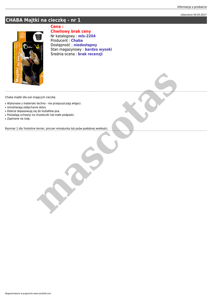 Informacje o produkcie Utworzono 04-03-2017 CHABA Majtki na cieczkę - nr 1 Cena : Chwilowy brak ceny s Nr katalogowy : mls-2204 Producent : Chaba Dostępność : niedostępny Stan magazynowy : bardzo wysoki Średnia ocena : brak recenzji ● ● ● ● ● co ta Chaba majtki dla suk mających cieczkę Wykonane z materiału techno - nie przepuszczają wilgoci. Umożliwiają oddychanie skóry Dobrze dopasowują się do kształtów psa. Posiadają uchwyty na chusteczki lub małe podpaski. Zapinane na rzep. m as Rozmiar 1 dla Yorkshire terrier, pinczer miniaturka lub psów podobnej wielkości. Wygenerowano w programie www.oscGold.com
