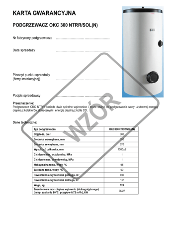 KARTA GWARANCYJNA PODGRZEWACZ OKC 300 NTRR/SOL(N) Nr fabryczny podgrzewacza ................................ ............................ Data sprzedaży ................................ ............................ Pieczęć punktu sprzedaży (firmy instalacyjnej) ................................ ............................ Podpis sprzedawcy ................................ ............................ Przeznaczenie: Podgrzewacz OKC NTRR posiada dwie spiralne wężownice i może służyć do podgrzewania wody użytkowej energią cieplną z kolektorów słonecznych i energią cieplną z kotła CO. Dane techniczne: Typ podgrzewacza OKC300NTRR/ SOL(N) Objętość, dm 3 300 Średnica wewnętrzna, mm 550 Średnica zewnętrzna, mm 670 Wysokość całkowita, mm 1580±2 Ciśnienie max. w zbiorniku, MPa 1 Ciśnienie max. w wężownicy, MPa 1 Maksymalna temp. wody, °C 95 Zalecana temp. wody, °C 60 Powierzchnia wymiennika górnego, m2 0,8 Powierzchnia wymiennika dolnego, m2 1,2 Waga, kg 124 Znamionowa moc cieplna wężownic (dolnego/górnego) (temp. zasilania 80°C, przepływ 0,72 m 3/h), kW 35/27 Ciepła woda 1 2 3 4 Zimna woda 1 - Zawór odcinający; 2 - Zawór bezpieczeństwa + zawór zwrotny; 3 - Naczynie przeponowe (min.12 dm3); 4 - Zawór spustowy Rys. 1. Schemat podłączenia podgrzewacza OKC do instalacji wody użytkowej. Wytyczne do montażu, transportu, składowania i użytkowania: a. b. c. d. Podgrzewacz OKC należy transportować i przechowywać w pozycji pionowej na palecie drewnianej. W czasie transportu należy pamiętać o właściwym zabezpieczeniu przed przemieszczaniem. Podgrzewacz OKC należy przechowywać w miejscu suchym, zadaszonym i nienarażonym na działanie opadów oraz warunków atmosferycznych. Orurowanie hydrauliczne podgrzewacza podłączyć według schematu podłączeniowego (rys.1). UWAGA: Brak zaworu bezpieczeństwa o ciśnieniu otwarcia podanym na tabliczce znamionowej podgrzewacza, może doprowadzić do zniszczenia podgrzewacza i powoduje utratę gwarancji. Poprawne działanie zaworu bezpieczeństwa należy kontrolować raz w miesiącu. Raz na rok kontrolować stan anody ochronnej i w przypadku jej zużycia w stopniu większym niż ½ należy wymienić. Zużyta w większym stopniu anoda może być przyczyną nie uznania ewentualnej reklamacji. Warunki gwarancji: Gwarant firma HEWALEX udziela gwarancji na prawidłowe działanie podgrzewacza przez okres 5 lat. 1. W okresie gwarancji użytkownikowi przysługuje prawo do bezpłatnych napraw uszkodzeń powstałych z winy producenta. 2. Usterki ujawnione i zgłoszone w okresie gwarancji do gwaranta tj. firmy Hewalex Sp. z o.o. Sp. kom. ul. Słowackiego 33, 43-502 Czechowice-Dziedzice, Tel.: (032) 2141710, fax: (032) 2145004, będą usunięte w ustalonym przez strony terminie nie dłuższym niż 14 dni roboczych od daty stwierdzenia przez producenta uszkodzenia podgrzewacza. 3. Klientowi przysługuje prawo do wymiany podgrzewacza, jeżeli stwierdzona wada nie jest możliwa do usunięcia w drodze naprawy. 4. Gwarancją nie są objęte: wady i niesprawności powstałe w wyniku niewłaściwego zamontowania (rys.1), wady i niesprawności powstałe w wyniku niewłaściwego użytkowania (brak kontroli lub wymiany anody magnezowej raz w roku potwierdzonej dokumentem), wady powstałe w wyniku napraw i przeróbek, które zostały dokonane przez osoby nieuprawnione, wszelkie uszkodzenia mechaniczne i wywołane nimi wady (w przypadku zgłaszania reklamacji opakowanie kartonowe musi być w nienaruszonym stanie), uszkodzenia powstałe na skutek pożaru, powodzi, uderzenia pioruna. 5. Karta gwarancyjna jest ważna wraz z dowodem zakupu. W przypadku reklamacji należy przedstawić zarówno dowód zakupu jak i odpowiednio wypełnioną kartę gwarancyjną. Akceptuję warunki gwarancji ...................................... ............. Podpis Klienta