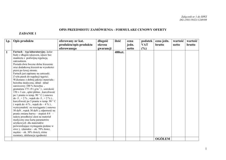 Załącznik nr 1 do SIWZ DG-2501/19321/1249/09 OPIS PRZEDMIOTU ZAMÓWIENIA - FORMULARZ CENOWY OFERTY ZADANIE 1 l.p. Opis produktu 1 Fartuch – typ laboratoryjny, kolor biały z długim rękawem, rękaw bez mankietu z podwójną regulacją zatrzaskiem. Posiada dwie boczne dolne kieszenie oraz dodatkową kieszeń na wysokości piersi po lewej stronie. Fartuch jest zapinany na zatrzaski. Z tyłu pasek do regulacji tęgości. Wykonany z dobrej jakości materiału : bawełna medyczna, skład: skład surowcowy 100 % bawełna , gramatura 175 ±9 ( g/m 2 ) , szerokość 150 ± 3 cm , splot płótno , kurczliwość po 1 praniu w temp. 90 ° C ( osnowa do -3 , + 2 % , wątek do -3 , + 2 % ) , kurczliwość po 5 praniu w temp. 90 ° C ( wątek do -4 % , wątek do – 4 % ) , wytrzymałość na rozciąganie ( osnowa 30 daN , wątek 30 daN ), odporność na pranie zmiana barwy – stopień 4/4 – naleŜy przedłoŜyć atest na materiał medyczny oraz kartę parametrów uŜytkowych dla materiałów potwierdzające wymagania podane w siwz ), (damskie – ok. 70% ilości, męskie – ok. 30% ilości), róŜne rozmiary, deklaracja zgodności oferowany nr kat. produktu/opis produktu oferowanego długość okresu gwarancji ilość cena jedn. netto podatek cena jedn. VAT brutto (%) wartość wartość netto brutto 400szt. OGÓŁEM 1 ZADANIE 2 l.p. Opis produktu 2 oferowany nr kat. produktu/opis produktu oferowanego długość okresu gwarancji ilość Ubrania laboratoryjne damskie w kolorze zielonym ( bluza + spodnie ) : bluza rękawy bez ściągacza , 2 kieszenie , zapinana na guziki , ze stójką , długi rękaw , długie spodnie , skład : 67 % poliestru , 33 % bawełny , gramatura 164 g naleŜy przedłoŜyć atest na materiał medyczny oraz kartę parametrów uŜytkowych dla materiałów potwierdzające wymagania podane w siwz 38 kompletów Ubrania laboratoryjne męskie w kolorze zielonym ( bluza + spodnie ) : bluza – zapinana na guziki , 2 kieszenie , wykładany kołnierz , długi rękaw , , długie spodnie , skład : 67 % poliestru , 33 % bawełny , gramatura 190 g naleŜy przedłoŜyć atest na materiał medyczny oraz kartę parametrów uŜytkowych dla materiałów potwierdzające 15 kompletów cena jedn. netto podatek cena jedn. VAT brutto (%) wartość wartość netto brutto 2 wymagania podane w siwz Ubrania laboratoryjne damskie w kolorze niebieskim ( bluza + spodnie ) bluza rękawy bez ściągacza , 2 kieszenie , zapinana na guziki , ze stójką , długi rękaw , długie spodnie: skład : 67 % poliestru , 33 % bawełny , gramatura 164 g naleŜy przedłoŜyć atest na materiał medyczny oraz kartę parametrów uŜytkowych dla materiałów potwierdzające wymagania podane w siwz 65 kompletów 32 komplety Ubrania laboratoryjne męskie w kolorze niebieskim ( bluza + spodnie ) : bluza – zapinana na guziki , 2 kieszenie , wykładany kołnierz , długi rękaw , , długie spodnie, skład : 67 % poliestru , 33 % bawełny , gramatura 190 g naleŜy przedłoŜyć atest na materiał medyczny oraz kartę parametrów uŜytkowych dla materiałów potwierdzające wymagania podane w siwz OGÓŁEM 3