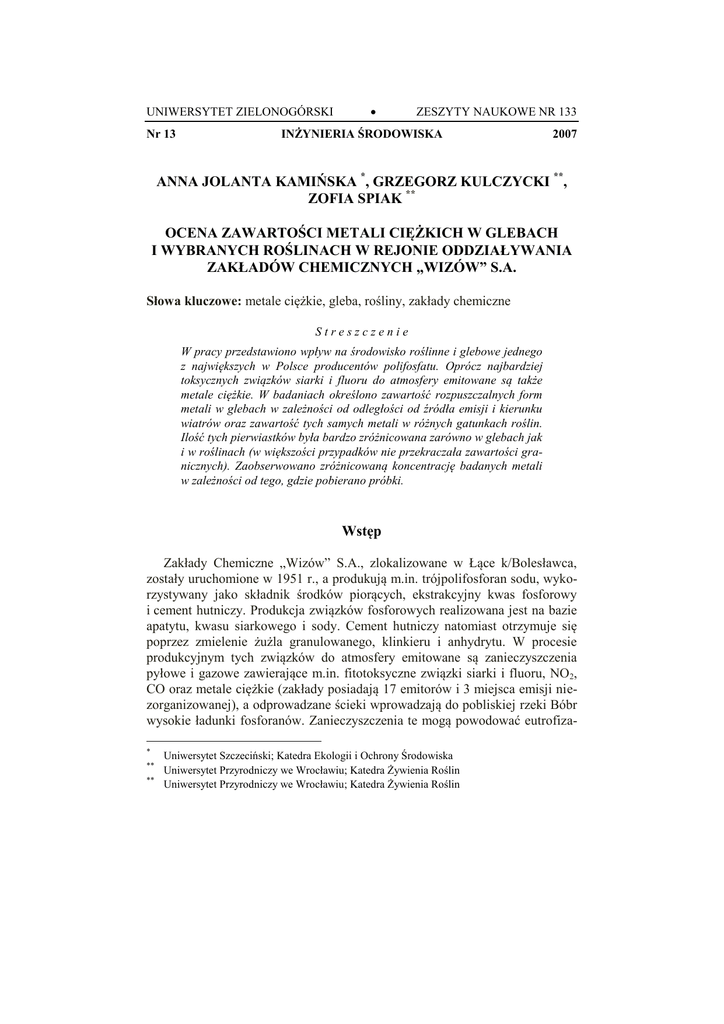 UNIWERSYTET ZIELONOGÓRSKI Nr 13 ZESZYTY NAUKOWE NR 133 INŻYNIERIA ŚRODOWISKA 2007 ANNA JOLANTA KAMIŃSKA *, GRZEGORZ KULCZYCKI **, ZOFIA SPIAK ** OCENA ZAWARTOŚCI METALI CIĘŻKICH W GLEBACH I WYBRANYCH ROŚLINACH W REJONIE ODDZIAŁYWANIA ZAKŁADÓW CHEMICZNYCH „WIZÓW” S.A. Słowa kluczowe: metale ciężkie, gleba, rośliny, zakłady chemiczne Streszczenie W pracy przedstawiono wpływ na środowisko roślinne i glebowe jednego z największych w Polsce producentów polifosfatu. Oprócz najbardziej toksycznych związków siarki i fluoru do atmosfery emitowane są także metale ciężkie. W badaniach określono zawartość rozpuszczalnych form metali w glebach w zależności od odległości od źródła emisji i kierunku wiatrów oraz zawartość tych samych metali w różnych gatunkach roślin. Ilość tych pierwiastków była bardzo zróżnicowana zarówno w glebach jak i w roślinach (w większości przypadków nie przekraczała zawartości granicznych). Zaobserwowano zróżnicowaną koncentrację badanych metali w zależności od tego, gdzie pobierano próbki. Wstęp Zakłady Chemiczne „Wizów” S.A., zlokalizowane w Łące k/Bolesławca, zostały uruchomione w 1951 r., a produkują m.in. trójpolifosforan sodu, wykorzystywany jako składnik środków piorących, ekstrakcyjny kwas fosforowy i cement hutniczy. Produkcja związków fosforowych realizowana jest na bazie apatytu, kwasu siarkowego i sody. Cement hutniczy natomiast otrzymuje się poprzez zmielenie żużla granulowanego, klinkieru i anhydrytu. W procesie produkcyjnym tych związków do atmosfery emitowane są zanieczyszczenia pyłowe i gazowe zawierające m.in. fitotoksyczne związki siarki i fluoru, NO2, CO oraz metale ciężkie (zakłady posiadają 17 emitorów i 3 miejsca emisji niezorganizowanej), a odprowadzane ścieki wprowadzają do pobliskiej rzeki Bóbr wysokie ładunki fosforanów. Zanieczyszczenia te mogą powodować eutrofiza* ** ** Uniwersytet Szczeciński; Katedra Ekologii i Ochrony Środowiska Uniwersytet Przyrodniczy we Wrocławiu; Katedra Żywienia Roślin Uniwersytet Przyrodniczy we Wrocławiu; Katedra Żywienia Roślin Ocena zawartości metali ciężkich w glebach … 193 cję wód, degradację chemiczną gleb oraz uszkodzenia aparatu asymilacyjnego roślin, a w efekcie obniżenie ich plonowania, stanowią także zagrożenie dla mieszkańców obszaru objętego emisją. Z tego też względu w 1990 r. „Wizów” został umieszczony na liście 80-ciu zakładów najbardziej uciążliwych dla środowiska. W tym samym roku zaniechano jednak produkcji kwasu siarkowego, więc uciążliwość zakładów ograniczyła się głównie do emisji fluoru. To właśnie fluor i siarka, a także makroelementy były dotychczas najważniejszymi elementami badań [Nowak i in. 1999]. Tym bardziej na szczególną uwagę zasługują metale ciężkie, gdyż ilość danych dotyczących ich występowania w rejonie oddziaływania tego zakładu jest stosunkowo niewielka. Materiał i metody badań W celu oceny rzeczywistego zanieczyszczenia środowiska metalami ciężkimi na obszarze objętym oddziaływaniem zakładów w 2002 r., w okresie wegetacji roślin, przeprowadzono badania zawartości form rozpuszczalnych m.in. kadmu, ołowiu, niklu, miedzi, cynku, manganu i żelaza w 1M HCl w glebach oraz koncentracji tych metali w wybranych roślinach (w niniejszej pracy przedstawiono jedynie wyniki badań w zakresie trzech pierwszych pierwiastków). Oznaczono także odczyn gleby w 1M KCl i określono zawartość ogólnych i przyswajalnych form makroskładników takich jak azot (tylko w materiale roślinnym), fosfor, potas, magnez i siarka oraz zawartość całkowitych i rozpuszczalnych form fluoru. Próbki glebowe pobrano z warstwy wierzchniej (0-20 cm) pól uprawnych i nieużytków usytuowanych w różnych kierunkach (N, NE, E, SE, S, SW, W i NW) i różnych odległościach od zakładu (150, 300, 500 i 1000 m). Próbki roślinne pobrano z tych samych punktów. Gleby wokół zakładu zaliczono do gleb lekkich o składzie granulometrycznym piasku gliniastego i gliny lekkiej. Materiał glebowy i roślinny do analiz chemicznych stanowił średnią z 8 prób pojedynczych, które dokładnie wymieszano i zhomogenizowano. Rośliny pobierano w różnych fazach rozwojowych w zależności od gatunku: ziemniaki – początek kwitnienia, rośliny zbożowe i trawy – strzelanie w źdźbło oraz gryka – faza kwitnienia. Zawartość form rozpuszczalnych metali ciężkich w glebach oznaczono ekstrahując je roztworem kwasu solnego o stężeniu 1mol∙dm-3 i w przesączu ilościowo oznaczano poszczególne metale metodą spektrofotometrii atomowoabsorpcyjnej na aparacie Spectra AA 220 Fast Sequential firmy Varian, zachowując właściwe parametry pomiaru dla poszczególnych metali. W przypadku zbyt dużych zawartości stosowano rozcieńczenia. W celu oznaczenia zawartości metali ciężkich w roślinach mineralizowano je na sucho w piecu muflowym 194 A. Kamińska, G. Kulczycki, Z. Spiak w temp. 550 ºC, a uzyskany popiół roztwarzano rozcieńczonym kwasem azotowym. Wyniki badań i dyskusja Przeprowadzone badania wykazały, że w obszarze oddziaływania zakładów dominują gleby zakwaszone (co może być spowodowane emisją do atmosfery związków siarki), nie zauważono jednak większego związku pomiędzy pH gleby, a odległością czy kierunkiem wiatru. Można natomiast przypuszczać, że na polach uprawnych odczyn w niewielkim stopniu był regulowany. Zasobność gleb w makroskładniki w większości przypadków mieściła się w granicach zawartości naturalnych, a w przypadku roślin zawartości makroelementów zależały od zasobności gleby i jej pH (w przypadku fosforu, potasu i azotu najczęściej były niższe niż zawartości optymalne, a w przypadku magnezu mieściły się w przedziale zawartości optymalnej). Ponadto w najbliższym otoczeniu zakładu stwierdzono w glebach podwyższoną zawartość fosforu, co mogło być spowodowa