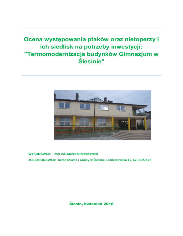 Ocena występowania ptaków oraz nietoperzy i ich siedlisk na potrzeby inwestycji: "Termomodernizacja budynków Gimnazjum w Ślesinie" WYKONAWCA: mgr inż. Marek Niezabitowski ZLECENIODAWCA: Urząd Miasta i Gminy w Ślesinie, ul.Kleczewska 15, 62-561Ślesin Ślesin, kwiecień 2016 Spis treści 1. Wstęp .................................................................................................. 3 2. Cel i zakres opracowania ................................................................... 4 3. Metodyka prowadzonych badań .......................................................... 4 4. WYBRANE ZAGADNIENIA DOTYCZĄCE OCHRONY PTAKÓW W BUDYNKACH ....... 4 4.1 Zasady stosowania skrzynek dla ptaków ................................................... 6 5.Przepisy prawne chroniące nietoperze w budynkach ........................... 7 6.Zalecenia ........................................................................................... 10 6.1 Gimnazjum w Ślesinie - zestawienie liczby i rozmieszczenia budek dla ptaków na poszczególnych elewacjach obiektu ............................................ 10 6.2 Gimnazjum w Ślesinie - zestawienie liczby i rozmieszczenia budek (schronów podtynkowych) dla nietoperzy na poszczególnych elewacjach obiektu .......................................................................................................... 12 7.Dokumentacja zdjęciowa.................................................................... 15 2 1. WSTĘP Szczeliny dylatacyjne między płytami, z których zbudowany jest budynek, niezabezpieczone otwory wentylacyjne, puste miejsca pod parapetami oraz przestrzenie między ścianami i rynnami, to miejsca, w których często swoje gniazda zakładają niektóre gatunki ptaków, a nietoperze zajmują jako dzienne schronienia, miejsca godów i rozrodu lub zimowiska. Podczas prac remontowych zamurowywane są żywcem ptaki siedzące na jajach, pisklęta oraz całe kolonie nietoperzy z młodymi. Zwierzęta giną w męczarniach z głodu i pragnienia. W jednym bloku może znajdować się kilkadziesiąt czynnych gniazd ptasich i schronienia setek nietoperzy. (źródło: Docieplanie budynków w zgodzie z zasadami ochrony przyrody, Polskie Towarzystwo Ochrony Przyrody „Salamandra ”, Poznań 2009) W związku ze zleceniem wykonania ekspertyz ornitologicznej oraz chiropterologicznej, związanych z występowaniem ptaków oraz nietoperzy (oraz potencjalnych miejsc ich występowania) w obrębie budynków Gimnazjum w Ślesinie, w dniu 19.03.2016 roku wykonane zostały oględziny ww. obiektu. Wykonana została również dokumentacja fotograficzna. Przedmiotem inwestycji jest termorenowacja budynków Gimnazjum w Ślesinie. Ryc. 1 Fragment ortofotomapy przedstawiający usytuowanie obiektu w Ślesinie 3 2. CEL I ZAKRES OPRACOWANIA Celem niniejszego opracowania jest zinwentaryzowanie miejsc, które mogłyby zostać wykorzystane przez ptaki oraz nietoperze m.in. do ukrycia, założenia gniazda, czy wyprowadzania kolonii rozrodczych, a które zostaną zlikwidowane na skutek prowadzonych prac budowlanych. Przy poszukiwaniu schronień ptaków i nietoperzy brane były w szczególności pod uwagę następujące miejsca, często wykorzystywane przez te zwierzęta: • przestrzenie pod parapetami i gzymsami; • przestrzenie pod blachą na stropodachu, zabezpieczającą ściany zewnętrzne przed zaciekaniem; • otwory wywietrzników; • przestrzenie między rynną, a ścianą. Ze względów metodycznych niniejsza opinia została podzielona na 2 części: 1. Część dotycząca ptaków (potencjalne miejsca gniazdowania, ślady po gniazdach, kompensacja przyrodnicza) 2. Część dotycząca nietoperzy (potencjalne miejsca schronień, ślady bytności, kompensacja przyrodnicza). 3. METODYKA PROWADZONYCH BADAŃ Podczas oględzin ww. obiektów pod kątem potencjalnych schronień nietoperzy w dniu19.03.2016 roku wykorzystano lornetkę oraz aparat z teleobiektywem, dzięki którym można było dostrzec m.in. szczeliny w ścianach, pod połaciami dachu i w innych miejscach, w których nietoperze mogą występować. Każde potencjalne miejsce zostało udokumentowane na załączonych fotografiach (szczeliny w ścianach, czy pomiędzy rynnami i ścianą budynku, otwory wentylacyjne). 4. WYBRANE ZAGADNIENIA DOTYCZĄCE OCHRONY PTAKÓW W BUDYNKACH Budynki stanowią miejsca gniazdowania kilkunastu gatunków ptaków. Dla kilku z nich jest to ich podstawowe miejsce lęgów. Należą do nich: wróbel, jerzyk i pustułka. Prowadzone na szeroką skalę remonty, docieplenia i różnego typu modernizacje budynków powodują ograniczenie liczby miejsc lęgowych i stanowią jedną z głównych lub wręcz podstawową przyczynę zaniku ich populacji. Przynajmniej więc w odniesieniu do tych gatunków ptaków, każde kolejne zmniejszenie liczby ich obecnych lub potencjalnych schronień i miejsc lęgowych stanowi znaczącą szkodę wg ustawy z dnia 13 kwietnia 2007 r. o zapobieganiu szkodom w środowisku i ich naprawie. Z tego powodu obowiązkiem inwestora jest podjęcie środków, które wynagrodzą chronionym gatunkom doznane straty. 4 Wróbel Passer domesticus Gniazduje najczęściej w różnego rodzaju szczelinach i zakamarkach budynków, czasami w budkach lęgowych, a wyjątkowo buduje gniazda także w gęstych krzewach. Gniazdo wróbla jest obficie wysłane suchą trawą oraz piórami. Sezon lęgowy tych ptaków zaczyna się w marcu, a kończy w sierpniu. W tym czasie ptak ten może wyprowadzić do trzech lęgów. Okres wysiadywania trwa bardzo krótko 11-14 dni, a młode przebywają w gnieździe około 14-16 dni. Jerzyk Apus apus Gniazda zakładają najchętniej w szczelinach budynków i w otworach wentylacyjnych, najczęściej pod samym dachem. Ich okres lęgowy trwa od początku maja do końca sierpnia, choć zdarzają się późne lęgi, z których młode wylatują dopiero w pierwszych dniach września. Ptaki te przystępują do jednego lęgu w roku. Okres wysiadywania jaj t
