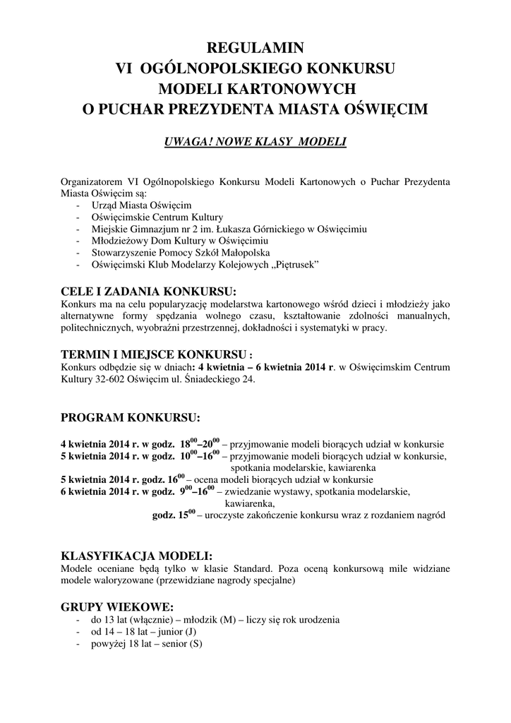 REGULAMIN VI OGÓLNOPOLSKIEGO KONKURSU MODELI KARTONOWYCH O PUCHAR PREZYDENTA MIASTA OŚWIĘCIM UWAGA! NOWE KLASY MODELI Organizatorem VI Ogólnopolskiego Konkursu Modeli Kartonowych o Puchar Prezydenta Miasta Oświęcim są: - Urząd Miasta Oświęcim - Oświęcimskie Centrum Kultury - Miejskie Gimnazjum nr 2 im. Łukasza Górnickiego w Oświęcimiu - Młodzieżowy Dom Kultury w Oświęcimiu - Stowarzyszenie Pomocy Szkół Małopolska - Oświęcimski Klub Modelarzy Kolejowych „Piętrusek” CELE I ZADANIA KONKURSU: Konkurs ma na celu popularyzację modelarstwa kartonowego wśród dzieci i młodzieży jako alternatywne formy spędzania wolnego czasu, kształtowanie zdolności manualnych, politechnicznych, wyobraźni przestrzennej, dokładności i systematyki w pracy. TERMIN I MIEJSCE KONKURSU : Konkurs odbędzie się w dniach: 4 kwietnia – 6 kwietnia 2014 r. w Oświęcimskim Centrum Kultury 32-602 Oświęcim ul. Śniadeckiego 24. PROGRAM KONKURSU: 4 kwietnia 2014 r. w godz. 1800–2000 – przyjmowanie modeli biorących udział w konkursie 5 kwietnia 2014 r. w godz. 1000–1600 – przyjmowanie modeli biorących udział w konkursie, spotkania modelarskie, kawiarenka 5 kwietnia 2014 r. godz. 1600 – ocena modeli biorących udział w konkursie 6 kwietnia 2014 r. w godz. 900–1600 – zwiedzanie wystawy, spotkania modelarskie, kawiarenka, 00 godz. 15 – uroczyste zakończenie konkursu wraz z rozdaniem nagród KLASYFIKACJA MODELI: Modele oceniane będą tylko w klasie Standard. Poza oceną konkursową mile widziane modele waloryzowane (przewidziane nagrody specjalne) GRUPY WIEKOWE: - do 13 lat (włącznie) – młodzik (M) – liczy się rok urodzenia od 14 – 18 lat – junior (J) powyżej 18 lat – senior (S) KLASY MODELI: - statki, okręty (MP) żaglowce (MŻ) samoloty jednosilnikowe śmigłowe (S1) samoloty wielosilnikowe śmigłowe oraz śmigłowce (S2) odrzutowce (S3) pojazdy kołowe, szynowe (PK) pojazdy gąsienicowe (PG) artyleria (MA) budowle (MB) budowle kolejowe (MK) figurki (MF) rakiety (MR) POSTANOWIENIA OGÓLNE: 1. 2. 3. 4. Udział biorą modelarze indywidualni, modelarnie, kluby modelarskie. Wystawiane modele mogą pochodzić z wycinanek polskich i zagranicznych. Mile widziane modele wystawiane po raz pierwszy. W przypadku wątpliwości co do autorstwa zgłoszonego modelu organizatorzy przewidują rozmowy wyjaśniające z zawodnikiem. 5. Każdy uczestnik może zgłosić do Konkursu nie więcej niż (4) modele. Nie więcej niż dwa w danej klasie. 6. Modele dostarczone są i odbierane na koszt własny uczestnika. 7. Organizator nie zapewnia noclegów uczestnikom Konkursu. ZASADY OCENY I NAGRODY: 1. Ocena modeli dokonana będzie przez powołaną przez organizatora komisję (wg zasad ustalonych przez komisję). 2. W grupie wiekowej młodzik trzy pierwsze miejsca nagrodzone są dyplomami oraz nagrodami rzeczowymi. 3. W grupie wiekowej junior oraz senior trzy pierwsze miejsca zostaną nagrodzone dyplomami. 4. Organizator przewiduje nagrody specjalne. 5. Organizator przewiduje Puchar Prezydenta Miasta Oświęcim za najlepiej wykonany model Konkursu oraz nagrody specjalne w poszczególnych grupach wiekowych. Uwaga! Wyniki ogłoszone przez Komisję są ostateczne i nie podlegają oprotestowaniu. Wszystkie informację można uzyskać pod numerem telefonu: 033/ 842-48-71 lub 0697734567 – Dariusz Pawlica 033/ 842-23-386 Miejskie Gimnazjum nr 2 im. Łukasza Górnickiego 32-600 Oświęcim ul. Olszewskiego 2 a 033/842-42-64 Młodzieżowy Dom Kultury w Oświęcimiu ul. Olszewskiego 1 Regulamin konkursu dostępny na stronie internetowej: www.ock.org.pl www.mdkoswiecim.pl www.mg2oswiecim.pl Oświęcim 2014 r.