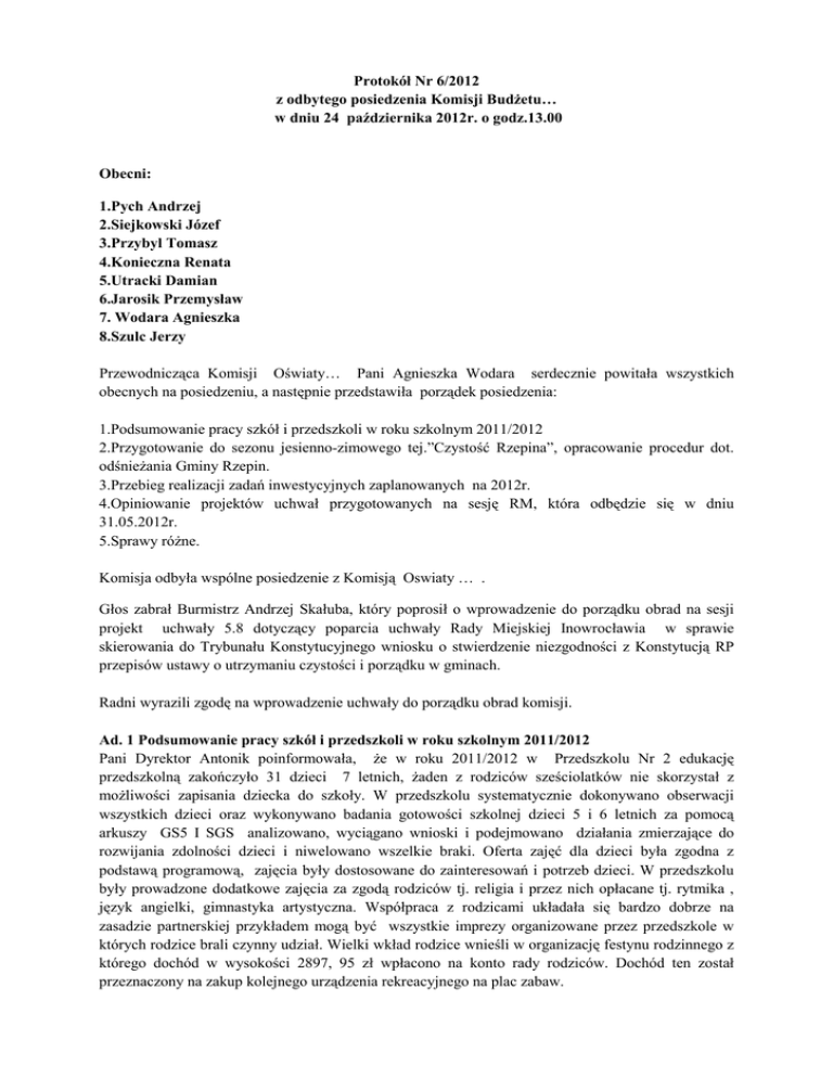 Protokół Nr 6/2012 z odbytego posiedzenia Komisji Budżetu… w dniu 24 października 2012r. o godz.13.00 Obecni: 1.Pych Andrzej 2.Siejkowski Józef 3.Przybyl Tomasz 4.Konieczna Renata 5.Utracki Damian 6.Jarosik Przemysław 7. Wodara Agnieszka 8.Szulc Jerzy Przewodnicząca Komisji Oświaty… Pani Agnieszka Wodara serdecznie powitała wszystkich obecnych na posiedzeniu, a następnie przedstawiła porządek posiedzenia: 1.Podsumowanie pracy szkół i przedszkoli w roku szkolnym 2011/2012 2.Przygotowanie do sezonu jesienno-zimowego tej.”Czystość Rzepina”, opracowanie procedur dot. odśnieżania Gminy Rzepin. 3.Przebieg realizacji zadań inwestycyjnych zaplanowanych na 2012r. 4.Opiniowanie projektów uchwał przygotowanych na sesję RM, która odbędzie się w dniu 31.05.2012r. 5.Sprawy różne. Komisja odbyła wspólne posiedzenie z Komisją Oswiaty … . Głos zabrał Burmistrz Andrzej Skałuba, który poprosił o wprowadzenie do porządku obrad na sesji projekt uchwały 5.8 dotyczący poparcia uchwały Rady Miejskiej Inowrocławia w sprawie skierowania do Trybunału Konstytucyjnego wniosku o stwierdzenie niezgodności z Konstytucją RP przepisów ustawy o utrzymaniu czystości i porządku w gminach. Radni wyrazili zgodę na wprowadzenie uchwały do porządku obrad komisji. Ad. 1 Podsumowanie pracy szkół i przedszkoli w roku szkolnym 2011/2012 Pani Dyrektor Antonik poinformowała, że w roku 2011/2012 w Przedszkolu Nr 2 edukację przedszkolną zakończyło 31 dzieci 7 letnich, żaden z rodziców sześciolatków nie skorzystał z możliwości zapisania dziecka do szkoły. W przedszkolu systematycznie dokonywano obserwacji wszystkich dzieci oraz wykonywano badania gotowości szkolnej dzieci 5 i 6 letnich za pomocą arkuszy GS5 I SGS analizowano, wyciągano wnioski i podejmowano działania zmierzające do rozwijania zdolności dzieci i niwelowano wszelkie braki. Oferta zajęć dla dzieci była zgodna z podstawą programową, zajęcia były dostosowane do zainteresowań i potrzeb dzieci. W przedszkolu były prowadzone dodatkowe zajęcia za zgodą rodziców tj. religia i przez nich opłacane tj. rytmika , język angielki, gimnastyka artystyczna. Współpraca z rodzicami układała się bardzo dobrze na zasadzie partnerskiej przykładem mogą być wszystkie imprezy organizowane przez przedszkole w których rodzice brali czynny udział. Wielki wkład rodzice wnieśli w organizację festynu rodzinnego z którego dochód w wysokości 2897, 95 zł wpłacono na konto rady rodziców. Dochód ten został przeznaczony na zakup kolejnego urządzenia rekreacyjnego na plac zabaw. Cele i zadania założone w pracy dydaktyczno wychowawczej przewidziane na rok 2011/2012 zostały zrealizowane. W ciągu roku szkolnego w przedszkolu obywało się wiele imprez, uroczystości i wycieczek - do Nowego Młyna na szlak bobrowy - parku dinozaurów - wycieczki tematyczne wg. Planu miesięcznego i rocznego Następnie Pani Dyrektor Antonik poinformowała, że do przedszkola zapraszane były teatr Maska i Pinokio do prezentacji kukiełkowych. Przedszkole korzystało z cyklicznych spotkań muzycznych. Organizowanych było wiele rożnych imprez. Dzieci brały udział w różnych konkursach . Następnie głos zabrała Pani Larek Dyrektor Przedszkola Nr 3, która poinformowała, że przedszkole pracowało w oparciu o podstawę programową, o program nauczania w przedszkolu, o plan roczny i miesięczny, Organizowanych było wiele imprez. Żadne dziecko 6 letnie nie poszło do szkoły. Zajęcia dodatkowe opłacane przez rodziców tj. nauka j. angielski, j. niemieckiego, nauka tańca towarzyskiego. Pani Dyrektor poinformowała, że zamierzony plan został wykonany. Dalej Pani Dyrektor informowała, że w czasie wakacji zostały wykonane duże remonty tzn. wyremontowano 2 łazienki dziecięce, remont magazynu żywnościowego gdzie zostało wbudowane duże okno , oraz remont łazienki dla personelu kuchennego Przedszkole przygotowuje się do uroczystości z okazji Dnia Niepodległości, organizowane będzie spotkanie połączone z występami artystycznymi dla sponsorów, zabawa andrzejkowa dla rodziców przy współpracy Rady Rodziców i wyjazd do teatru na bajkę Koziołek Matołek Następnie Radna Woda przeczytała pismo jakie skierowała do Burmistrza Rzepina „W związku z docierającymi do mnie niejasnymi informacjami , dotyczącymi ponoszonych kosztów dotacji (przez naszą gminę ) na dzieci uczęszczające do przedszkoli ościennych gmin zwracam się z prośba o udzielenie odpowiedzi na następujące pytania: 1. Czy do przedszkoli publicznych i niepublicznych ościennych gmin uczęszczają dzieci 5 i 6 letnie, zameldowane w gminie Rzepin? Jeśli tak jaka jest ich liczba oraz jakie miesięczne koszty ponosi z tego tytułu gmina Rzepin(proszę o imienną listę tych dzieci) Odp. Do przedszkoli ościennych gmin (dot. Gminy Słubice) uczęszczało w sierpniu tego roku 5 dzieci zamieszkałych na terenie gminy Rzepin 2 z Rzepina, 3 z Kowalowa. Dane za wrzesień będą znane pod koniec bieżącego miesiąca i mogą się różnić w stosunku do danych za miesiąc sierpień. Imienna lista dzieci może zostać udostępniona do wglądu w siedzibie ZEAS w Rzepinie. Tytułem zwrotu kosztów dotacji gmina Rzepin przekazała za miesiąc sierpień kwotę 2495 zł 2. Czy do przedszkoli publicznych i niepublicznych ościennych gmin uczęszczają także dzieci poniżej piątego roku życia , zameldowane w gminie Rzepin? Jeśli tak jaka jest ich liczba oraz jakie miesięczne koszty ponosi z tego tytułu gmina Rzepin. Odp. Organy innych jednostek samorządowych nie są zobowiązane do przekazywania gminom właściwym ze względu na miejsce zamieszkania dziecka danych dotyczących dzieci uczęszczających do przedszkoli tak jak ma to miejsce w przypadku szkół wszystkich typów. Stąd też gmina Rzepin nie posiada informacji od gmin ościennych ani od rodziców o uczęszczaniu dzieci zameldowanych na terenie gminy Rzepin do przedszk