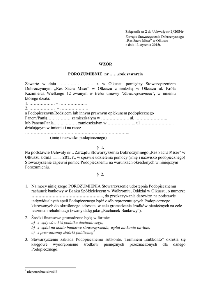 Załącznik nr 2 do Uchwały nr 2/2054r Zarządu Stowarzyszenia Dobroczynnego „Res Sacra Miser” w Olkuszu z dnia 13 stycznia 2015r. WZÓR POROZUMIENIE nr ……/rok zawarcia Zawarte w dniu ……………. …… r. w Olkuszu pomiędzy Stowarzyszeniem Dobroczynnym „Res Sacra Miser” w Olkuszu z siedzibą w Olkuszu ul. Króla Kazimierza Wielkiego 12 zwanym w treści umowy "Stowarzyszeniem", w imieniu którego działa: 1. ……………… – ……………….. 2. ……………… – ……………….. a Podopiecznym/Rodzicem lub innym prawnym opiekunem podopiecznego Panem/Panią……. ……… zamieszkałym w ……………….. ul. ………………….. lub Panem/Panią……. ……… zamieszkałym w ……………….. ul. ………………….. działającym w imieniu i na rzecz ……………………………………………………………….. (imię i nazwisko podopiecznego) § 1. Na podstawie Uchwały nr .. Zarządu Stowarzyszenia Dobroczynnego „Res Sacra Miser” w Olkuszu z dnia …. …. 201.. r., w sprawie udzielenia pomocy (imię i nazwisko podopiecznego) Stowarzyszenie zapewni pomoc Podopiecznemu na warunkach określonych w niniejszym Porozumieniu. § 2. 1. Na mocy niniejszego POROZUMIENIA Stowarzyszenie udostępnia Podopiecznemu rachunek bankowy w Banku Spółdzielczym w Wolbromiu, Oddział w Olkuszu, o numerze …………………………………………..., do przekazywania darowizn na podstawie indywidualnych apeli Podopiecznego bądź osób reprezentujących Podopiecznego kierowanych do określonego adresata, w celu gromadzenia środków pieniężnych na cele leczenia i rehabilitacji (zwany dalej jako „Rachunek Bankowy”). 2. Środki finansowe gromadzone będą w formie: a) z wpływów 1% podatku dochodowego, b) z wpłat na konto bankowe stowarzyszenia, wpłat na konto on-line, c) z prowadzonej zbiórki publicznej 1 3. Stowarzyszenie zakłada Podopiecznemu subkonto. Terminem „subkonto” określa się księgowe wyodrębnienie środków pieniężnych przeznaczonych dla danego Podopiecznego. 1 niepotrzebne skreślić § 2. Z tytułu udostępnienia Rachunku Bankowego oraz obsługi księgowej wpływów i rozchodów środków pieniężnych oraz innych kosztów Stowarzyszenie pobierze 10 % zebranej kwoty z przeznaczeniem na pokrycie kosztów i na cele statutowe Stowarzyszenia. § 3. Stowarzyszenie posiada status organizacji pożytku publicznego. Wpłaty 1% podatku Stowarzyszenie przyjmuje wg zasad Ustawy z dnia 24.04.2003 r. o działalności pożytku publicznego i o wolontariacie (tekst jednolity z 2010 Dz. U. nr 234, poz. 1536 z późn. zm.). § 5. 1. Środki pieniężne zgromadzone na subkoncie założonym dla podopiecznego wydatkowane będą w oparciu o Regulamin udzielania pomocy społecznej na cele leczenia i rehabilitacji Podopiecznym Stowarzyszenia Dobroczynnego „Res Sacra Miser” w Olkuszu. 2. Stowarzyszenie nie ponosi odpowiedzialności za żadne zobowiązania zaciągnięte przez Podopiecznego/Rodzica lub innego prawnego opiekuna podopiecznego nieuzgodnione z księgową lub z Zarządem Stowarzyszenia. 3. W sytuacjach szczególnych Stowarzyszenie może odstąpić od wymogów regulaminu jednak wówczas decyzję o wypłacie środków podejmuje Zarząd Stowarzyszenia. § 6. Podopieczny / Rodzic lub inny prawny opiekun Podopiecznego, będąc świadomym odpowiedzialności za podawanie fałszywych danych oświadcza, że podawane przez niego we wniosku o udzielenie pomocy społecznej i załączonej do niego dokumentacji informacje są zgodne ze stanem faktycznym. § 7. W sprawach nieuregulowanych POROZUMIENIEM mają zastosowanie przepisy Kodeksu Cywilnego i Kodeksu Rodzinnego. § 8. Nieprzestrzeganie przez którąkolwiek ze Stron ustaleń zawartych w POROZUMIENIU powoduje możliwość jego wypowiedzenia z zachowaniem jednomiesięcznego okresu wypowiedzenia. § 9. Środki pieniężne znajdujące się na subkoncie Podopiecznego mogą być, w wypadku rozwiązania POROZUMIENIA, lub upływu terminu, na które zostało zawarte, przekazane na subkonto Podopiecznego (otwarte na te same cele) do innej organizacji pozarządowej wskazanej przez Podopiecznego/Rodzica lub innego prawnego opiekuna Podopiecznego lub przy braku takiego wskazania, w ciągu trzech miesięcy – zostaną przeksięgowane na inne cele statutowe Stowarzyszenia. § 10. Niniejsze POROZUMIENIE zostało sporządzone egzemplarzach, po jednym dla każdej ze stron. w dwóch jednobrzmiących § 11. Zmiana POROZUMIENIA wymaga formy pisemnej zastrzeżonej pod rygorem nieważności. § 12. POROZUMIENIE zawarto na czas nieokreślony/na czas od ………. …………… …….. r. ….. r.. do § 13. 1. Każda ze stron może rozwiązać POROZUMIENIE z zachowaniem jednomiesięcznego terminu wypowiedzenia. 2. Każda ze stron może wypowiedzieć Porozumienie ze skutkiem natychmiastowym w przypadku nie wywiązania się przez drugą Stronę z zobowiązań wynikających z Porozumienia i Regulaminu. § 14. Integralną częścią niniejszego porozumienia jest zaakceptowany przez Podopiecznego/ Rodzica lub innego prawnego opiekuna Podopiecznego Regulamin udzielania pomocy społecznej na cele leczenia i rehabilitacji Podopiecznym Stowarzyszenia Dobroczynnego „Res Sacra Miser” w Olkuszu. § 15. POROZUMIENIE wchodzi w życie z dniem jego podpisania przez strony. ……………………………………….... ..................................................................... Podpisy osób upoważnionych do składania oświadczeń woli w imieniu Stowarzyszenia Podpis Podopiecznego/Rodzica lub innego prawnego opiekuna Podopiecznego Wyrażam zgodę na przetwarzanie moich danych osobowych oraz danych osobowych Podopiecznego zgodnie z ustawą z dnia 29 sierpnia 1997 r. o ochronie danych osobowych (t.j. Dz. U. z 2014 r. poz. 1182 z późn. zm.) w celu realizacji niniejszego Porozumienia. Administratorem danych osobowych w rozumieniu ww. ustawy jest Stowarzyszenie Dobroczynne „Res Sacra 