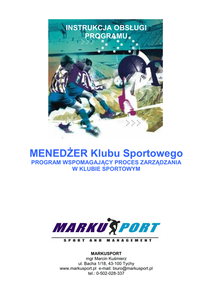 INSTRUKCJA OBSŁUGI PROGRAMU MENEDŻER Klubu Sportowego PROGRAM WSPOMAGAJĄCY PROCES ZARZĄDZANIA W KLUBIE SPORTOWYM MARKUSPORT mgr Marcin Kuśmierz ul. Bacha 1/18, 43-100 Tychy www.markusport.pl e-mail: [email protected] tel.: 0-502-028-337 MENEDŻER Klubu Sportowego program wspomagający proces zarządzania w klubie sportowym Wspomaganie zarządzania w klubie sportowym poprzez autorski program komputerowy Współczesne zarządzanie w klubie sportowym powinno być wspomagane programami informatycznymi, które w znacznym stopniu pozwalają na bardziej efektywne działanie. Prawie we wszystkich dziedzinach życia pomagają nam komputery. Kiedyś stacjonarne teraz coraz chętniej kupowane komputery przenośne pomagają ludziom w ich codziennej pracy. Bez ich pomocy nie da się już profesjonalnie prowadzić firmy czy przedsiębiorstwa. Informatyka coraz chętniej jest stosowana również przez podmioty prowadzące działalność sportową. Profesjonalny sport już dawno sięgną po rozwiązania informatyczne. Na podstawie kilkuletnich doświadczeń w zarządzaniu klubem sportowym oraz na podstawie przemyśleń i analiz powstał program wspomagający proces zarządzania. MENEDŻER Klubu Sportowego to autorskie rozwiązanie informatyczne, które pozwoli zebrać w jednym miejscu wszystkie najważniejsze dane potrzebne do prawidłowego zarządzania klubem. W kilka sekund można dotrzeć do wprowadzonych wcześniej informacji i swobodnie je edytować i drukować. Dodatkowo stworzona przez klub baza danych, wykorzystywana będzie w wielu procesach i procedurach działalności stowarzyszenia. Najważniejszą zaletą systemu jest prostota jego obsługi oraz oszczędność czasu. Całość opracowania podzielona jest na siedem rozdziałów tematycznych, są to: • Baza zawodników, • Baza umów, • Baza kontrahentów, • Składki członkowskie, • Terminarz, • Ewidencja sprzętu sportowego, Program ciągle będzie unowocześniany i będą dodawane do niego nowe funkcje, które będą dostępne do ściągnięcia ze strony internetowej poświęconej temu oprogramowaniu www.markusport.pl, W portalu będzie również oferowana będzie pomoc techniczna FAQ. Pierwsze kroki po instalacji Podczas pierwszego uruchomienia programu pojawi się komunikat aby w celu poprawnego funkcjonowania programu wpisać dane klubu w zakładce licencja. Okno dialogowe użytkownik Po wprowadzeniu prawidłowych danych klubu program będzie je przetwarzał np. przy procesach edycji z bazy umów . Dlatego bardzo ważne jest prawidłowe wpisanie danych. Przy edycji danych możliwe jest również wczytanie loga/herbu klubu jeżeli takie klub posiada. Rejestracja Aby program działał w pełnej wersji należy po jego zainstalowaniu wybrać z menu przycisk „Rejestracja” i wprowadzić kod wyjściowy załączony wraz z oryginalnym oprogramowaniem i wybrać „generuj kod przejściowy”. Ten kod należy wprowadzić do bazy oprogramowania rejestracji, która znajduje się na stronie internetowej autora: www.markusport.pl. Po wprowadzeniu kodu przejściowego zostanie wygenerowany na powyższej stronie kod bazowy, który należy wprowadzić w „Liście kodów rejestracyjnych” i zaakceptować wybierając „Sprawdź/zapisz”. Po prawidłowym wprowadzeniu kodu bazowego program będzie działał w pełnej wersji. Bez poprawnego przejścia przez fazę instalacji program będzie działał w wersji demonstracyjnej. Każdy program będzie można zainstalować tylko 2 razy, każdorazowe przenoszenie oprogramowania na inny komputer spowoduje jego zablokowanie. Aby dokonać odblokowania konieczne będzie skontaktowanie się z konsultantem poprzez w/w stronę internetową. Proces ten zabezpiecza oprogramowanie przed nielegalnym kopiowaniem. Zmiana nazw kluczowych sekcji oraz zespołów Program umożliwia zmianę nazw kluczowych wcześniej wprowadzonych sekcji oraz poszczególnych zespołów podczas zmieniających się faz rozgrywek i sezonu np. z nazwy drużyny „trampkarze starsi” na „juniorów” co jest konieczne przy udziale danej drużyny w kolejnych rozgrywkach nowego sezonu. Ta sama zasada obowiązuje przy zmianie nazewnictwa sekcji. Okno dialogowe zmiana nazw kluczowych 1. Kartoteka - Baza zawodników Każdy klub sportowy, aby spełniał swoje podstawowe funkcje musi posiadać zawodników. Reprezentują oni klub na zawodach i imprezach sportowych. Nie ma problemu z ewidencją jak ilość sekcji (2-3) oraz zawodników jest niewielka (15-30 osób). Problem zaczyna się pojawiać w momencie kiedy sekcji jest kilka a zawodników kilkadziesiąt lub kilkaset. Wtedy gromadzenie informacji dotyczących „swoich” zawodników staje się ogromnym problemem. Baza zawodników pozwala na zachowanie danych osobowych wszystkich zawodników i członków klubu. Można tworzyć kilkanaście sekcji sportowych a w każdej sekcji odpowiednie kategorie wiekowe zawodników czy drużyn. Kliknięciem myszki bardzo łatwo możemy odnaleźć zawodnika i niezbędne jego dane. Mogą one być modyfikowane i uzupełniane w dowolnym momencie. Z wprowadzonych elementów dokonuje się wydruki list zawodników, zgodnie z aktualnymi potrzebami – filtrując potrzebne dane do wydruku. Dodatkowym udogodnieniem jest możliwość umieszczenia w każdej kartotece zawodnika jego zdjęcia oraz danych kontaktowych. Poniżej przedstawiono widok kartoteki w bazie zawodników. Kartoteka – baza zawodników Dodaj sekcję Chcąc dodać sekcje do bazy należy wybrać „dodaj sekcję” i w oknie dialogowym należy wpisać nazwę i zatwierdzić. Wtedy w kartotece pojawi się sekcja. Program nie ma ograniczenia związanego z ilością wprowadzonych sekcji. Okno dialogowe wpis sekcji Dodaj drużynę W celu przyporządkowania drużyny do odpowiedniej sekcji należy przed dodaniem drużyny podświetlić nazwę już dodanej sekcji w kartotece. Następnie wybrać „dodaj druzynę”, wpisać nazwę lub kategorię drużyny i zatwierdzić. Dodana drużyna zostanie dopisa
