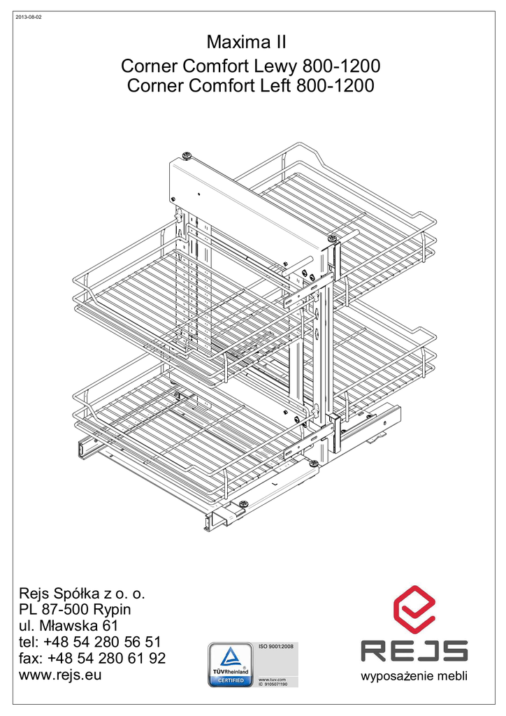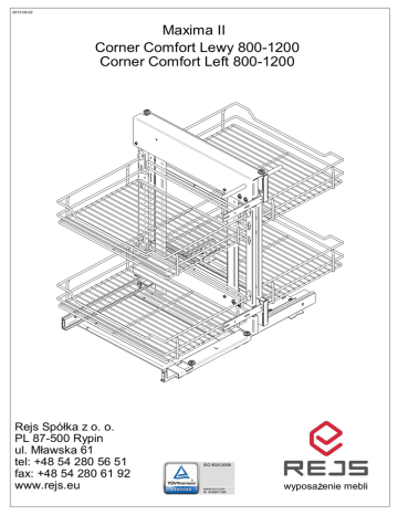 2013-08-02 Maxima II Corner Comfort Lewy 800-1200 Corner Comfort Left 800-1200 Rejs Spółka z o. o. PL 87-500 Rypin ul. Mławska 61 tel: +48 54 280 56 51 fax: +48 54 280 61 92 www.rejs.eu wyposa enie mebli A1 x1 247x446 347x446 CC 1000 347x446 CC 1200 447x446 CC 800 A9 x4 A6 x2 A4 x1 A3 x1 A2 x20 4x16 A5 x6 M5x6 2szt 2szt 4szt 4szt A10 x8 A7 x2 A8 x4 M6x12 Corner Comfort 800 * Corner Comfort 1000 ** Corner Comfort 1200 min 700 ,* min 800 ; ** min 1000 min 700 ,* min 800 ; ** min 1000 239, * 339 , **439 446 min 480 min 480 339, * 339 , **439 18 min 420,*min 465, ** min 540 18 2 min 420,*min 465, ** min 540 A1 x1 A2 x12 A3 x1 320 1 34 34 34 102 / *102/** 68 min 100 191 /*191/**258 191 /*191/**258 2-4 3 655 A4 x1 A5 x6 5 A2 x4 A6 x2 A7 x2 A8 x4 1 2 165 ° 90 575 410 90 ° 4 3 4 80 260 /*260/**360 340 /*340/**440 ~ 4 3-4 6 7 A2 x4 8 A9 x4 A10 x8 4-4