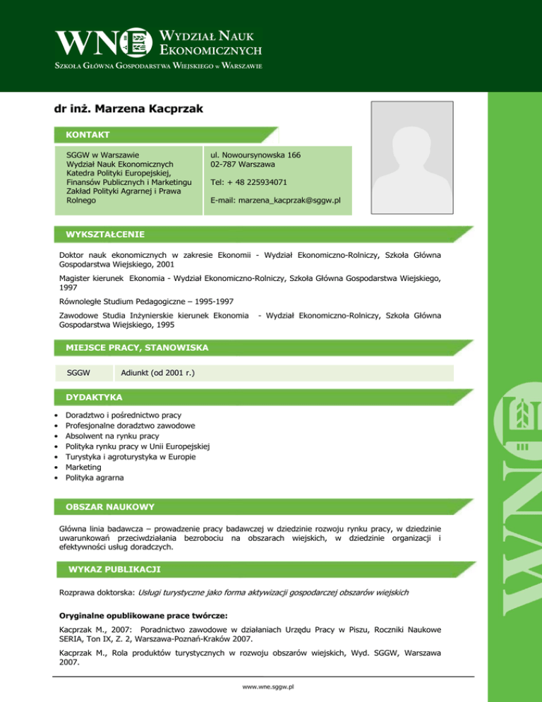 dr inż. Marzena Kacprzak KONTAKT SGGW w Warszawie Wydział Nauk Ekonomicznych Katedra Polityki Europejskiej, Finansów Publicznych i Marketingu Zakład Polityki Agrarnej i Prawa Rolnego ul. Nowoursynowska 166 02-787 Warszawa Tel: + 48 225934071 E-mail: [email protected] WYKSZTAŁCENIE Doktor nauk ekonomicznych w zakresie Ekonomii - Wydział Ekonomiczno-Rolniczy, Szkoła Główna Gospodarstwa Wiejskiego, 2001 Magister kierunek Ekonomia - Wydział Ekonomiczno-Rolniczy, Szkoła Główna Gospodarstwa Wiejskiego, 1997 Równoległe Studium Pedagogiczne – 1995-1997 Zawodowe Studia Inżynierskie kierunek Ekonomia Gospodarstwa Wiejskiego, 1995 - Wydział Ekonomiczno-Rolniczy, Szkoła Główna MIEJSCE PRACY, STANOWISKA SGGW Adiunkt (od 2001 r.) DYDAKTYKA • • • • • • • Doradztwo i pośrednictwo pracy Profesjonalne doradztwo zawodowe Absolwent na rynku pracy Polityka rynku pracy w Unii Europejskiej Turystyka i agroturystyka w Europie Marketing Polityka agrarna OBSZAR NAUKOWY Główna linia badawcza – prowadzenie pracy badawczej w dziedzinie rozwoju rynku pracy, w dziedzinie uwarunkowań przeciwdziałania bezrobociu na obszarach wiejskich, w dziedzinie organizacji i efektywności usług doradczych. WYKAZ PUBLIKACJI Rozprawa doktorska: Usługi turystyczne jako forma aktywizacji gospodarczej obszarów wiejskich Oryginalne opublikowane prace twórcze: Kacprzak M., 2007: Poradnictwo zawodowe w działaniach Urzędu Pracy w Piszu, Roczniki Naukowe SERIA, Ton IX, Z. 2, Warszawa-Poznań-Kraków 2007. Kacprzak M., Rola produktów turystycznych w rozwoju obszarów wiejskich, Wyd. SGGW, Warszawa 2007. www.wne.sggw.pl Kacprzak M., Rola produktów turystycznych w rozwoju obszarów wiejskich, Wyd. SGGW, Warszawa 2007. Kacprzak M., Aktywne formy rozwiązywania problemów bezrobocia na przykładzie działań powiatowych urzędów pracy, Wyd. Wieś Jutra, Warszawa 2008. Kacprzak M., Mikulska T.: Franchising w turystyce na przykładzie biura podróży TUI. SCIENTARIUM POLONORUM ACTA. Seria OECONOMIA 7 (2) 2008. Drejerska N., Kacprzak M., Sawicka J., 2008: Metodologia badań (współautorstwo rozdziału w monografii), Wyd. Wieś Jutra, Warszawa 2008. Kacprzak M., Szkolenia bezrobotnych jako instrument rynku pracy, Roczniki Naukowe SERIA, Tom X, Zeszyt 1, Lublin 2008. Kacprzak M.: Aktywne polityki rynku pracy w Polsce. SCIENTARIUM POLONORUM ACTA. Seria OECONOMIA 8 (1) 2009. Kacprzak M.: Kreowanie warunków dla rozwoju przedsiębiorczości przez gminne samorządy. SCIENTARIUM POLONORUM ACTA. Seria OECONOMIA 8 (3) 2009. Kacprzak M., Stępniewska A., Polsko-niemieckie stosunki gospodarcze na przykładzie krajów związkowych, Roczniki Naukowe SERiA. Tom XI. Zeszyt 5. Warszawa – Poznań – Olsztyn 2009. Kacprzak M., Rola funduszy unijnych w zachowaniu dziedzictwa kulturowego na przykładzie Chełmskiego Domu Kultury. SCIENTARIUM POLONORUM ACTA. Seria OECONOMIA 9 (4) 2010. Kacprzak M., Produkt turystyczny w opinii osób odwiedzających gminę Wołomin. Roczniki Naukowe SERIA. Tom XII. Zeszyt 4. Warszawa-Poznań-Świnoujście 2010. Kacprzak M., Mazurkieiwcz-Pizło A., Wybrane aspekty rynku pracy na obszarach wiejskich Polski w latach 2003-2010, Prace Naukowe Uniwersytetu Ekonomicznego we Wrocławiu 2011, Nr 168, Wrocław 2011. Sawicka J., Kacprzak M., Rykowska J., Should zloty be changed by euro? Threats and opportunities to the economy of Poland, Proceedings of the International Scientific Conference: Section New Trends in Finance. Nitra 2011. Kacprzak M., Kołodziejczyk A., Ocena jakości usług hotelarskich Hotelu Rialto, Zeszyty Naukowe WSTiJO nr 8 (2) 2011. Kacprzak M., Król A, Gralak K., TALENT MANAGEMENT AS AN ELEMENT OF AN ADVISORY PROCESS [w:] MANAGEMENT – LEADERSHIP – STRATEGY – COMPETITIVENESS, Szent István University, Gödöllő, Hungary 2012. Kacprzak M., Mróz K., Use Of The European Union Funds For Suport Of Local Economic Development On The Example Of The Wyszków Commune, NITRA 2012. Gralak K., Kacprzak M., Formy uczestnictwa młodzieży licealnej w ruchu turystycznym (przykład Włodawy i Lublina), Zeszyty Naukowe WSTiJO nr 9 (1) 2012. Kacprzak M., Wilczewska S., Parkour jako dyscyplina sportowo-rekreacyjna (część I), Wyd. Zeszyty Naukowe WSTiJO nr 10 (2) 2012. 2. Inne publikacje Kacprzak M., Doradca zawodowy w kulturze pracy [w:] Kultura pracy menedżera pod red. S. Milczarka. Wyd. Placet. Warszawa 2010. Iwan. B., Kacprzak M. (red. naukowa), Turystyka biznesowa. Determinanty rozwoju, Wyd. WSTiJO, Warszawa 2012. UDZIAŁ W ZESPOŁACH REALIZUJĄCYCH TEMATY BADAWCZE 1998-1999 – wykonawca, projekt badawczy „Kierunki działalności Ośrodka Doradztwa Rolniczego na rzecz optymalizacji zarządzania zasobami wiejskich gospodarstw domowych” 2000-2001 – główny wykonawca – projekt KBN „Usługi turystyczne jako forma aktywizacji gospodarczej obszarów wiejskich” 2004-2006 – wykonawca, międzynarodowy projekt „Ruralpro 2004-2006 – European Training Course for Future Professional Trainers of Regional and Rural Development” 2005-2007 – wykonawca, projekt EFS w ramach Sektorowego Programu Operacyjnego Rozwój Zasobów Ludzkich „Analiza i ocena sytuacji kobiet wiejskich na rynku pracy” 2010-2013 – główny wykonawca, Grant MNiSW „Warunki życia i praca kobiet na obszarach wiejskich”. www.wne.sggw.pl POSIADANE UPRAWNIENIA, UKOŃCZONE KURSY, SZKOLENIA seminarium „Edukacja Globalna”. seminarium „Kierunki i wizje rozwoju doradztwa kariery w erze nowych technologii”. seminarium nt. „Upowszechnianie wdrażania standardów jakości w turystyce” ze szczególnym uwzględnieniem systemów zarządzania. warsztaty metodyczne „Wolontariat w szkole sposobem na rozwój kompetencji społecznych uczniów i nauczycieli”. warsztaty szkoleniowe pracowników naukowo-dydaktycznych kształcących kadry dla turystyki. szkolenie nt. możliwości, zasad i sposobów wykorzystania środków z funduszy strukturalnych oraz pozostałych zewnętrznych źródeł finansowych