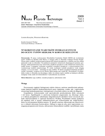 Nauka Przyroda Technologie ISSN 1897-7820 http://www.npt.up-poznan.net 2009 Tom 3 Zeszyt 3 Dział: Melioracje i Inżynieria Środowiska Copyright ©Wydawnictwo Uniwersytetu Przyrodniczego w Poznaniu LESZEK KSIĄŻEK, WOJCIECH BARTNIK Katedra Inżynierii Wodnej Uniwersytet Rolniczy w Krakowie WYKORZYSTANIE WARUNKÓW HYDRAULICZNYCH DO OCENY TYPÓW SIEDLISK W KORYCIE RZECZNYM Streszczenie. W pracy wykorzystano Mesohabitat Evaluation Model (MEM) do wyróżnienia typów siedlisk na odcinku rzeki Skawy w zasięgu cofki ze zbiornika wodnego Świnna Poręba. Ocena typów siedlisk została przeprowadzona dla różnych przepływów z efektem oraz bez efektu piętrzenia wody na zbiorniku. Na podstawie pomiarów terenowych obejmujących pomiary geodezyjne, skład granulometryczny rumowiska, prędkości przepływu wody zbudowano numeryczny model terenu, a następnie wykonano symulacje warunków przepływu z wykorzystaniem dwuwymiarowego modelu numerycznego. W czasie wezbrania warunki przepływu wody ulegają zmianie, a co za tym idzie – zmieniają się typy siedlisk. W takich warunkach dominuje przepływ szybki i normalny, zwiększa się też obszar, gdzie panuje nurt wartki RF. Stwierdzono, że gospodarka wodna w zbiorniku ma decydujący wpływ na zmiany typów siedlisk na badanym odcinku; następuje wtedy zanik ich różnorodności i wykształcenie się zastoisk. Słowa kluczowe: typy siedlisk, warunki przepływu, udrożnienie rzeki Wstęp Przywracanie ciągłości biologicznej cieków dotyczy zarówno umożliwienia pokonywania piętrzeń budowli hydrotechnicznych przez organizmy wodne, jak i zapewnienia równowagi hydrodynamicznej i ekologicznej w korytach cieków na całej ich długości. Gospodarcze wykorzystanie rzek spowodowało przekształcenia dolin rzecznych i ich koryt. Zapobieganie w pierwszej kolejności pogarszaniu się obecnego stanu, a w dalszej perspektywie udrażnianie zdegradowanych odcinków koryt rzecznych znalazło odzwierciedlenie w zapisach Dyrektywy Wodnej. Przykładem zmiany podejścia do regulacji rzek w terenie zurbanizowanym jest wykorzystanie np. stopni-bystrzy, które są rozwiązaniem bliskim naturze. W sposób sztuczny odtwarzają one obserwowane w ciekach sekwencje bystrze-ploso. Zabiegi te mają na celu, przy zapewnieniu wymaganej przepustowości koryta, odtwarzanie różnorodności siedlisk i przybliżanie stanu 2 Książek L., Bartnik W., 2009. Wykorzystanie warunków hydraulicznych do oceny typów siedlisk w korycie rzecznym. Nauka Przyr. Technol. 3, 3, #89. koryta do warunków naturalnych. Ocena stanu biologicznego staje się ważnym elementem udrażniania rzek. Ocena typów siedlisk służy do porównania odcinków rzek, jak również na etapie projektowania do prognozowania oddziaływania na środowisko. Przykładem narzędzia do oceny typów siedlisk jest Mesohabitat Evaluation Model (MEM) (HAUER i IN. 2008). Model ten na podstawie reżimu przepływu wody pozwala na ocenę warunków siedliskowych. Wykorzystując prędkość przepływu wody, głębokość oraz naprężenia styczne na dnie, pozwala wyróżnić sześć typów siedlisk odpowiadających różnym warunkom przepływu wody: wartki nurt, przepływ szybki, przepływ normalny, przepływ spokojny, zastoiska oraz płytka woda. Parametry przepływu są określane lokalnie na podstawie modelowania numerycznego. Materiał i metody Do sprawdzenia możliwości wykorzystania modelu MEM do oceny typów siedlisk został wybrany odcinek rzeki Skawy w zasięgu cofki zbiornika Świnna Poręba. Badany odcinek położony jest w gminie Zembrzyce i zamyka zlewnię o powierzchni A = 698 km2. Długość rzeki L = 37,1 km (cała rzeka: L = 97,77 km), średni opad P = 850 mm, średni spadek na badanym odcinku I = 0,0041. Na rzece Skawie realizowana jest zapora ziemna usytuowana w km 26+840. Podstawowe zadania zbiornika to ochrona powodziowa doliny rzeki, możliwość redukcji kulminacji fali powodziowej w przekroju Kraków mniej więcej o 0,5 m oraz stworzenie warunków dla ożywienia gospodarczego regionu. Realizacja zapory i piętrzenie wody na zbiorniku odbije się na reżimie przepływu wody na badanym odcinku rzeki Skawy, wpływając na równowagę hydrodynamiczną (BARTNIK i IN. 2005, KSIĄŻEK 2006) oraz zmieniając warunki siedliskowe organizmów wodnych. Mesohabitat model Warunki do bytowania, żerowania i rozrodu są różne dla różnych gatunków ichtiofauny (WIŚNIEWOLSKI 2008). HAUER i IN. (2008) wyróżnili następujące typy siedlisk: a) wartki nurt – płytkie odcinki o umiarkowanej prędkości przepływu wody, występują znaczne gradienty prędkości (ploso), oznaczenie: RF, b) przepływ szybki – odcinki o jednostajnym szybkim przepływie wody, FR, c) przepływ normalny – odcinki o dobrze wykształconej linii nurtu, dno płaskie przechodzące do spadku ujemnego, RN, d) przepływ spokojny – odcinki o dużym napełnieniu, spokojnym przepływie wody (przemiały pomiędzy plosami), PO, e) płytka woda – odcinki o niewielkim napełnieniu z małą prędkością przepływu wody, SW, f) zastoiska – płytkie miejsca zastoiskowe przy brzegach w strefie cofkowej, BW. W metodzie MEM podział na typy siedliskowe realizowany jest z wykorzystaniem parametru MH: MH = (Kd + Kv) · Kτ (1) 3 Książek L., Bartnik W., 2009. Wykorzystanie warunków hydraulicznych do oceny typów siedlisk w korycie rzecznym. Nauka Przyr. Technol. 3, 3, #89. gdzie: Kd – kod dla napełnienia, Kv – kod dla prędkości przepływu wody, Kτ – kod dla naprężeń stycznych. Parametr MH o wartości 0 wskazuje na siedliska oznaczone jako płytka woda i zastoiska, o wartości w zakresie 2-4 – wskazuje na typ siedliska: przepływ spokojny, MH 5-9 – przepływ normalny, MH 10-18 – przepływ szybki, MH 19-20 – wartki nurt. Typy siedlisk o wartości parametru MH = 0 dzielimy na dwie kategorie, wykorzystując jako kryterium kod napełnienia: Kd ≥ h(4) (MH = 1 – zastoiska) oraz Kd < h(4) (MH = 0 – płytka woda), gdzie h(4) oz