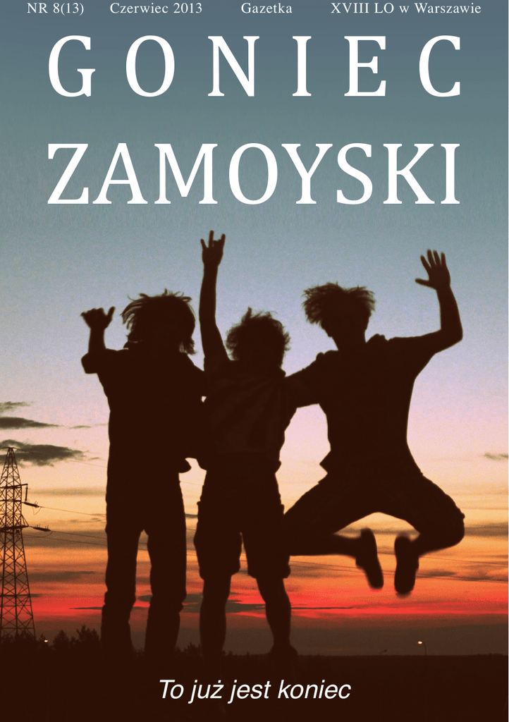 NR 8(13) Czerwiec 2013 Gazetka XVIII LO w Warszawie GONIEC ZAMOYSKI To już jest koniec W numerze: Spis treści: 3. To już jest koniec 4. Mijający rok 5. Skrzypienie władzy 7. Cudze chwalicie, swego nie znacie 9. Co robić, by nic nie-nie robić 11. Alpejska podróż 12. Czarnobyl - Nowa atrakcja turystyczna 14. Recenzja filmu “Iron Man 3” 16. Rutyna - opowiadanie 19. Twórczość 20. Złote usta Skład redakcji: Redaktor naczelny: Mateusz Kuchta Zastępca redaktora: Monika Oppeln-Bronikowska Autorzy: Weronika Pisula, Mateusz Kuchta, Małgosia Watras, Daniel Klimowicz, Robert Bengsz, Jakub Drożdż, Jacek Wiśniewski Oprawa graficzna: Grzegorz Adach Redakcja pod opieką p. prof. Małgorzaty Mroczkowskiej GONIEC ZAMOYSKI CZERWIEC 2013 To już jest koniec To już jest koniec Nie ma już nic Jesteśmy wolni Możemy iść Tekst tej piosenki Elektrycznych Gitar już niedługo być może wybrzmi na ustach niektórych Zamoyszczaków. Mimo, że ta piosenka nie ma nic wspólnego z zakończeniem roku szkolnego, to jednak świetnie się na tę okazję nadaje. To już jest koniec sprawdzianów, kartkówek, odpowiedzi i prac domowych. Nie ma już konieczności wstawania codziennie rano, ciągłej nauki, siedzenia i słuchania po osiem godzin dziennie. Jesteśmy wolni od szkoły, codziennego, powtarzalnego i dość męczącego rytuału. Możemy iść. Dokąd? Przed siebie, gdzie dusza zapragnie, z kim chcemy. Taki jest urok wakacji. Wolność i spokój. Życzę więc wszystkim miłej wolności i do zobaczenia po wakacjach. To już jest koniec. Nie ma już nic. Jesteśmy wolni. Możemy iść. M.K. Mijający rok Rok szkolny 2012/2013 powoli dobiega końca. Każda rzecz ma swój określony czas, swoje miejsce. Wszystko się kiedyś zaczyna i kończy. Dla mnie kończy się pierwszy rok w Zamoyskim. Nie mogę się zgodzić, że był to łatwy rok, ale prawdą nie jest także, że był on niesamowicie trudny. Szkoła zmieniła wszystko, cały styl mojego życia. Zaczynając od wcześniejszego wstawania, poprzez późniejszy powrót do domu. Wielu rzeczy trzeba było sobie odmówić, wielu spotkań ze znajomymi, filmów czy książek na rzecz nauki do bardzo późnych godzin nocnych. Nocy przy szkolnych książkach z kilkoma (2-4) godzinami snu nawet nie liczę, bo byłoby to bezsensowną czynnością. O wiele łatwiej jest policzyć te całkowicie przespane. Idąc do Zamoyskiego na jednym z forów dotyczących liceów przeczytałam, że jedną z wad szkoły jest brak ciekawych ludzi. Nie wiem, może mój światopogląd jest zbyt ogólny, ale nie spotkałam tutaj ani jednej nudnej osoby. Wręcz przeciwnie, każdy kogo poznaję jest niesamowitą indywidualnością, osobą niezwykłą, o nieprzeciętnych zainteresowaniach. To właśnie tutaj poznałam najciekawsze osoby. Może to nie był łatwy rok, z ogromną ilością odpoczynku. Ale mimo to cieszę się, że wybrałam tę szkołę. I wiem jedno, że dzięki niej napiszę maturę najlepiej, jak umiem. Więc chyba warto przeżyć tak jeszcze dwa lata. GONIEC ZAMOYSKI CZERWIEC 2013 Weronika Pisula Skrzypienie Minęło już pięć miesięcy od czasu, gdy w styczniu został wybrany nowy skład Prezydium Samorządu Uczniowskiego. Symboliczną władzę w szkole objął Krzysiek Nowicki wraz z zastępcami - Antonim Żukowski oraz Agnieszką Nitek. Obiecywali wiele, ale co z tego się spełniło? Mając w pamięci pracę Samorządu pod przewodnictwem Filipa Dymitrowskiego, można odnieść wrażenie, że teraz nic się w Zamoyskim nie dzieje. Taką też opinię można najczęściej usłyszeć wśród uczniów. Sam przewodniczący przyznaje, że faktycznie trudno jest się obecnie pochwalić jakimiś osiągnięciami, jednak czerwiec ma być miesiącem władzy przełomowym. Twierdzi jednak, że ,,ciężko coś zrobić w interakcji z uczniami, gdyż większość z nich wpada na Smolną, by odpracować to, do czego oświata nawołuje’’. Podkreśla bardzo dobrą współpracę i komunikację z Agnieszką Nitek oraz brak jakiegokolwiek wkładu Antoniego Żukowskiego w pracę. Wiceprzewodniczący twierdzi natomiast, że współpraca jest niemożliwa, ponieważ „przewodnictwo opiera się na wyznaczaniu zadań brzmiących tak enigmatycznie jak: <<trzeba coś zrobić>>”. Zarzuca również brak jasno wyznaczonych celów i komunikacji. Najpełniejsza jest wypowiedź jedynej przedstawicielki klas pierwszych w samorządzie, Agnieszki Nitek: „Z Krzyśkiem i Antonim ustalamy wszystkie działania samorządu, nie ma między nami nieporozumień, jestem z naszej współpracy bardzo zadowolona. Dziwią mnie niektórzy uczniowie zarzucający nam brak jakiegokolwiek działania. Inicjatyw, konkursów itp. było w tym semestrze naprawdę dużo, a chętnych jak na lekarstwo. Konkurs piosenki obcojęzycznej, konkurs fotograficzny i literacki. Czekam, aż wzrośnie zainteresowanie takimi imprezami, bo bez aktywności wszystkich uczniów nasze działanie nie ma sensu. Na szczęście są też osoby, które bardzo aktywnie uczestniczą w życiu szkoły i bardzo im za to dziękuję. W najbliższym czasie, oczywiście po zakończeniu matur, czeka nas kilka fajnych inicjatyw, które na pewno zadowolą wszystkich Zamoyszczaków.” Z powyższej wypowiedzi wypływają dwa wnioski. Po pierwsze brak porozumienia jest tylko na linii Nowicki-Żukowski. Po drugie, jednym z największych problemów w pracy samorządu jest brak aktywności uczniów w organizowanych konkursach i imprezach, co sprawia wrażenie, że w Zamoyskim nic się nie dzieje. Nie da się co prawda ukryć, że poziom rozreklamowania akcji Samorządu jest bardzo niski, nieliczne i niezbyt zwracające uwagę ogłoszenia w słabo wyeksponowanych miejscach utrudniają dowiedzenie się o istnieniu różnych ciekawych inicjatyw. Jednak musi się zmienić zarówno mentalność uczniów Zamoya, jak i stopień współpracy członków PSU, jeśli chcemy ujrzeć efekty. We wrześniu planowany jest festiwal MROK, będzie również dr