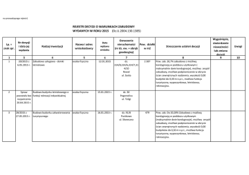rganu prowadzącego rejestr) REJESTR DECYZJI O WARUNKACH ZABUDOWY WYDANYCH W ROKU 2015 (Dz.U.2004.130.1385) Lp. = znak spr. Nr decyzji i data jej wydania Rodzaj inwestycji Nazwa i adres wnioskodawcy 1 3 4 5 1 20/2015 z Zabudowa usługowa - domki 6.05.2015 r. letniskowe Data wpływu wniosku osoba fizyczna 6 12.01.2015 Oznaczenie nieruchomości Pow. działki w m2 (nr dz. ew. + obręb geodezyjny) 7 dz. 314/8,314/6,314/7,31 4/10 Rewal ul. Saska 2 Spraw Budowa budynku letniskowego o pozostała bez funkcji rekreacji indywidualnej rozpatrzenia 20.04.2015 r. osoba fizyczna 15.01.2015 r. dz. 30 Pogorzelica ul. Teligi 3 28/2015 z Budowa budynku zakwaterowania osoba fizyczna 27.05.2015 r. turystycznego 16.01.2015 r. dz. 91/8 Pustkowo ul. Słoneczna Streszczenie ustaleń decyzji 8 2 387 Pow. zab. 20,7% zabudowa z możliwą kondygnacją w poddaszu użytkowym ( maksymalnie dwie kondygnacje), możliwy zespół zabudowy, możliwe podpiwniczenie w obrysie ścian zewnętrznych nadziemia, wysokość 0,00 budynkó do 0,30 m n.p.t., możliwa funkcja turystyczna, wypoczynkowa, letniskowa, rekreacyjna. 479 Pow. zab. Do 20,28% Zabudowa z możliwą kondygnacją w poddaszu użytkowym (maksymalnie dwie kondygnacje), możliwy zespół zabudowy, możliwe podpiwniczenie w obrysie ścian zewnętrznych nadziemia, wysokość 0,00 budynków do 0,30 m n.p.t., możliwa funkcja turystyczna, wypoczynkowa, letniskowa, rekreacyjna. Wygaśnięcie, stwierdzenie nieważności lub zmiana decyzji 9 Uwagi 10 4 22/2015 z Zespół budynków zakwaterowania osoba fizyczna 6.05.2015 r. turystycznego 16.01.2015 r. dz. 216, 244/15 Pogorzelica ul. Plażowa 1400 5 odmowa z Zabudowa mieszkaniowa osoba fizyczna dnia jednorodzinna z garażem, studnia 22.04.2015 r. wierconą, biologiczną oczyszczalnią ścieków 20.01.2015 r. dz. 123/5 Pustkowo 881 6 29/2015 z Domki rekreacyjne 27.05.2015 r. 27.01.2015 r. dz. 81 Pustkowo ul. Spacerowa osoba fizyczna Pow. zab. Do 21,63% Zabudowa z możliwą kondygnacją w poddaszu użytkowym (maksymalnie dwie kondygnacje), możliwy zespół zabudowy, możliwe podpiwniczenie w obrysie ścian zewnętrznych nadziemia, wysokość 0,00 budynków do 0,30 m n.p.t., możliwa funkcja turystyczna, wypoczynkowa, letniskowa, rekreacyjna. Pow. zab. Do 20,13% Zabudowa z możliwą kondygnacją w poddaszu użytkowym (maksymalnie dwie kondygnacje), możliwy zespół zabudowy, możliwe podpiwniczenie w obrysie ścian zewnętrznych nadziemia, wysokość 0,00 budynków do 0,30 m n.p.t., możliwa funkcja turystyczna, wypoczynkowa, letniskowa, rekreacyjna. 7 30/2015 Z Budynek pensjonatowy 27052015 R. osoba fizyczna 02.02.2015 r. dz. 419/10 Rewal ul. Piastowska Pow. zab. Do 19,73 %. Zabudowa z możliwą kondygnacją w poddaszu użytkowym (maksymalnie dwie kondygnacje), mozliwe dominanty architektoniczne na 30% powierzchni zabudowy o wysokosci do 3,00 m możliwy zespół zabudowy, możliwe podpiwniczenie w obrysie ścian zewnętrznych nadziemia, wysokość 0,00 budynków do 0,30 m n.p.t., możliwa funkcja turystyczna, wypoczynkowa, letniskowa, rekreacyjna, możliwa funkcja mieszkalna o powierzchni do 150 m2, możliwa zabudowa na granicy działki nr 419/6 w pasie o głebokosci minimum 3,00 m z wysokością i szerokościa nie wiekszą niż gabaryty istniejącej lub projektowanej zabudowy graniczącej 8 31/2015 z Budynki mieszkalny jednorodzinny i osoba fizyczna 27.05.2015 r. zakwaterowania turystycznego 9.02.2015 r. dz. 325/5 Rewal ul. Saska Pow. zab. Do 20,70 % Zabudowa z możliwą kondygnacją w poddaszu użytkowym (maksymalnie dwie kondygnacje), możliwy zespół zabudowy, możliwe podpiwniczenie w obrysie ścian zewnętrznych nadziemia, wysokość 0,00 budynków do 0,30 m n.p.t., możliwa funkcja turystyczna, wypoczynkowa, letniskowa, rekreacyjna, funkcja mieszkalna ograniczona do powierzchni 160 m2. 9 23/2015 z Budynki letniskowe 6.05.2015 r. zakwaterowania turystycznego 9.02.2015 r. dz. 440/6,440/7,440/8 Rewal ul. Lipowa osoba fizyczna 4402 Pow. zab. Do 19,22 % Zabudowa z możliwą kondygnacją w poddaszu użytkowym(maksymalnie dwie kondygnacje), możliwy zespół zabudowy, możliwe podpiwniczenie w obrysie ścian zewnętrznych nadziemia, wysokość 0,00 budynków do 0,30 m n.p.t. Możliwa funkcja turystyczna, wypoczynkowa, letniskowa, rekreacyjna. 10 32/2015 Budynek handlowy usługowy 27.05.2015 r. osoba fizyczna 10.02.2015 r. dz. 267 Pogorzelica ul. Wojska Polskiego Pow. zab. Do 11,66% wraz z zabudową na tej działce. Zabudowa z możliwą kondygnacją w poddaszu użytkowym (maksymalnie dwie kondygnacje), możliwy zespół zabudowy, możliwe podpiwniczenie w obrysie ścian zewnętrznych nadziemia, wysokość 0,00 budynków do 0,30 m n.p.t., funkcja handlowa o powierzchni 400 m2, nie przewiduje się stosowania urządzeń nagłaśniających 11 33/2015 z Budynek turystyczny 27.05.2015 r. osoba fizyczna 20.02.2015 r. dz. 80/4 Pogorzelica ul. Leśników 3 Pow. zab. Do 23,86% wraz z zabudową na tej działce Zabudowa z możliwą kondygnacją w poddaszu użytkowym (maksymalnie trzy kondygnacje), w lokalach możliwe antresole na powierzchni do 20 % powierzchni parteru, możliwy zespół zabudowy, możliwe podpiwniczenie w obrysie ścian zewnętrznych nadziemia, wysokość 0,00 budynków do 0,30 m n.p.t. lub istniejąca, możliwa funkcja turystyczna, wypoczynkowa, letniskowa, zakwaterowania turystycznego. osoba fizyczna 24.02.2015 r. 12 18/2015 Budowa drewnianych domków letniskowych dz. 83/27 Rewal 1 344 Rewal 72- pow. zab. Do 18/64%. Zabudowa z możliwą kondygnacją w poddaszu użytkowym (maksymalnie dwie kondygnacje), możliwy zespół zabudowy, możliwe podpiwniczenie w obrysie ścian zewnętrznych nadziemia, wysokość 0,00 budynków do 0,30 m n.p.t. Możliwa funkcja turystyczna, wypoczynkowa, letniskowa, rekreacyjna, możliwa zabudowa w odleglości 1,50 m od strony działek 83/28 i 83/30. 13 14 37/15 06.07.2015 Remont i rozbudowa budynku usługowego z lokalem mieszkalnym, budowa domków letniskowych osoba fizyczna 34/2015 z Przebud