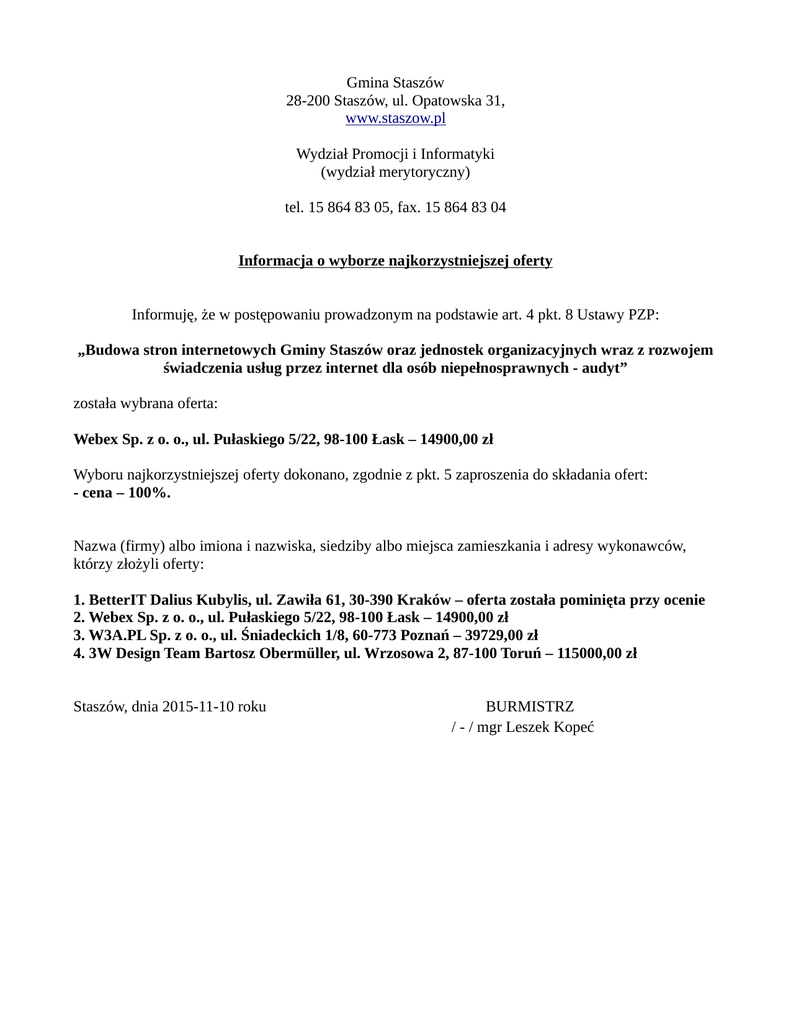 Gmina Staszów 28-200 Staszów, ul. Opatowska 31, www.staszow.pl Wydział Promocji i Informatyki (wydział merytoryczny) tel. 15 864 83 05, fax. 15 864 83 04 Informacja o wyborze najkorzystniejszej oferty Informuję, że w postępowaniu prowadzonym na podstawie art. 4 pkt. 8 Ustawy PZP: „Budowa stron internetowych Gminy Staszów oraz jednostek organizacyjnych wraz z rozwojem świadczenia usług przez internet dla osób niepełnosprawnych - audyt” została wybrana oferta: Webex Sp. z o. o., ul. Pułaskiego 5/22, 98-100 Łask – 14900,00 zł Wyboru najkorzystniejszej oferty dokonano, zgodnie z pkt. 5 zaproszenia do składania ofert: - cena – 100%. Nazwa (firmy) albo imiona i nazwiska, siedziby albo miejsca zamieszkania i adresy wykonawców, którzy złożyli oferty: 1. BetterIT Dalius Kubylis, ul. Zawiła 61, 30-390 Kraków – oferta została pominięta przy ocenie 2. Webex Sp. z o. o., ul. Pułaskiego 5/22, 98-100 Łask – 14900,00 zł 3. W3A.PL Sp. z o. o., ul. Śniadeckich 1/8, 60-773 Poznań – 39729,00 zł 4. 3W Design Team Bartosz Obermüller, ul. Wrzosowa 2, 87-100 Toruń – 115000,00 zł Staszów, dnia 2015-11-10 roku BURMISTRZ / - / mgr Leszek Kopeć