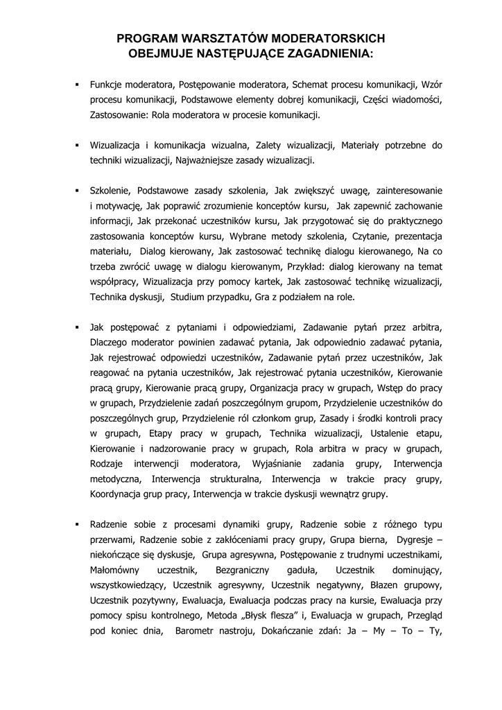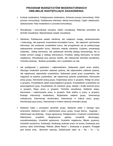 PROGRAM WARSZTATÓW MODERATORSKICH OBEJMUJE NASTĘPUJĄCE ZAGADNIENIA: Funkcje moderatora, Postępowanie moderatora, Schemat procesu komunikacji, Wzór procesu komunikacji, Podstawowe elementy dobrej komunikacji, Części wiadomości, Zastosowanie: Rola moderatora w procesie komunikacji. Wizualizacja i komunikacja wizualna, Zalety wizualizacji, Materiały potrzebne do techniki wizualizacji, Najważniejsze zasady wizualizacji. Szkolenie, Podstawowe zasady szkolenia, Jak zwiększyć uwagę, zainteresowanie i motywację, Jak poprawić zrozumienie konceptów kursu, Jak zapewnić zachowanie informacji, Jak przekonać uczestników kursu, Jak przygotować się do praktycznego zastosowania konceptów kursu, Wybrane metody szkolenia, Czytanie, prezentacja materiału, Dialog kierowany, Jak zastosować technikę dialogu kierowanego, Na co trzeba zwrócić uwagę w dialogu kierowanym, Przykład: dialog kierowany na temat współpracy, Wizualizacja przy pomocy kartek, Jak zastosować technikę wizualizacji, Technika dyskusji, Studium przypadku, Gra z podziałem na role. Jak postępować z pytaniami i odpowiedziami, Zadawanie pytań przez arbitra, Dlaczego moderator powinien zadawać pytania, Jak odpowiednio zadawać pytania, Jak rejestrować odpowiedzi uczestników, Zadawanie pytań przez uczestników, Jak reagować na pytania uczestników, Jak rejestrować pytania uczestników, Kierowanie pracą grupy, Kierowanie pracą grupy, Organizacja pracy w grupach, Wstęp do pracy w grupach, Przydzielenie zadań poszczególnym grupom, Przydzielenie uczestników do poszczególnych grup, Przydzielenie ról członkom grup, Zasady i środki kontroli pracy w grupach, Etapy pracy w grupach, Technika wizualizacji, Ustalenie etapu, Kierowanie i nadzorowanie pracy w grupach, Rola arbitra w pracy w grupach, Rodzaje interwencji metodyczna, moderatora, Interwencja Wyjaśnianie strukturalna, zadania Interwencja w grupy, trakcie Interwencja pracy grupy, Koordynacja grup pracy, Interwencja w trakcie dyskusji wewnątrz grupy. Radzenie sobie z procesami dynamiki grupy, Radzenie sobie z różnego typu przerwami, Radzenie sobie z zakłóceniami pracy grupy, Grupa bierna, Dygresje – niekończące się dyskusje, Grupa agresywna, Postępowanie z trudnymi uczestnikami, Małomówny uczestnik, Bezgraniczny gaduła, Uczestnik dominujący, wszystkowiedzący, Uczestnik agresywny, Uczestnik negatywny, Błazen grupowy, Uczestnik pozytywny, Ewaluacja, Ewaluacja podczas pracy na kursie, Ewaluacja przy pomocy spisu kontrolnego, Metoda „Błysk flesza” i, Ewaluacja w grupach, Przegląd pod koniec dnia, Barometr nastroju, Dokańczanie zdań: Ja – My – To – Ty, Codzienna ocena, Ocena seminarium, Wizualizacja przy pomocy kart: Zachowaj – Wymień – Odrzuć, Formy ewaluacji. Karty Flipcharts wprowadzające do podstawowego kursu ZOPP. Materiały do nauki indywidualnej. Analiza uczestnictwa, Funkcje analizy uczestnictwa, Prowadzenie analizy uczestnictwa, Praktyczne instrukcje dotyczące problemu analizy, Zgodność odnośnie głównego problemu, Spis kontrolny ewaluacji problemu, Matryca logiczna projektu, PPM – Przykład lektury z wizualizacją, Spis kontrolny: Streszczenie celów/ czynności, Spis kontrolny: Założenia, Spis kontrolny: Wskazówki. Szkolenie/instruktaż z przygotowanymi flipcharts, Szkolenie w dialogu kierowanym, Kierowanie pracą grup, Kierowanie dynamiką grupy, Zadawanie pytań przez moderatora, Technika kartek (wizualizacja), Dialog kierowany. Metoda Aktywnego Planowania Strategicznego (MAPS) . - Wprowadzenie do sposobów konstruowania projektów z wykorzystaniem MAPS. - Budowanie struktury problemów oraz struktury współzależności celów (definiowanie), konstruowanie matrycy logicznej projektu na podstawie rezultatów analizy problemów i analizy celów oraz tworzenie harmonogramu działań. - Własne konstrukcje matrycy logicznej projektu. - Zasady tworzenia budżetów projektów, powiązanie budżetu z celami projektu/programu, powiązanie budżetu z harmonogramem działań. - Własne konstrukcje budżetów i harmonogramów działań. - Ćwiczenia w grupach roboczych. - Prezentacja i wspólna analiza wyników pracy grup roboczych.