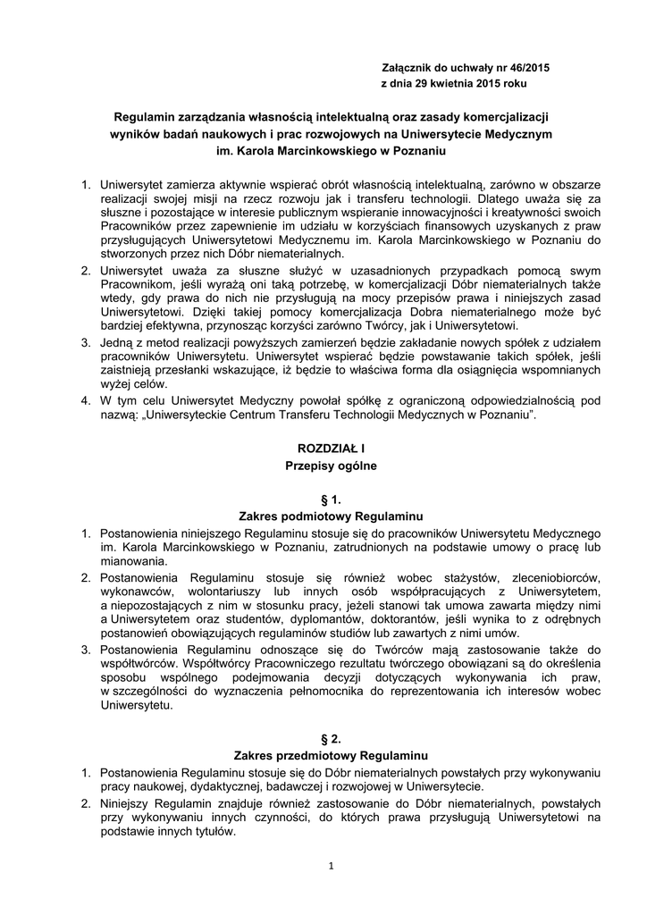 Załącznik do uchwały nr 46/2015 z dnia 29 kwietnia 2015 roku Regulamin zarządzania własnością intelektualną oraz zasady komercjalizacji wyników badań naukowych i prac rozwojowych na Uniwersytecie Medycznym im. Karola Marcinkowskiego w Poznaniu 1. Uniwersytet zamierza aktywnie wspierać obrót własnością intelektualną, zarówno w obszarze realizacji swojej misji na rzecz rozwoju jak i transferu technologii. Dlatego uważa się za słuszne i pozostające w interesie publicznym wspieranie innowacyjności i kreatywności swoich Pracowników przez zapewnienie im udziału w korzyściach finansowych uzyskanych z praw przysługujących Uniwersytetowi Medycznemu im. Karola Marcinkowskiego w Poznaniu do stworzonych przez nich Dóbr niematerialnych. 2. Uniwersytet uważa za słuszne służyć w uzasadnionych przypadkach pomocą swym Pracownikom, jeśli wyrażą oni taką potrzebę, w komercjalizacji Dóbr niematerialnych także wtedy, gdy prawa do nich nie przysługują na mocy przepisów prawa i niniejszych zasad Uniwersytetowi. Dzięki takiej pomocy komercjalizacja Dobra niematerialnego może być bardziej efektywna, przynosząc korzyści zarówno Twórcy, jak i Uniwersytetowi. 3. Jedną z metod realizacji powyższych zamierzeń będzie zakładanie nowych spółek z udziałem pracowników Uniwersytetu. Uniwersytet wspierać będzie powstawanie takich spółek, jeśli zaistnieją przesłanki wskazujące, iż będzie to właściwa forma dla osiągnięcia wspomnianych wyżej celów. 4. W tym celu Uniwersytet Medyczny powołał spółkę z ograniczoną odpowiedzialnością pod nazwą: „Uniwersyteckie Centrum Transferu Technologii Medycznych w Poznaniu”. ROZDZIAŁ I Przepisy ogólne § 1. Zakres podmiotowy Regulaminu 1. Postanowienia niniejszego Regulaminu stosuje się do pracowników Uniwersytetu Medycznego im. Karola Marcinkowskiego w Poznaniu, zatrudnionych na podstawie umowy o pracę lub mianowania. 2. Postanowienia Regulaminu stosuje się również wobec stażystów, zleceniobiorców, wykonawców, wolontariuszy lub innych osób współpracujących z Uniwersytetem, a niepozostających z nim w stosunku pracy, jeżeli stanowi tak umowa zawarta między nimi a Uniwersytetem oraz studentów, dyplomantów, doktorantów, jeśli wynika to z odrębnych postanowień obowiązujących regulaminów studiów lub zawartych z nimi umów. 3. Postanowienia Regulaminu odnoszące się do Twórców mają zastosowanie także do współtwórców. Współtwórcy Pracowniczego rezultatu twórczego obowiązani są do określenia sposobu wspólnego podejmowania decyzji dotyczących wykonywania ich praw, w szczególności do wyznaczenia pełnomocnika do reprezentowania ich interesów wobec Uniwersytetu. § 2. Zakres przedmiotowy Regulaminu 1. Postanowienia Regulaminu stosuje się do Dóbr niematerialnych powstałych przy wykonywaniu pracy naukowej, dydaktycznej, badawczej i rozwojowej w Uniwersytecie. 2. Niniejszy Regulamin znajduje również zastosowanie do Dóbr niematerialnych, powstałych przy wykonywaniu innych czynności, do których prawa przysługują Uniwersytetowi na podstawie innych tytułów. 1 § 3. Definicje użytych w Regulaminie pojęć Używane w niniejszym Regulaminie pojęcia oznaczają: 1. „Dobra niematerialne”, to: 1) „Utwory” - w rozumieniu ustawy z dnia 4 lutego 1994r. o prawie autorskim i prawach pokrewnych (t.j. Dz. U. z 2006r., nr 90, poz. 631 z późn.zm.), w tym w szczególności utwory naukowe, oraz programy komputerowe i bazy danych; 2) „Rezultat twórczy” – znaki towarowe, wynalazki, wzory użytkowe, wzory przemysłowe i topografie układów scalonych w rozumieniu ustawy z dnia 30 czerwca 2000r. Prawo własności przemysłowej (t.j. Dz. U. z 2013r., nr 1410) oraz bazy danych, chronione prawem sui generis w zakresie uregulowanym ustawą z dnia 27 lipca 2001r. o ochronie baz danych (Dz. U. z 2001r., nr 128, poz. 1402 z późn.zm.); a także wspólnotowe znaki towarowe w rozumieniu rozporządzenia Rady (WE) ne 207/2009 z dnia 26 lutego 2009r. w sprawie wspólnotowego znaku towarowego (Dz. U. UE.L z dnia 24 marca 2009r. nr 78/1); 3) inne wyniki pracy intelektualnej, w tym takie, które nie stanowią przedmiotu praw wyłącznych, jak np. metody badań, koncepcje wyjaśnienia problemu, wyniki eksperymentów, opinie, ekspertyzy, dydaktyczne materiały audiowizualne, instrukcje dydaktyczne, przewodniki do ćwiczeń, modele, prezentacje multimedialne itp.); 4) poufne informacje stanowiące tajemnicę (know-how) Uniwersytetu w rozumieniu art. 11 ustawy z dnia 16 kwietnia 1993r. o zwalczaniu nieuczciwej konkurencji (t.j. Dz. U. z 2003r., nr 153, poz. 1503 z późn.zm.). 2. Przez "Pracownicze rezultaty twórcze" oraz „Utwory pracownicze” rozumie się: 1) Dobra niematerialne powstałe w związku z wykonywaniem obowiązków wynikających ze stosunku pracy w Uniwersytecie, realizowanych w ramach tzw. pensum oraz godzin ponadwymiarowych w rozumieniu art. 130 ust. 3 i art. 131 ust. 1 Ustawy, 2) Dobra niematerialne powstałe w związku z wykonywaniem umów cywilnoprawnych innych niż umowa o pomoc, zawieranych przez pracowników z Uniwersytetem, 3) Dobra niematerialne powstałe w związku z wykonywaniem umów z podmiotami trzecimi, których Uniwersytet jest stroną, w tym również w wykonaniu przez Uniwersytet zadań finansowanych ze środków publicznych, 4) Dobra niematerialne powstałe przy pomocy Uniwersytetu, o ile w zawartej umowie o pomoc ustalono, że prawa do rezultatów twórczych oraz utworów będą przysługiwały Uniwersytetowi w całości lub części. 3. Przez „Obowiązki ze stosunku pracy” rozumie się zadania, których wykonanie należy do obowiązków Twórcy wynikających z umowy o pracę, regulaminu pracy, zakresu czynności przypisanych Twórcy lub z polecenia przełożonego, mieszczącego się w obowiązkach pracowniczych Twórcy. 4. Przez „Pomoc Uniwersytetu” rozumie się pomoc finansową, organizacyjną, materiałową, sprzętową, lokalową l