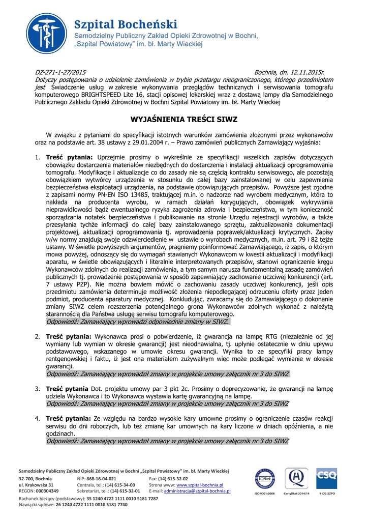 DZ-271-1-27/2015 Bochnia, dn. 12.11.2015r. Dotyczy postępowania o udzielenie zamówienia w trybie przetargu nieograniczonego, którego przedmiotem jest Świadczenie usług w zakresie wykonywania przeglądów technicznych i serwisowania tomografu komputerowego BRIGHTSPEED Lite 16, stacji opisowej lekarskiej wraz z dostawą lampy dla Samodzielnego Publicznego Zakładu Opieki Zdrowotnej w Bochni Szpital Powiatowy im. bł. Marty Wieckiej WYJAŚNIENIA TREŚCI SIWZ W związku z pytaniami do specyfikacji istotnych warunków zamówienia złoŜonymi przez wykonawców oraz na podstawie art. 38 ustawy z 29.01.2004 r. – Prawo zamówień publicznych Zamawiający wyjaśnia: 1. Treść pytania: Uprzejmie prosimy o wykreślnie ze specyfikacji wszelkich zapisów dotyczących obowiązku dostarczenia materiałów niezbędnych do dostarczenia i instalacji aktualizacji oprogramowania tomografu. Modyfikacje i aktualizacje co do zasady nie są częścią kontraktu serwisowego, ale pozostają obowiązkiem wytwórcy urządzenia w stosunku do całej bazy zainstalowanej w celu zapewnienia bezpieczeństwa eksploatacji urządzenia, na podstawie obowiązujących przepisów. PowyŜsze jest zgodne z zapisami normy PN-EN ISO 13485, traktującej m.in. o nadzorze nad wyrobem medycznym, która to nakłada na producenta wyrobu, w ramach działań korygujących, obowiązek wykrywania nieprawidłowości bądź ewentualnego ryzyka zagroŜenia zdrowia i bezpieczeństwa, w tym konieczność sporządzania notatek bezpieczeństwa i publikowanie na stronie Urzędu rejestracji wyrobów, a takŜe przesyłania tychŜe informacji do całej bazy zainstalowanego sprzętu, zaktualizowania dokumentacji projektowej, aktualizacji oprogramowania tj. wprowadzenia poprawek/aktualizacji krytycznych. Zapisy w/w normy znajdują swoje odzwierciedlenie w ustawie o wyrobach medycznych, m.in. art. 79 i 82 tejŜe ustawy. W świetle powyŜszych argumentów, pragniemy poinformować Zamawiającego, iŜ zapis, o którym mowa powyŜej, odnoszący się do wymagań stawianych Wykonawcom w kwestii aktualizacji i modyfikacji aparatu, w świetle obowiązujących i literalnie interpretowanych przepisów, stanowi ograniczenie kręgu Wykonawców zdolnych do realizacji zamówienia, a tym samym narusza fundamentalną zasadę zamówień publicznych tj. prowadzenie postępowania w sposób zapewniający zachowanie uczciwej konkurencji (art. 7 ustawy PZP). Nie moŜna bowiem mówić o zachowaniu zasady uczciwej konkurencji, jeśli opis przedmiotu zamówienia determinuje moŜliwość złoŜenia niepodlegającej odrzuceniu oferty przez jeden podmiot, producenta aparatury medycznej. Konkludując, zwracamy się do Zamawiającego o dokonanie zmiany SIWZ celem rozszerzenia potencjalnego grona Wykonawców zdolnych wykonać z naleŜytą starannością dla Państwa usługę serwisu tomografu komputerowego. Odpowiedź: Zamawiający wprowadzi odpowiednie zmiany w SIWZ. 2. Treść pytania: Wykonawca prosi o potwierdzenie, iŜ gwarancja na lampę RTG (niezaleŜnie od jej wymiany lub wymian w okresie gwarancji) jest nieodnawialna, tj. upłynie ostatecznie w dniu upływu podstawowego, wskazanego w umowie okresu gwarancji. Wynika to ze specyfiki pracy lampy rentgenowskiej i faktu, iŜ jest ona materiałem zuŜywalnym więc moŜe podlegać wymianie w okresie gwarancji. Odpowiedź: Zamawiający wprowadził zmiany w projekcie umowy załącznik nr 3 do SIWZ 3. Treść pytania Dot. projektu umowy par 3 pkt 2c. Prosimy o doprecyzowanie, Ŝe gwarancji na lampę udziela Wykonawca i to Wykonawca wystawia kartę gwarancyjną na lampę. Odpowiedź: Zamawiający wprowadził zmiany w projekcie umowy załącznik nr 3 do SIWZ 4. Treść pytania: Ze względu na bardzo wysokie kary umowne prosimy o ograniczenie czasów reakcji serwisu do dni roboczych, lub teŜ zmianę kar umownych na kary liczone w dniach opóźnienia, a nie godzinach. Odpowiedź: Zamawiający wprowadził zmiany w projekcie umowy załącznik nr 3 do SIWZ Samodzielny Publiczny Zakład Opieki Zdrowotnej w Bochni „Szpital Powiatowy” im. bł. Marty Wieckiej 32-700, Bochnia ul. Krakowska 31 REGON: 000304349 NIP: 868-16-04-021 Centrala, tel.: (14) 615-34-00 Sekretariat, tel.: (14) 615-32-01 Fax: (14) 615-32-02 Strona www: www.szpital-bochnia.pl E-mail: [email protected] Rachunek bieżący (podstawowy): 35 1240 4722 1111 0010 5181 7287 Nawiązki sądowe: 26 1240 4722 1111 0010 5181 7740 5. Treść pytania: W pkt. II.1.2) 2. SIWZ Zamawiający wymaga od Wykonawcy posiadania autoryzacji producenta lub legitymowania się certyfikatem ISO w zakresie normy EN 13485. Pragniemy zauwaŜyć, Ŝe w/w uprawnienia nie są równowaŜne, tzn. posiadanie certyfikatu ISO nie poświadcza jakości wykonywania usług serwisowych nadanej przez producenta jaką posiadają podmioty przez niego uprawnione. W związku z powyŜszym, zwracamy się z prośbą do Zamawiającego o zrezygnowanie z alternatywnego legitymowania się certyfikatem ISO w zakresie normy 13485 oraz wymaganie od Wykonawców załączenia do oferty dokumentu potwierdzającego autoryzację, wystawionego przez producenta tomografu komputerowego Brightspeed Elite 16.. Odpowiedź: Zamawiający podtrzymuje zapis z SIWZ 6. Treść pytania: Czy Zamawiający wymaga aby oferowana lampa była moŜliwa do instalacji bez modyfikacji jakiegokolwiek elementu systemu aparatu , równieŜ jego interfejsu tzn. jest wykluczona sytuacja aby po zainstalowaniu oferowanej lampy system wyświetlał jakiekolwiek ostrzeŜenia i zachowywał się w sposób inny od sytuacji kiedy w aparacie jest zainstalowana lampa oryginalna, zgodna z pierwotną konfiguracją tomografu komputerowego BrightSpeed Elite oraz jest wykluczona sytuacja aby Wykonawca zmodyfikował oprogramowanie aparatu tak aby np. takie ostrzeŜenie nie było wyświetlane?. Odpowiedź: Zamawiający podtrzymuje zapis z SIWZ 7. Treść pytania: W pkt. II.1.2) 2. SIWZ Zamawiający wymaga od Wykonawcy dysponowania osobami odpowiednio przeszkolonymi w zakresie serw