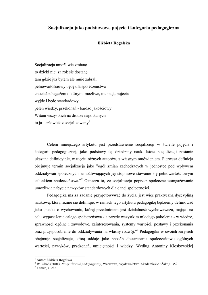 Socjalizacja jako podstawowe pojęcie i kategoria pedagogiczna Elżbieta Rogalska Socjalizacja umożliwia zmianę to dzięki niej za rok się dostanę tam gdzie już byłem ale mnie zabrali pełnowartościowy będę dla społeczeństwa chociaż z bagażem o którym, możliwe, nie mają pojęcia wyjdę i będę standardowy pełen wiedzy, przekonań - bardzo jakościowy Witam wszystkich na drodze napotkanych to ja - człowiek z socjalizowany1 Celem niniejszego artykułu jest przedstawienie socjalizacji w świetle pojęcia i kategorii pedagogicznej, jako podstawy tej dziedziny nauk. Istota socjalizacji zostanie ukazana definicyjnie, w ujęciu różnych autorów, z własnym omówieniem. Pierwsza definicja obejmuje termin socjalizacja jako ”ogół zmian zachodzących w jednostce pod wpływem oddziaływań społecznych, umożliwiających jej stopniowe stawanie się pełnowartościowym członkiem społeczeństwa.”2 Oznacza to, że socjalizacja poprzez społeczne zaangażowanie umożliwia nabycie nawyków standardowych dla danej społeczności. Pedagogika ma za zadanie przygotowywać do życia, jest więc praktyczną dyscypliną naukową, którą różnie się definiuje, w ramach tego artykułu pedagogikę będziemy definiować jako „nauka o wychowaniu, której przedmiotem jest działalność wychowawcza, mająca na celu wyposażenie całego społeczeństwa - a przede wszystkim młodego pokolenia - w wiedzę, sprawności ogólne i zawodowe, zainteresowania, systemy wartości, postawy i przekonania oraz przysposobienie do oddziaływania na własny rozwój.”3 Pedagogika w swoich zarysach obejmuje socjalizacje, którą oddaje jako sposób dostarczania społeczeństwu ogólnych wartości, nawyków, przekonań, umiejętności i wiedzy. Według Antoniny Kłoskowskiej 1 Autor: Elżbieta Rogalska W. Okoń (2001), Nowy słownik pedagogiczny, Warszawa, Wydawnictwo Akademickie "Żak",s. 359. 3 Tamże, s. 285. 2 socjalizacja to „oprócz zamierzonych wpływów wyspecjalizowanych instytucji, grup i osób, działania niezamierzone, oddziaływania urządzeń i instytucji pozornie nie mających związku z procesem kształtowania jednostki, działania społeczne, jak również wpływ materialnego aparatu kultury.”4 A. Kłoskowska dodaje do definicji socjalizacji oddziaływania niezamierzone, które bez celowego zamiaru wpływają na życie osoby. Wiliam Thomas i Florian Znaniecki dodają do definicji socjalizacji aspekt dokonania świadomej zmiany w sobie, tak by przystosować się do panujących norm i społeczeństwa jako całości5. Według Jana Szczepańskiego to „ogół procesów nabywania pod wpływem otoczenia społecznego dyspozycji psychicznych czyniących jednostkę zdolną do życia w społeczeństwie cywilizowanym… w zbiorowości, umożliwia porozumiewanie się i inteligentne działanie w jej ramach, uczy, jak się zachowywać, by osiągnąć cele życiowe.”6 J. Szczepański określa socjalizację jako przede wszystkim zmianę psychiczną, dzięki której osoba zmienia swoje zachowanie adekwatnie do panujących, w cywilizowanym świecie, norm. Według Tarzycjusza Bulińskiego to „uczenie i uczenie się kultury, które choć odbywa się w sposób świadomy lub [...] nawykowy, to jednak nikt nie czyni go przedmiotem refleksji”7 T. Buliński zwraca uwagę na brak refleksji nad uczeniem się życia. Uważa, że socjalizacja uczy kultury ale nie uczy refleksji. Podsumowując socjalizacja ma różne definicje, z każdej z tych definicji można przyjąć poszczególne tezy. Jednak zawsze socjalizacja to zmiana człowieka, zmiana w drodze ku lepszemu, ku doskonałości, ku stawaniu się przyjaznym dla siebie i otoczenia. Socjalizacja dostarcza wiedzy, umiejętności, wartości, uczy kultury, sprzyja zmianie siebie w celu przystosowania do panujących norm, czasami nieświadomie uczy jak adekwatnie zachować się w cywilizowanym świecie. Założeniem socjalizacji jest więc ulepszanie, dostosowanie, ujmowanie człowieka jako istoty społecznej do standardowych wymagań wspólnej egzystencji. Stara się osobę dostosować, jednak, jak zauważa T. Biliński, w dostosowaniu tym, często zapomina uczyć refleksji. Refleksji, a więc zastanowienia się nad istotą bycia, życia, siebie, świadomego poczucia swojego istnienia, uświadomienia po co się urodziło, że zmiany, które właśnie w sobie dokonuje są potrzebne by móc cieszyć się wolnością, może ograniczoną, ale bez krat. 4 A. Kłoskowska (1969), Z historii i socjologii kultury, PWN, Warszawa, s. 325. W. I. Thomas F. Znaniecki (1976), Chłop polski w Europie i w Ameryce, PWN, Warszawa. 6 J. Szczepański (1970), Elementarne pojęcia socjologii, PWN, Warszawa, s. 94. 7 T. Buliński (2002), Człowiek do zrobienia, Wydawnictwo UAM, Poznań. 5 Literatura: • • • • • Buliński T. (2002), Człowiek do zrobienia, Wydawnictwo UAM, Poznań. Kłoskowska A. (1969), Z historii i socjologii kultury, PWN, Warszawa. Okoń W. (2001), Nowy słownik pedagogiczny, Warszawa, Wydawnictwo Akademickie "Żak". Szczepański J. (1970), Elementarne pojęcia socjologii, PWN, Warszawa. Thomas I.W. ,Znaniecki F. (1976), Chłop polski w Europie i w Ameryce, PWN, Warszawa.
